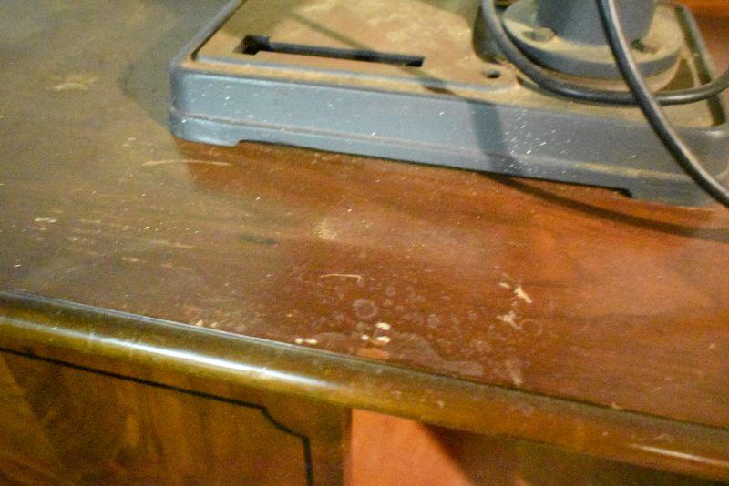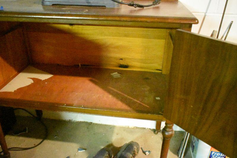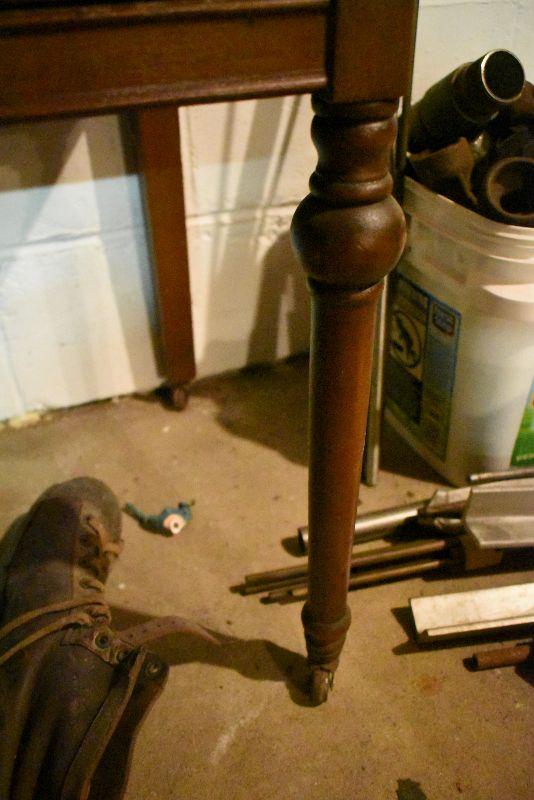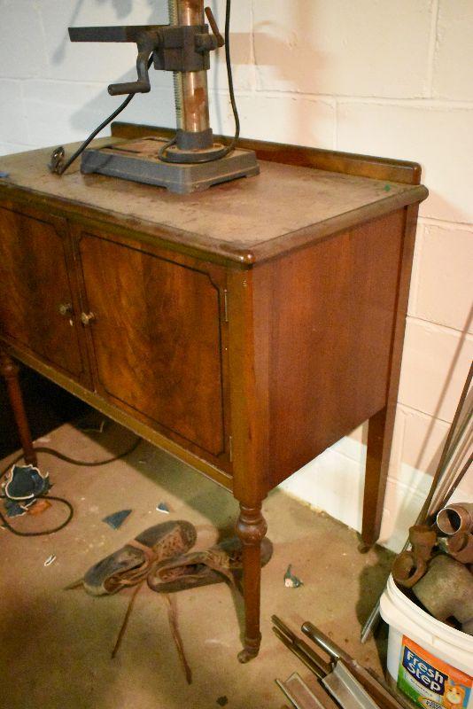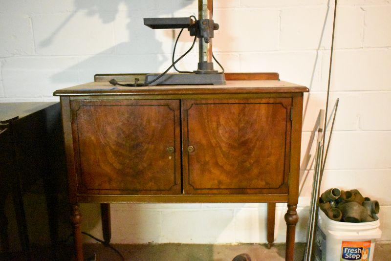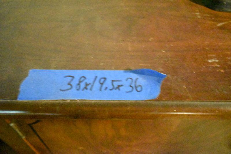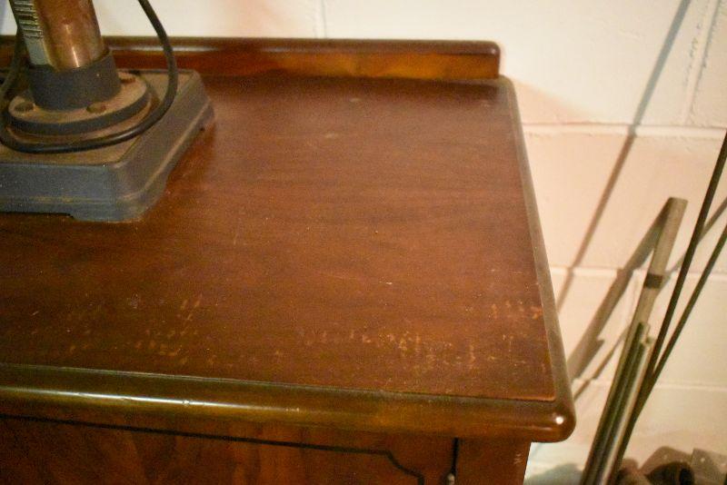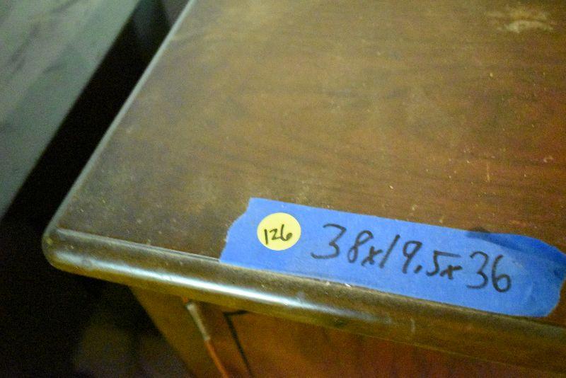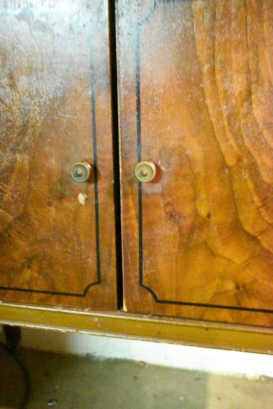 Wooden cabinet on wheels. Scratches noted, there is small chip on front. Bring help to move from basement.