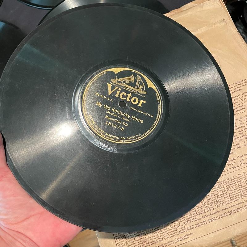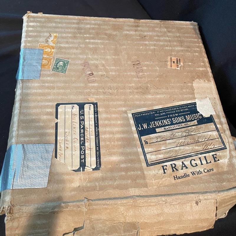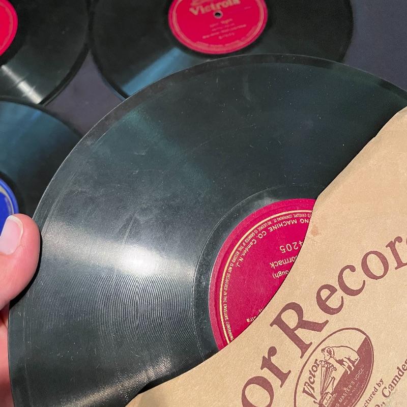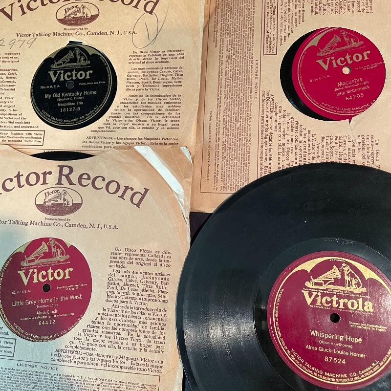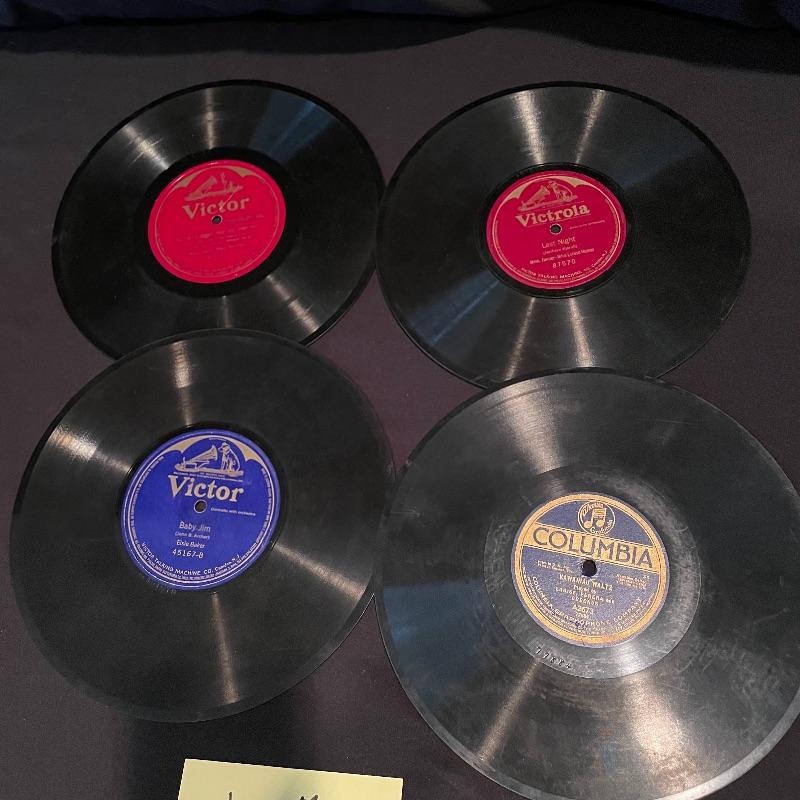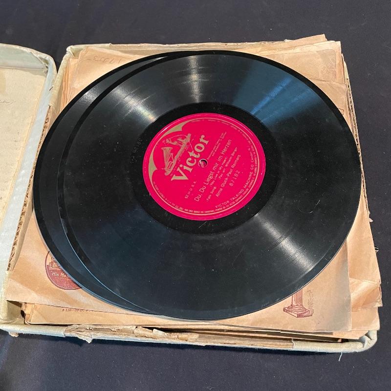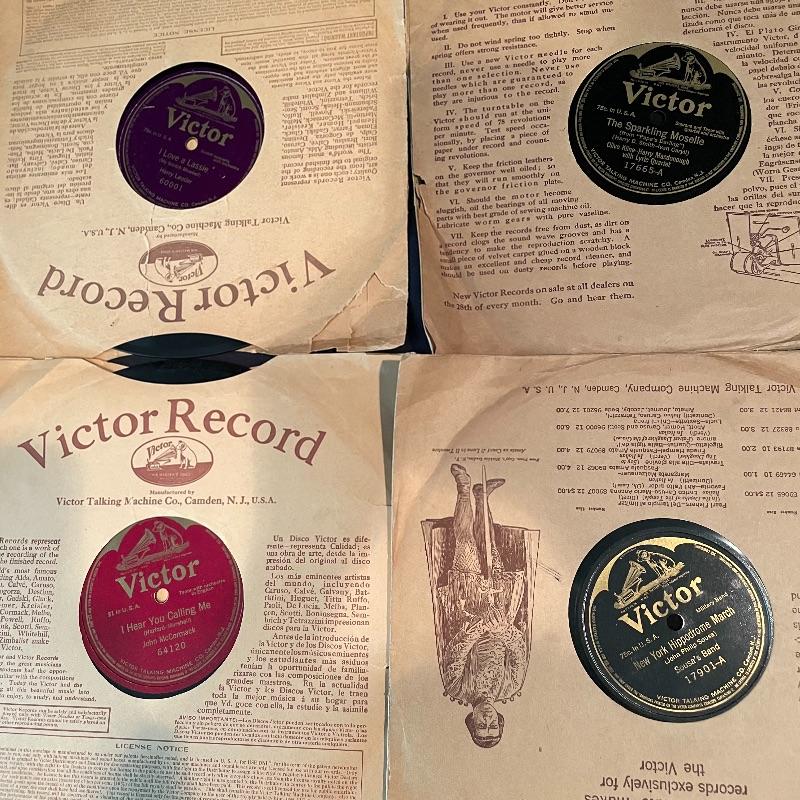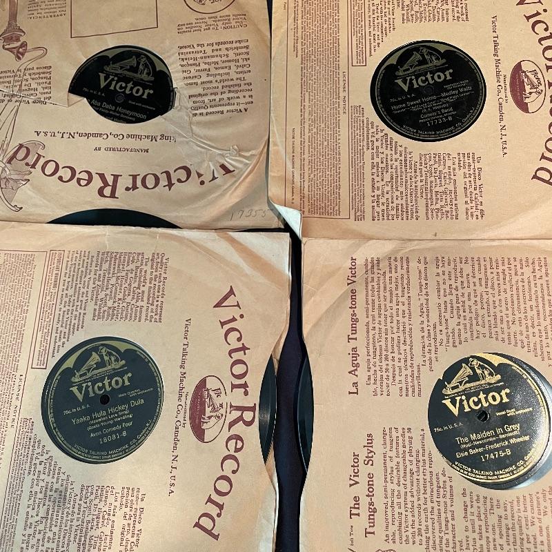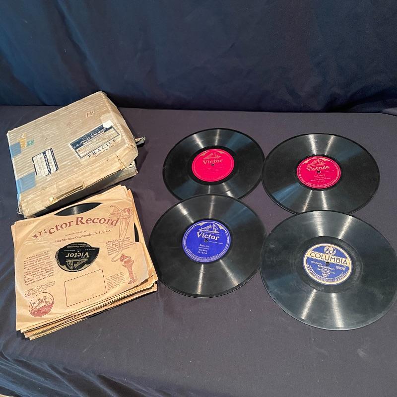 Collection of sixteen vintage vinyl 78 records. Eleven records have worn paper sleeves, but the vinyls look good. The five remaining without sleeves show more wear. Most are Victor and Victrola with one Columbia. See and zoom images for titles. The vintage postal box is also a treat from the past with a 1cent George Washington and two 10cent Ben Franklin stamps. Shipping available.