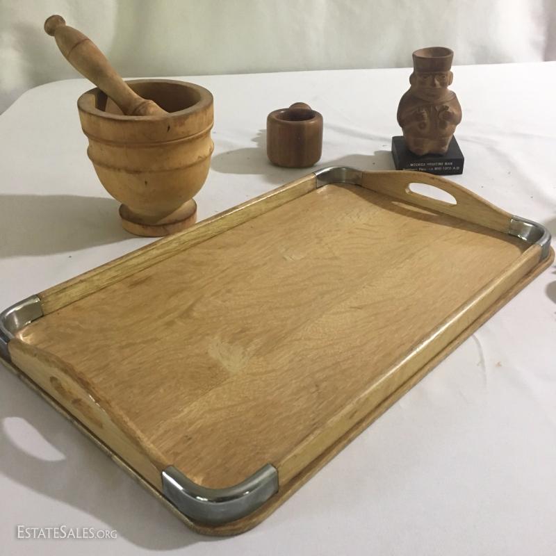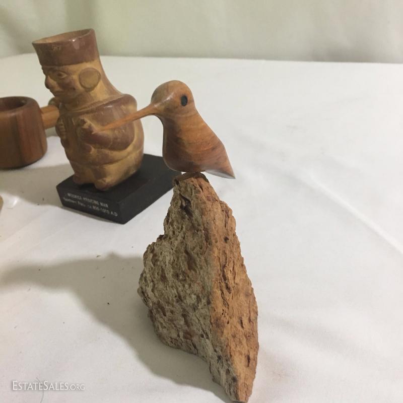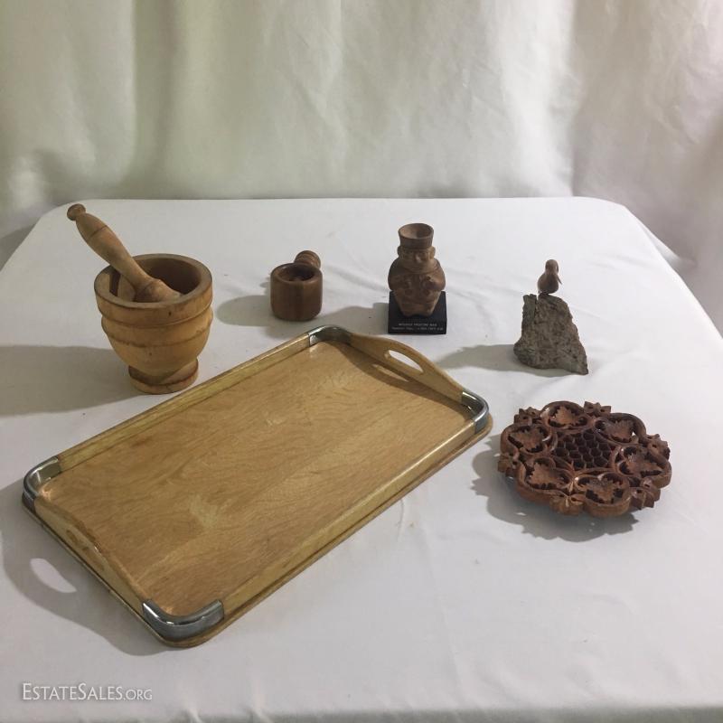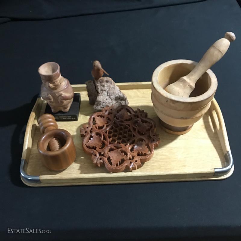 Wood tray, humming bird carving, muddler, trivit, nut cracker, and figurine that may be a different material. See photos.