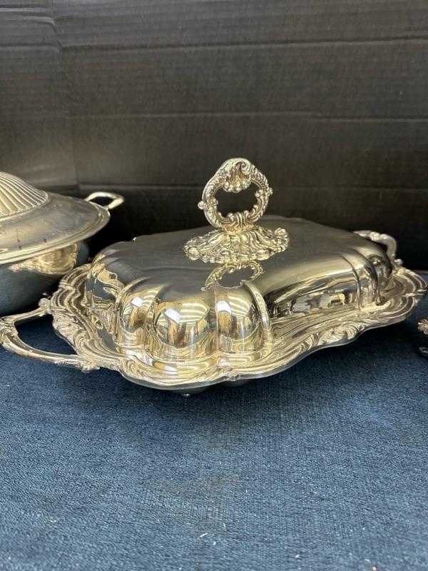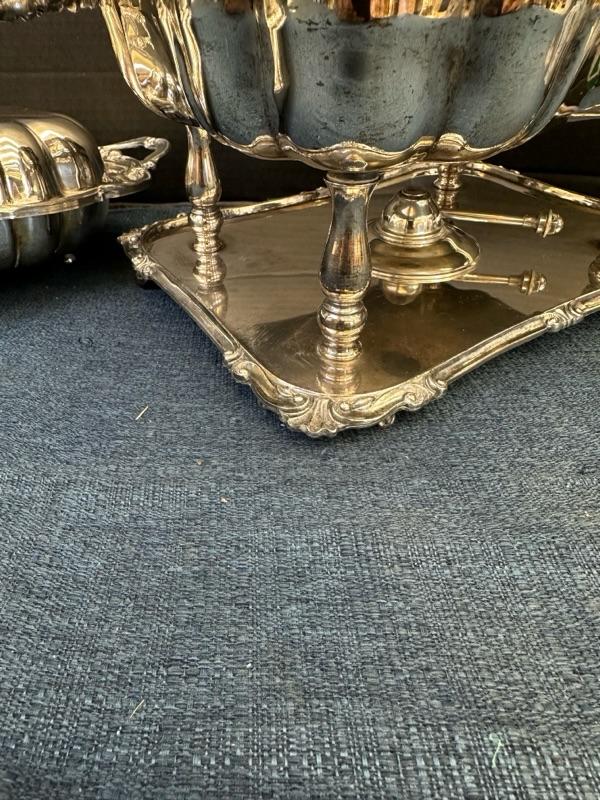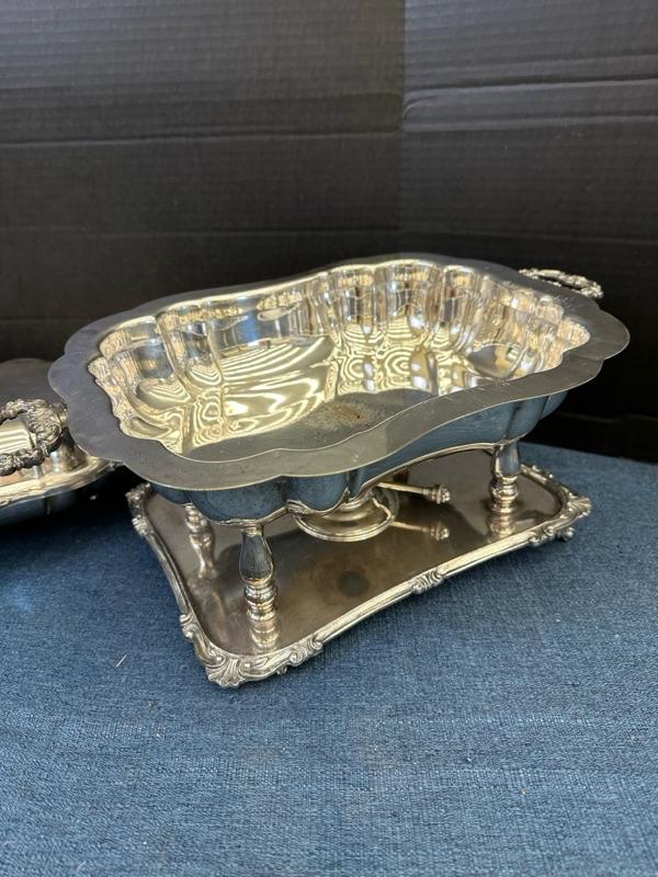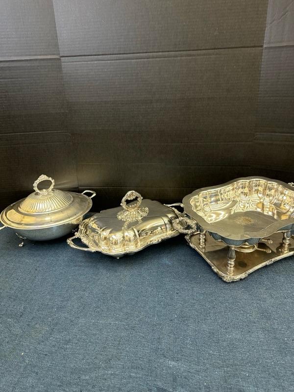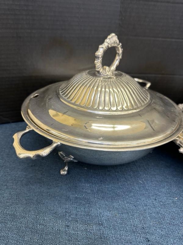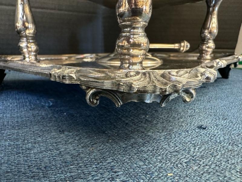 Three silver plate serving pieces food warmer has broken leg see close-up pic