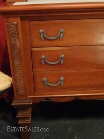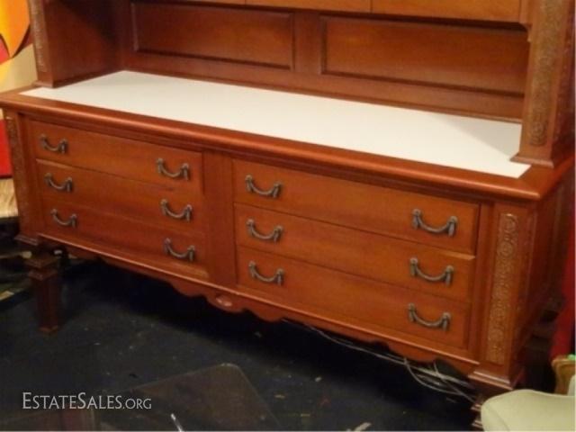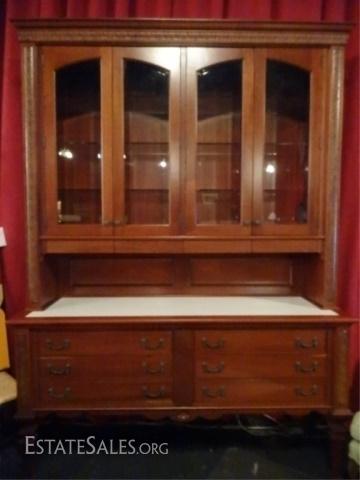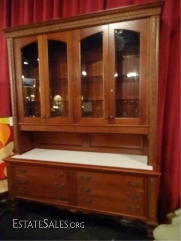 LOT 126C: LIGHTED FRENCH STYLE BREAKFRONT, HUTCH TOP, WHITE MARBLE INSET, 4 GLAZED DOORS ABOVE 6 DRAWERS, GLASS SHELVES, EXCELLENT GENTLY USED CONDITION, 99"H X 72"W X 23"D