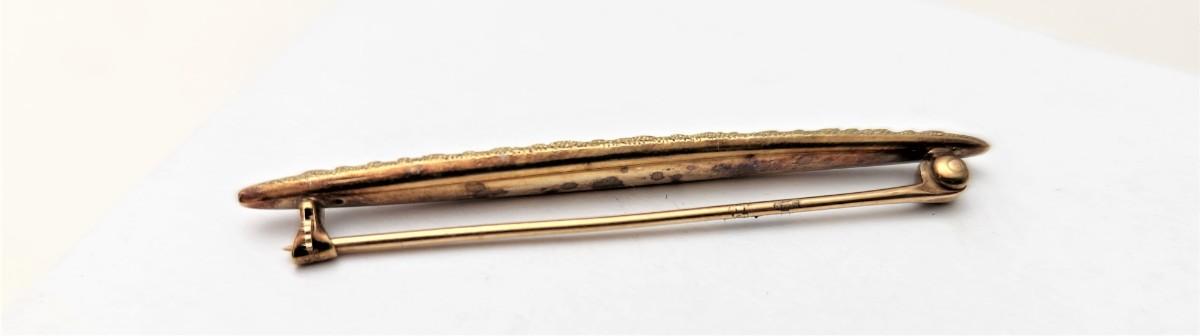 Our jeweler tested this and assured us it's 14kt gold. Antique (ca. 1900) bar pin with sweet enameled accents in a blue/white floral design. Old style clasp works fine. Measures about 2.5" long. Weighs about 2.8 grams. The opening bid is just a little above the scrap price.