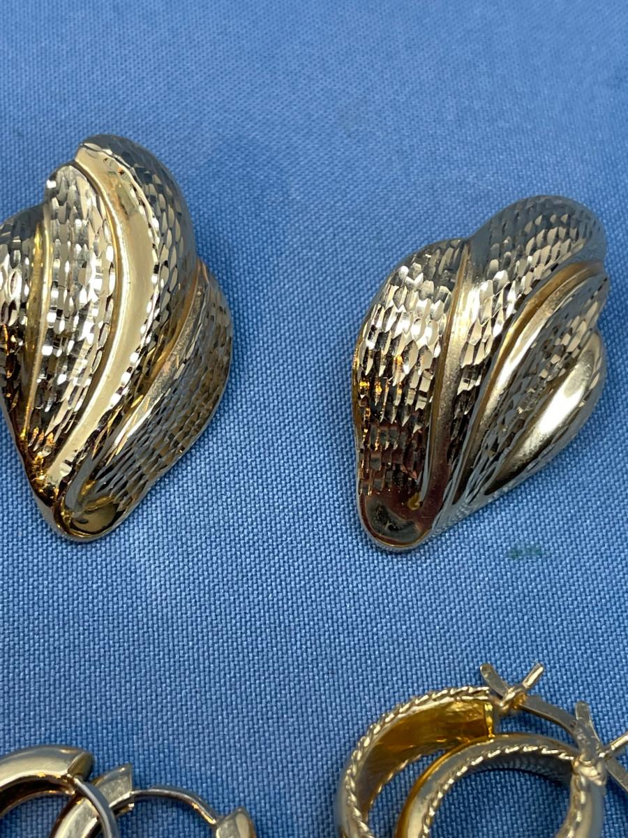 3 sets, the hoops are heavier weight. The shell looking ones are thin gold. 7.4 grams total weight.