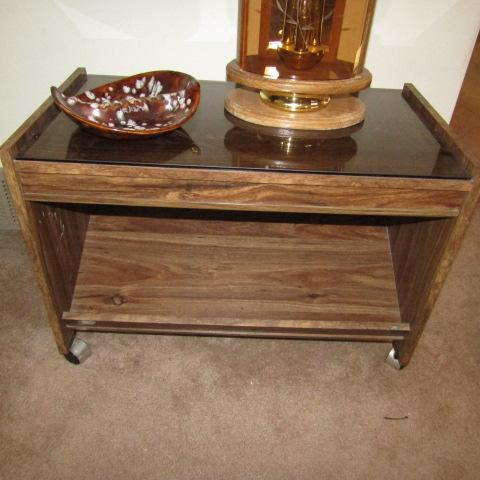 GLASS PIECE ON TOP OF CART, LOWER SHELF IS SLANTED FOR MAGAZINES OR ?