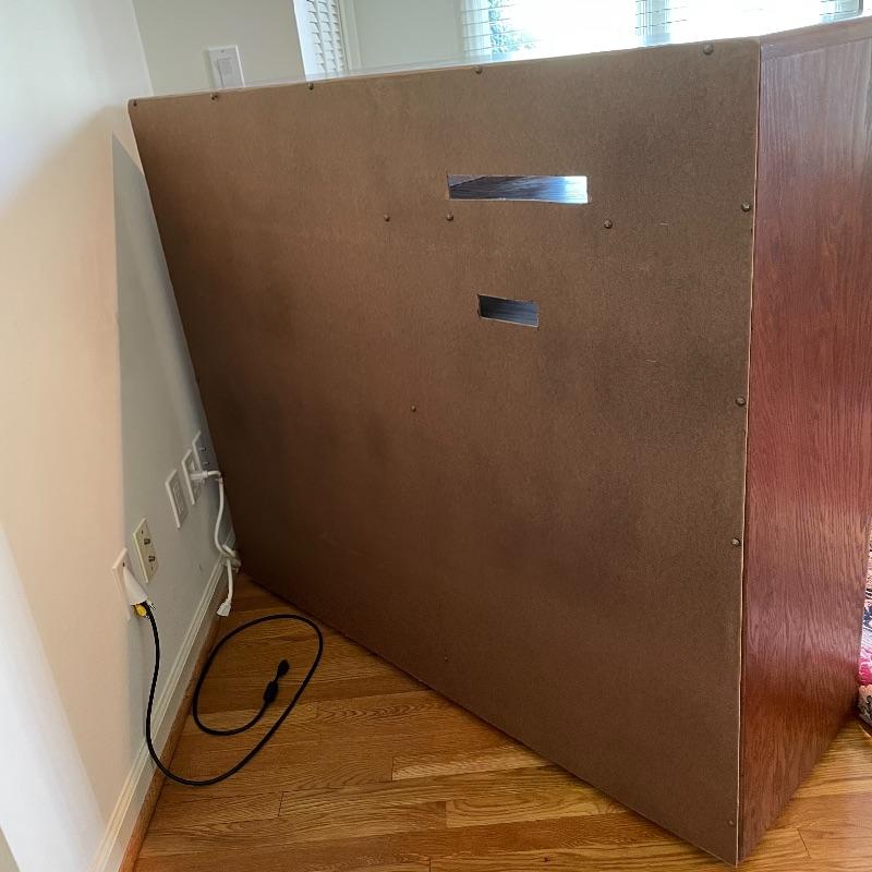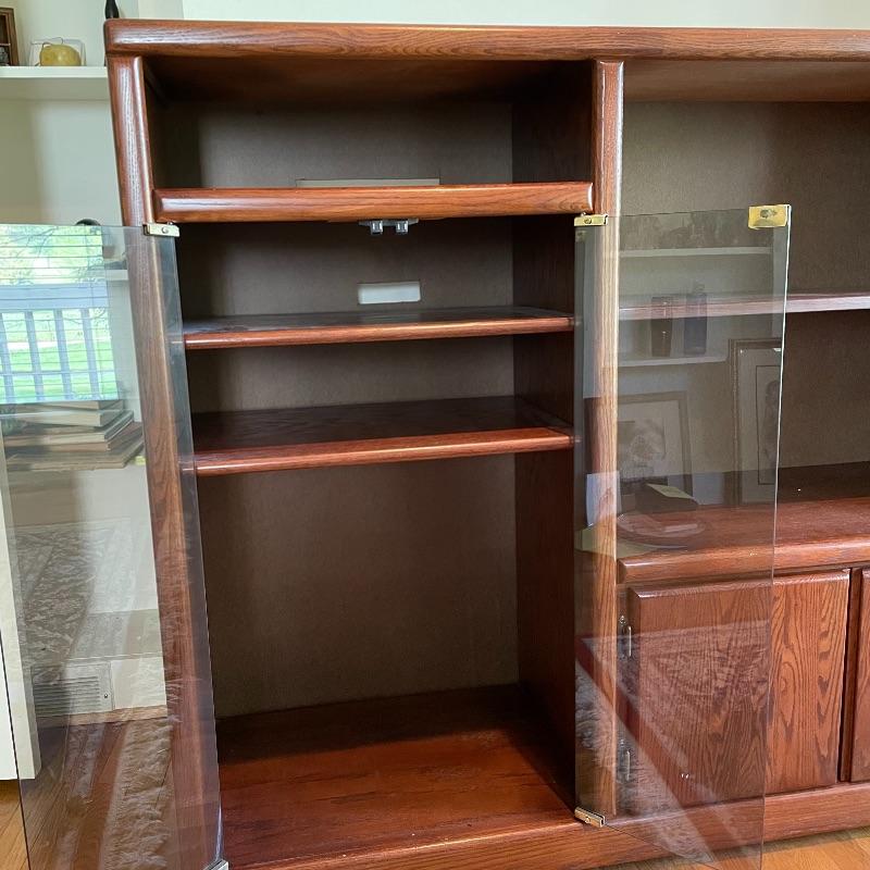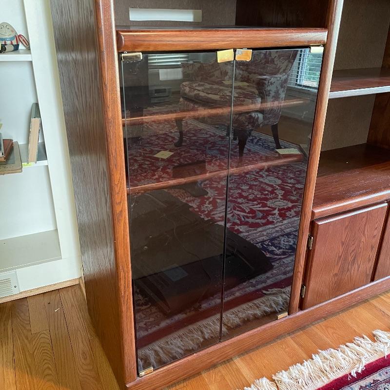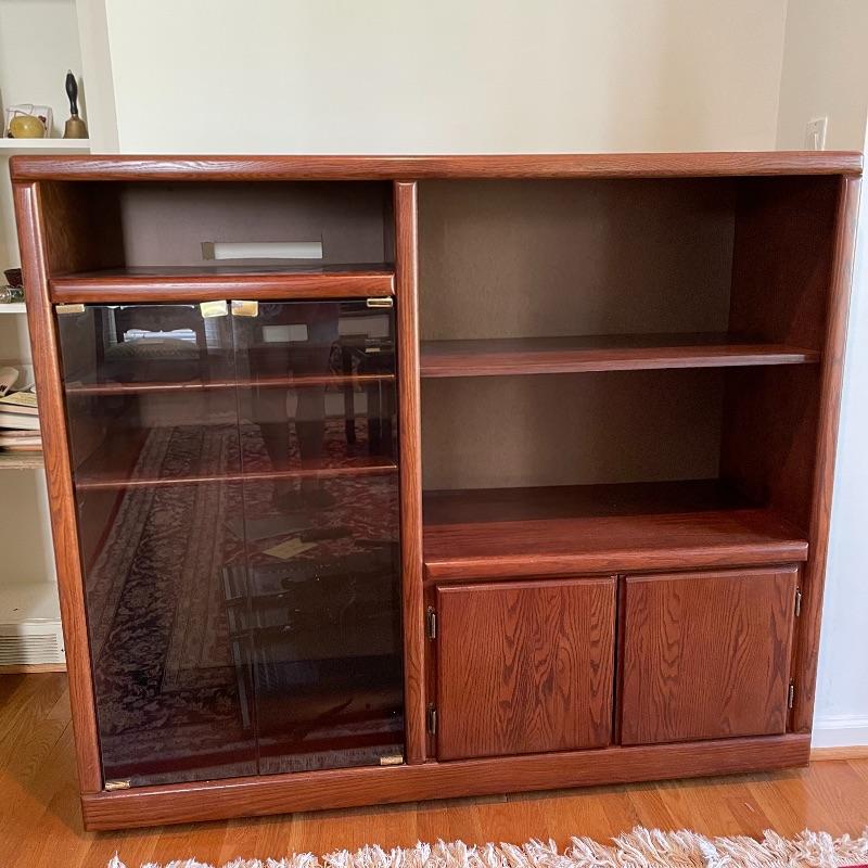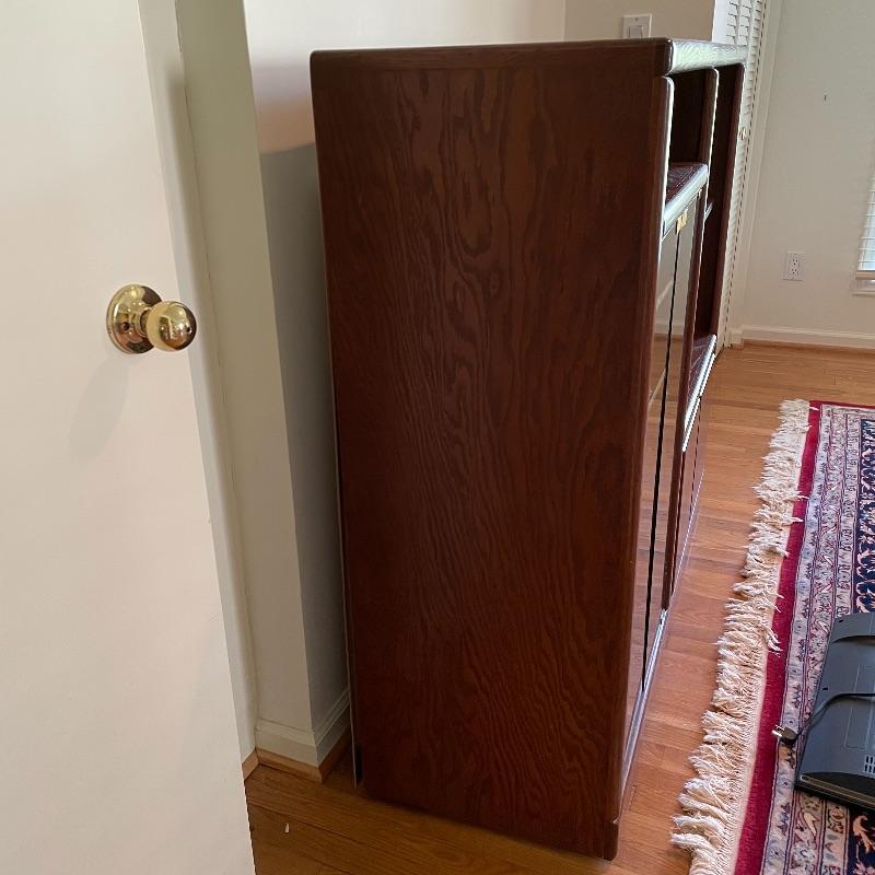 Here’s a nice tall entertainment cabinet with plenty of storage for displays or other electronics. Unit is a mix of pressed and solid wood and appears in very nice shape outside of one blemish on the metal hardware on the glass doors. This cabinet is on wheels and rolls well for easier transport. Cabinet is about 52.5” x 16.5” x 46”. It is very heavy, please bring help to load. Conveniently, there is only one step on the porch and rolling makes a big difference.