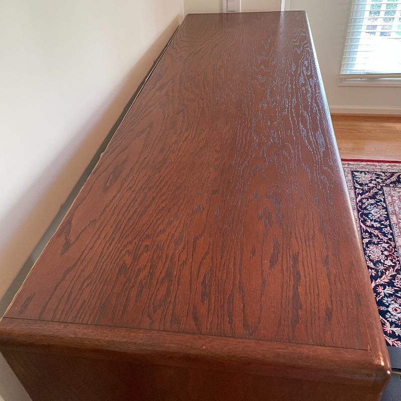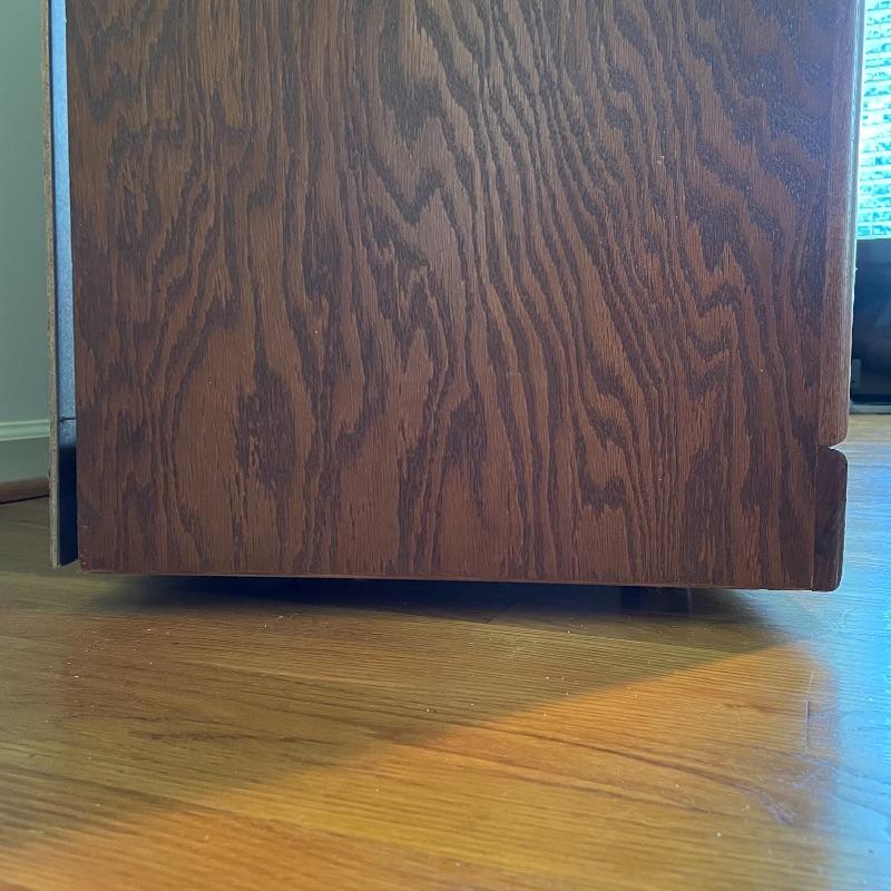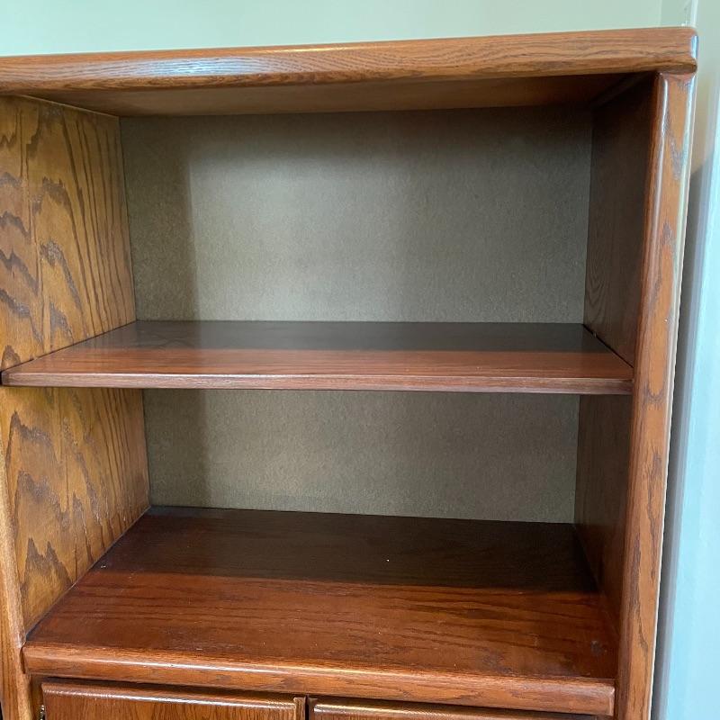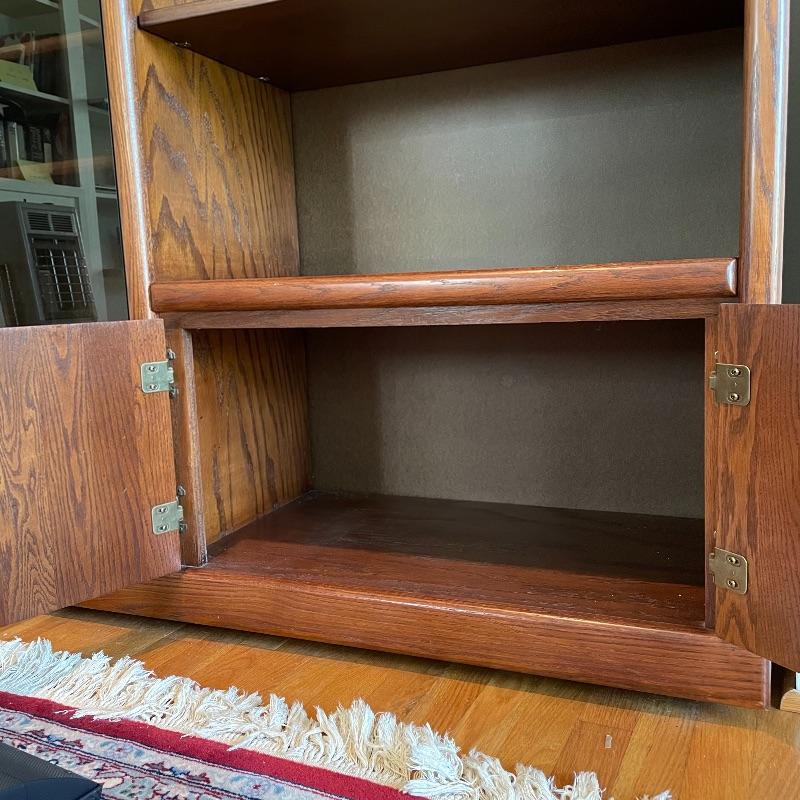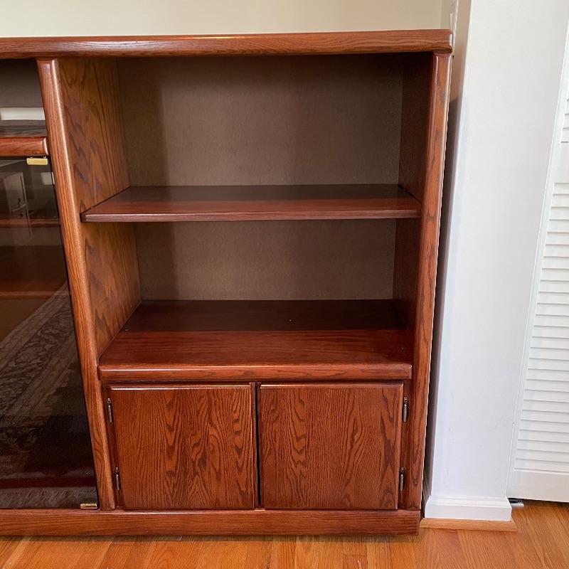 Here’s a nice tall entertainment cabinet with plenty of storage for displays or other electronics. Unit is a mix of pressed and solid wood and appears in very nice shape outside of one blemish on the metal hardware on the glass doors. This cabinet is on wheels and rolls well for easier transport. Cabinet is about 52.5” x 16.5” x 46”. It is very heavy, please bring help to load. Conveniently, there is only one step on the porch and rolling makes a big difference.
