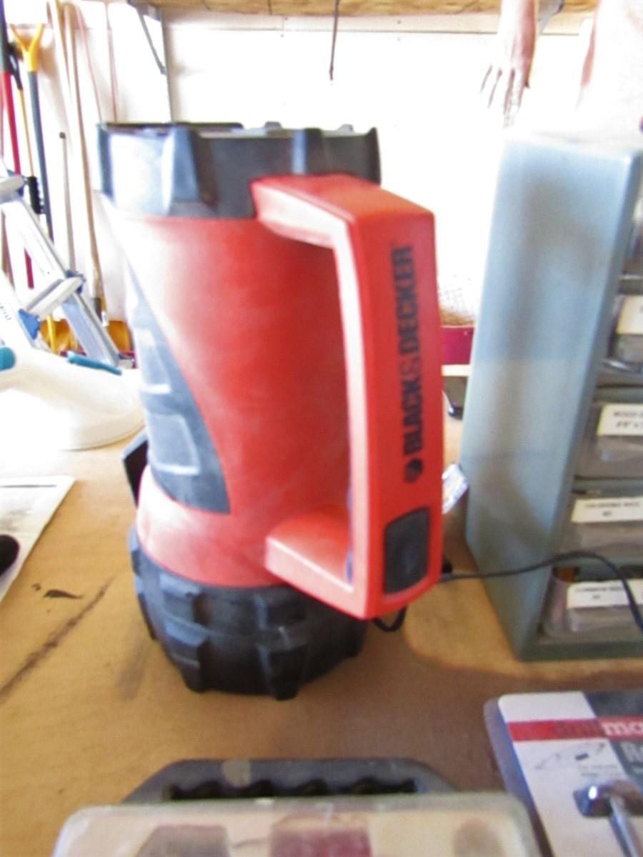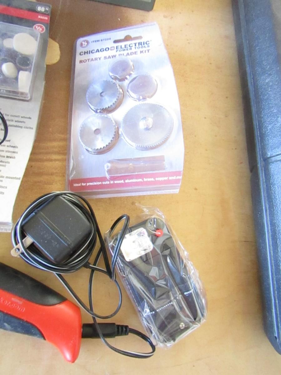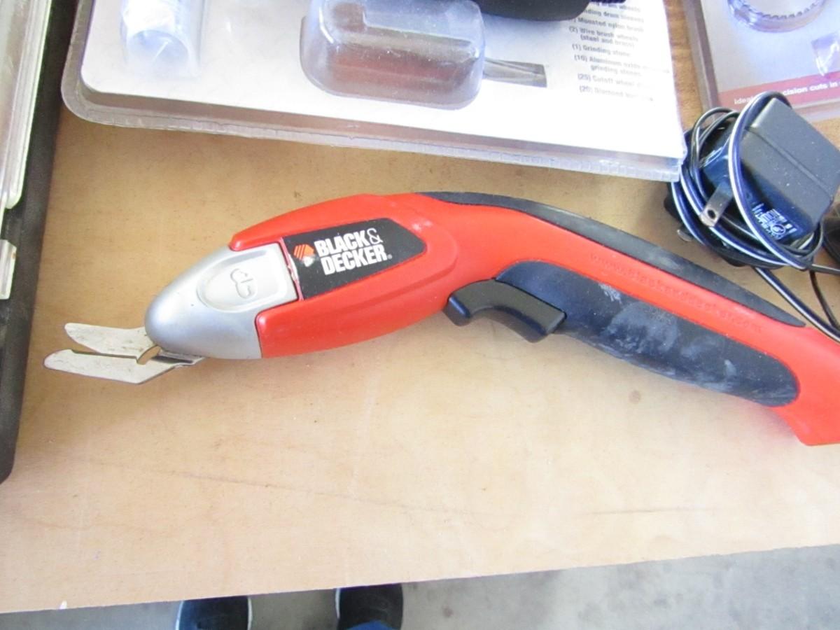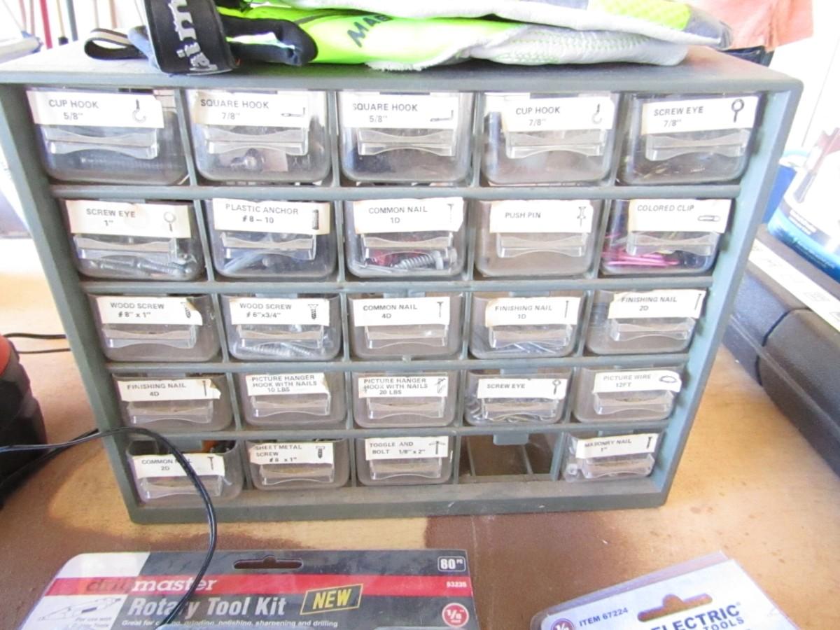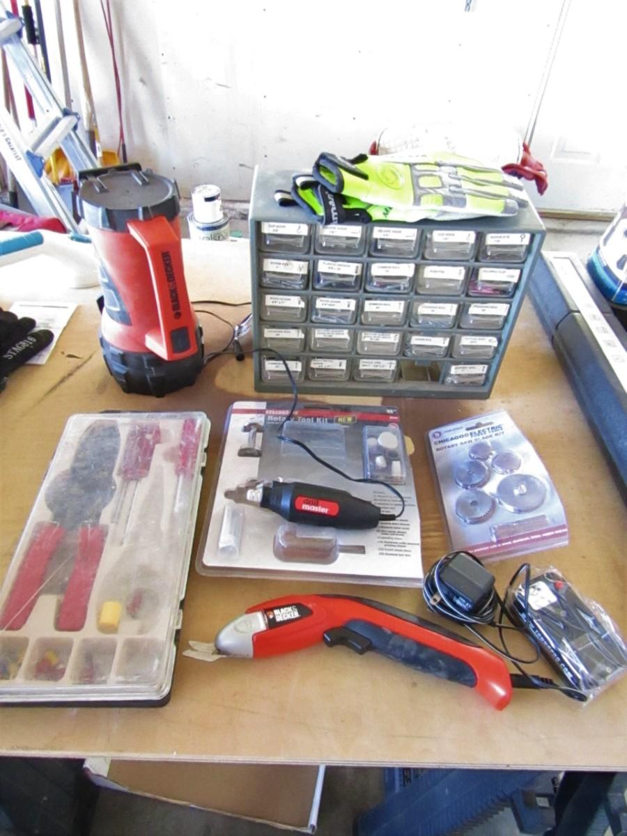 ROTARY TOOL KIT, 1/8 ROTARY SAW BLADE KIT, CAIMAN GLOVES, HARDWARE IN STORAGE DRAWERS, BLACK & DECKER FLASHLIGHT, WIRE STRIPPER, & BLACK & DECKER ELECTRIC SHEERS.