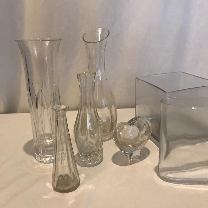 Variety of makers of these crystal and glass vases. Lenox vase has small chip on top. See photos for details. Tallest vase is 11” tall. Shipping or local pick up in Asheville.