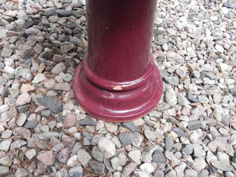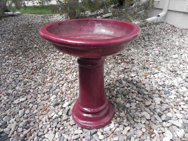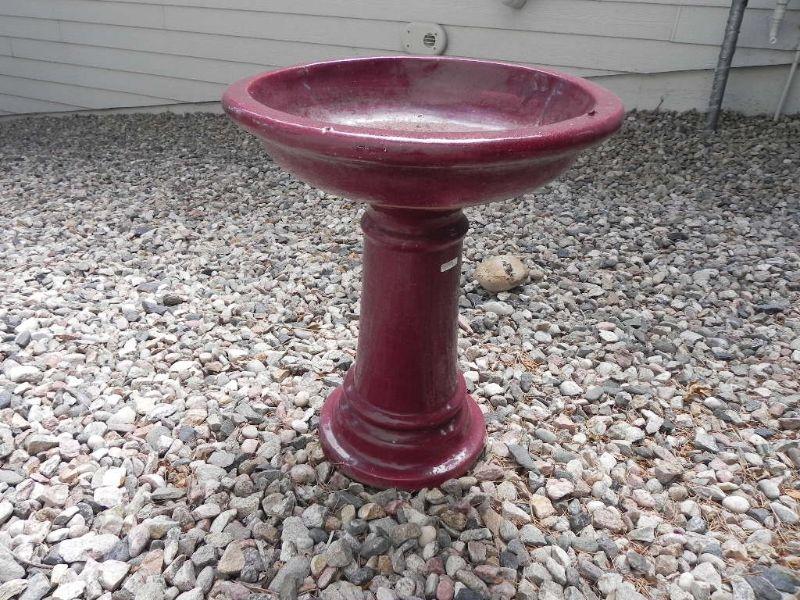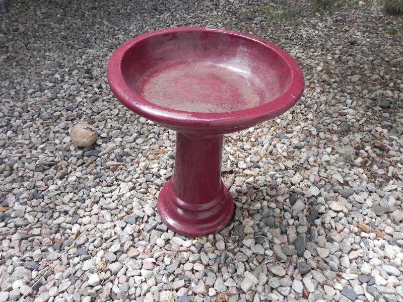 BURGUNDY COLORD BIRD BATH. SMALL CHIP TO BOTTOM OF THE BASE (SEE PIC)