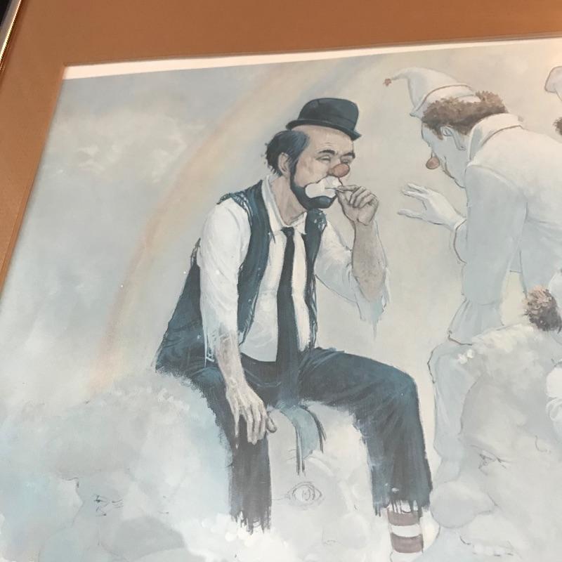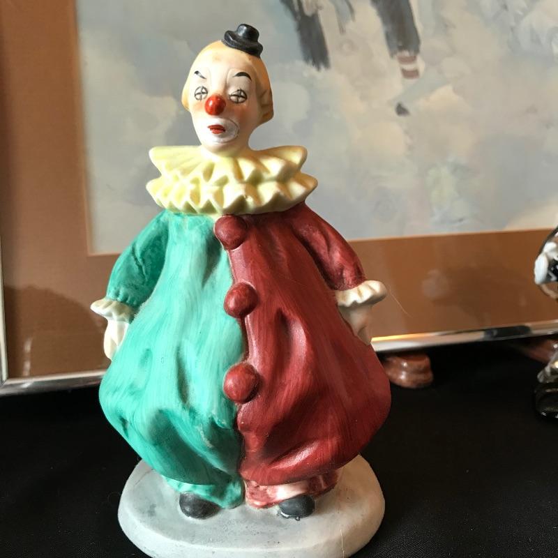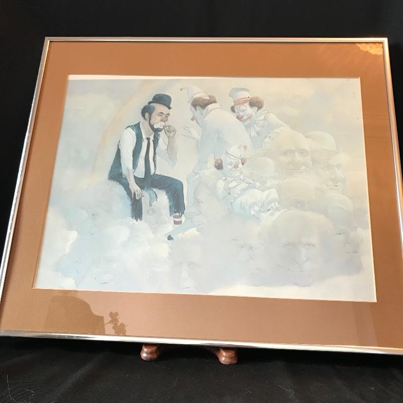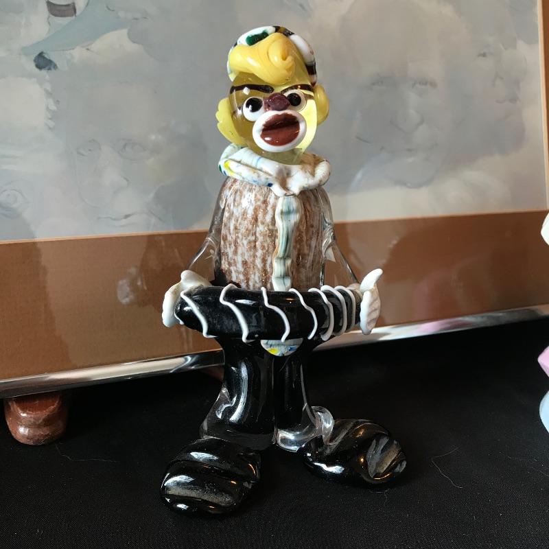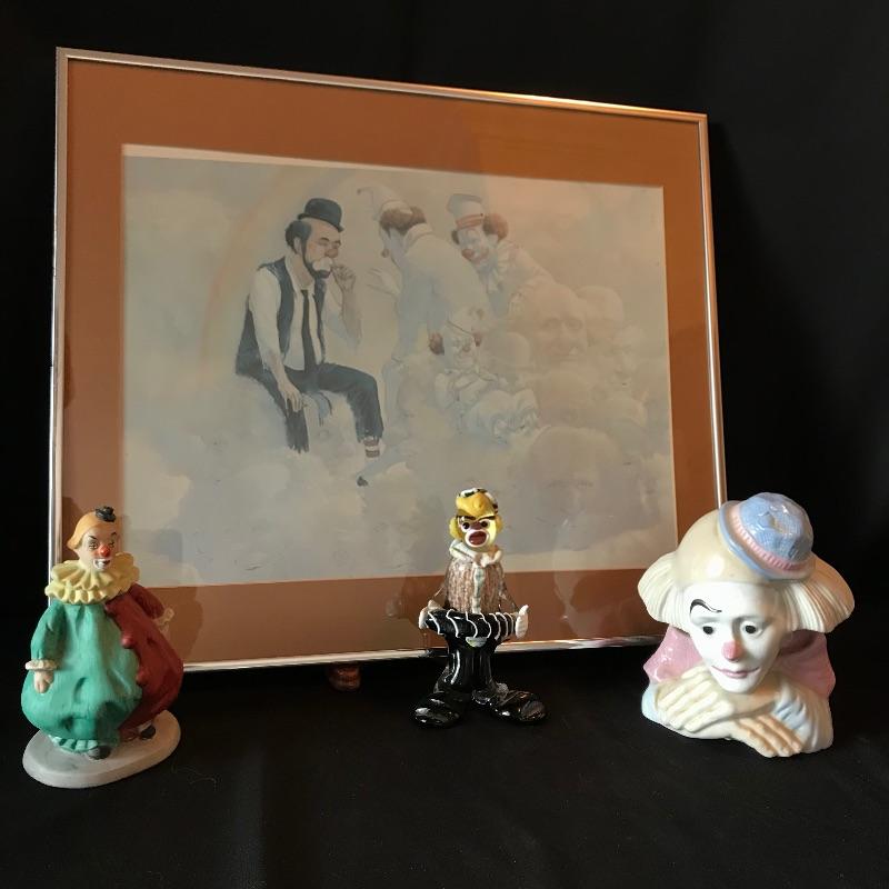 Bring in the clowns! Lovely clown montage featuring a range of clown emotions. Piece could possibly be a lithograph, signature was not located. Art sits in a brushed silver colored metal frame with a nice brown mat. Frame measures 18.75” x 16”. Framed art is accompanied by three clown figurines including a unique clown that appears to be a multi processed blown glass. See photos. No shipping.