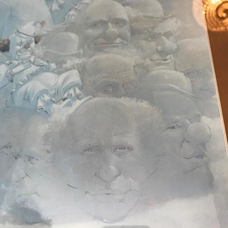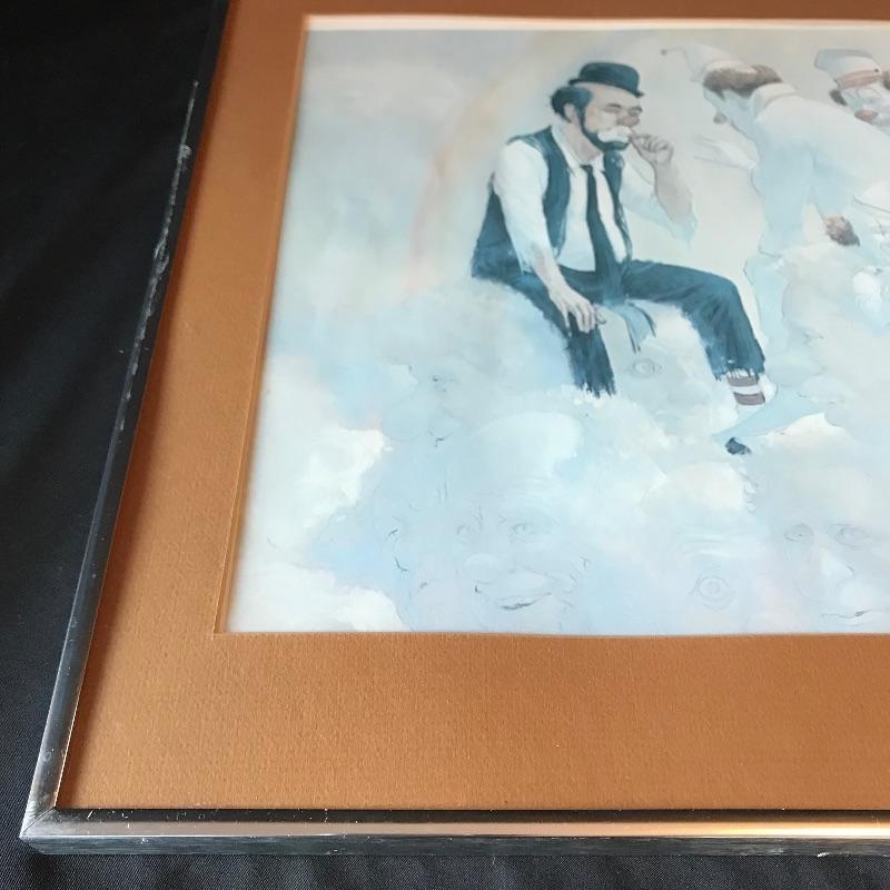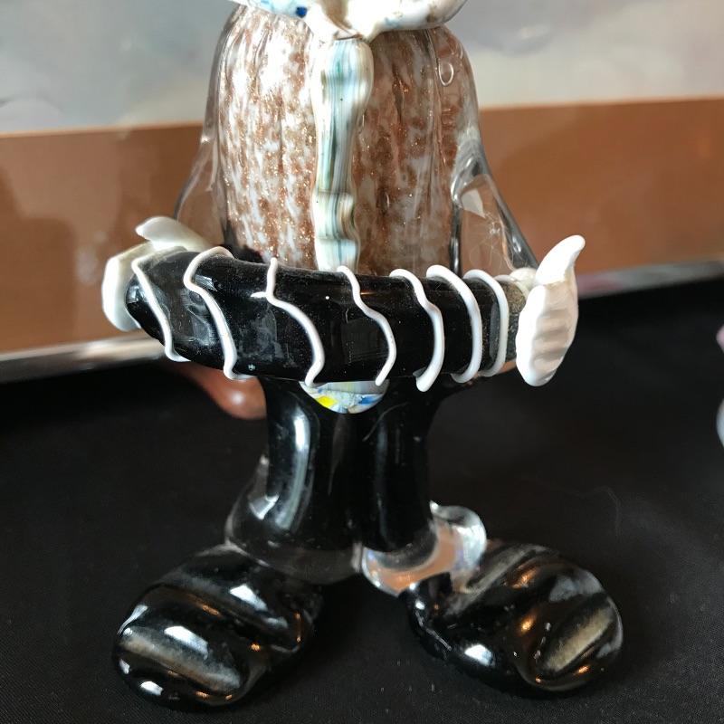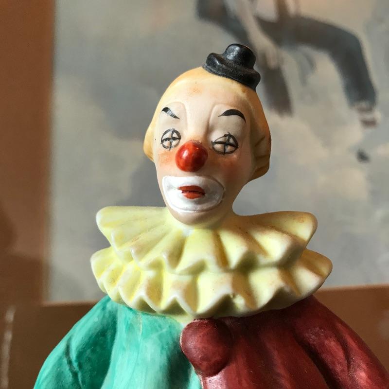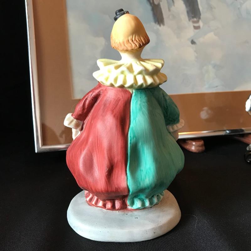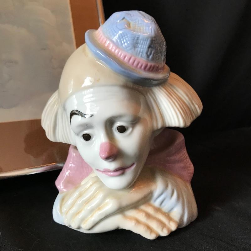 Bring in the clowns! Lovely clown montage featuring a range of clown emotions. Piece could possibly be a lithograph, signature was not located. Art sits in a brushed silver colored metal frame with a nice brown mat. Frame measures 18.75” x 16”. Framed art is accompanied by three clown figurines including a unique clown that appears to be a multi processed blown glass. See photos. No shipping.
