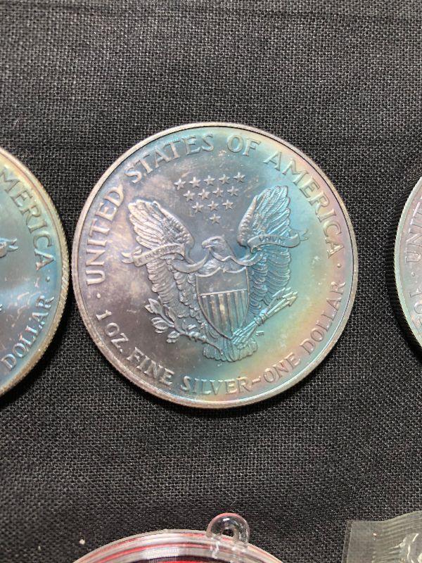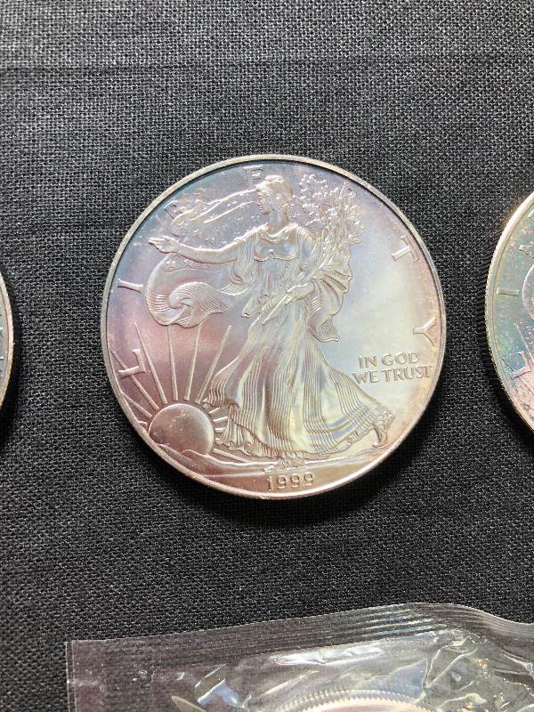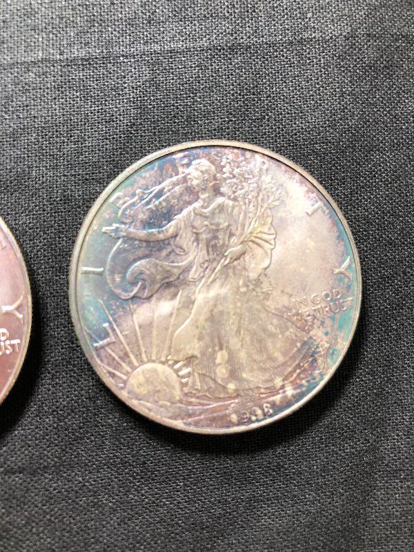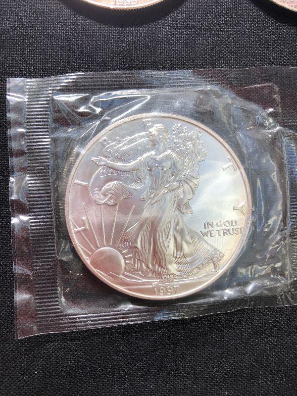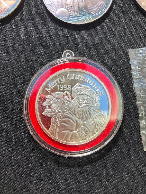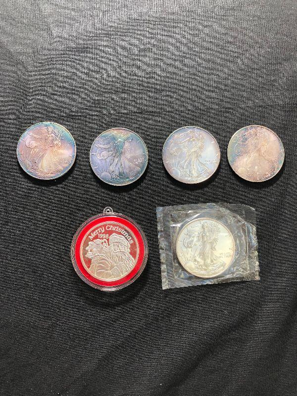 Lot 127 -  Coins and Silver (5 Silver Eagles and a 1998 Merry Christmas Coin)