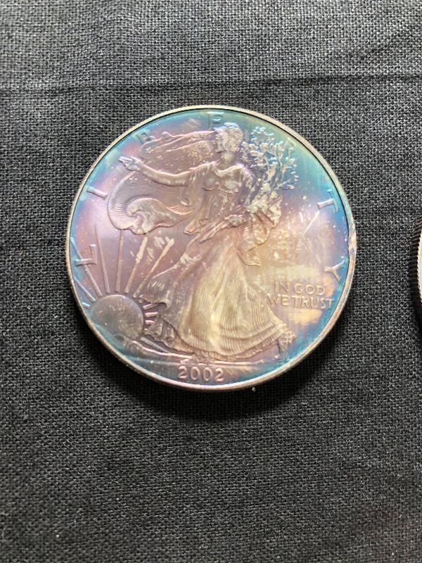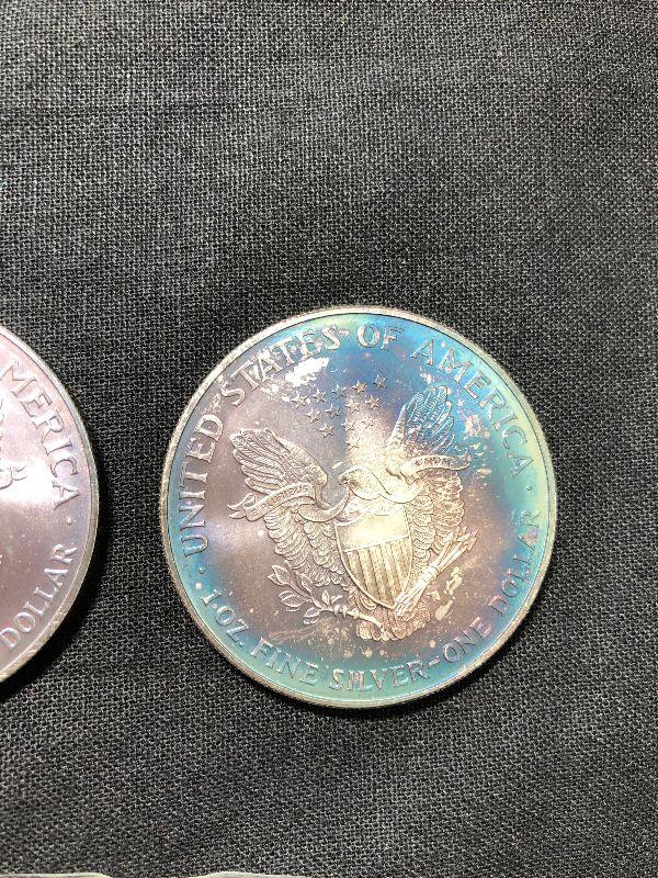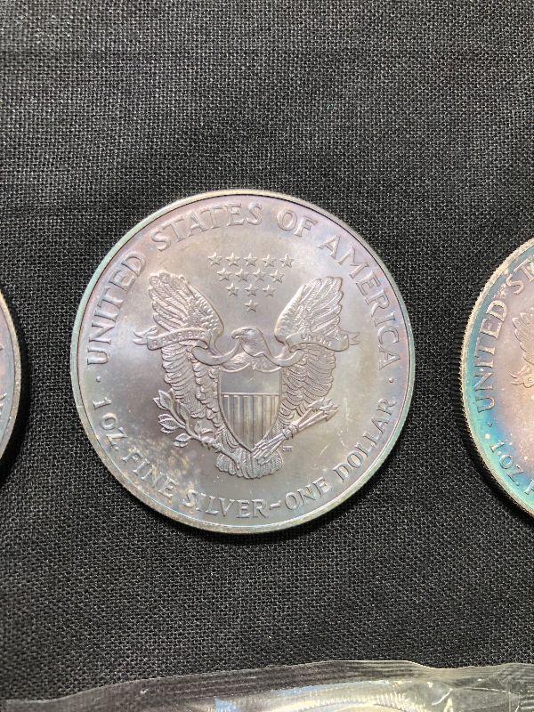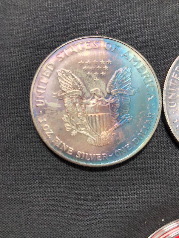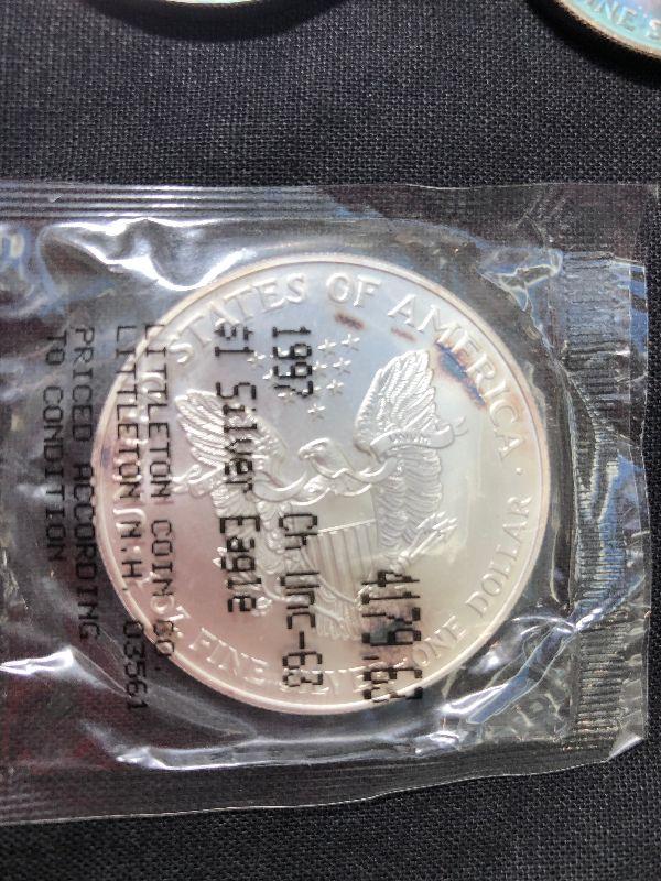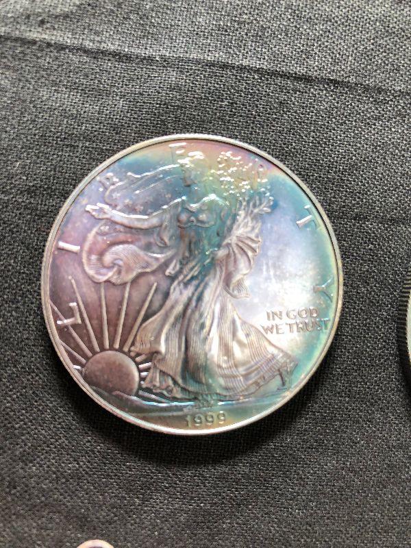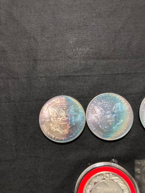 Lot 127 -  Coins and Silver (5 Silver Eagles and a 1998 Merry Christmas Coin)