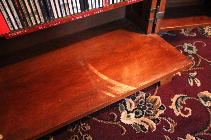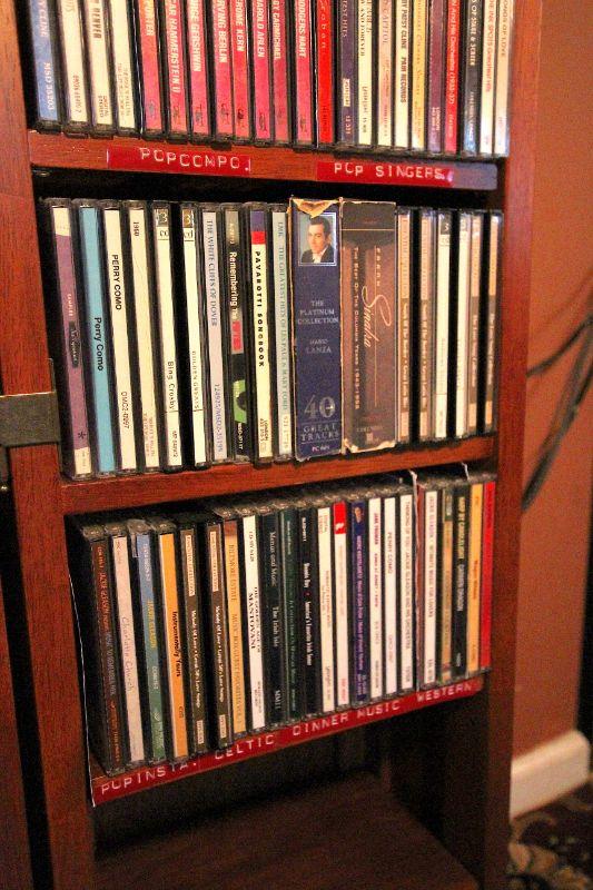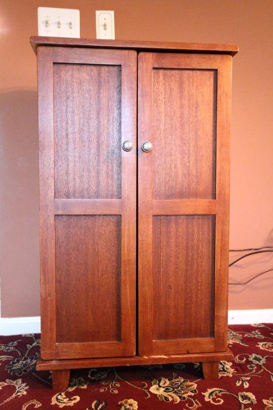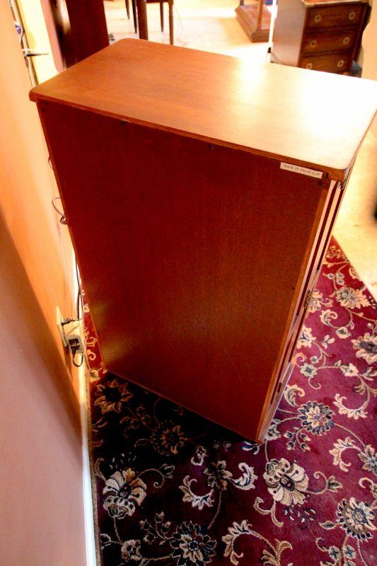 Chest is solid wood. 41" h x 14" d x 24" w when closed. Many wonderful CDs as seen in photos in original cases. Cabinet has scratch along bottom where side pulls out. Brass knobs.