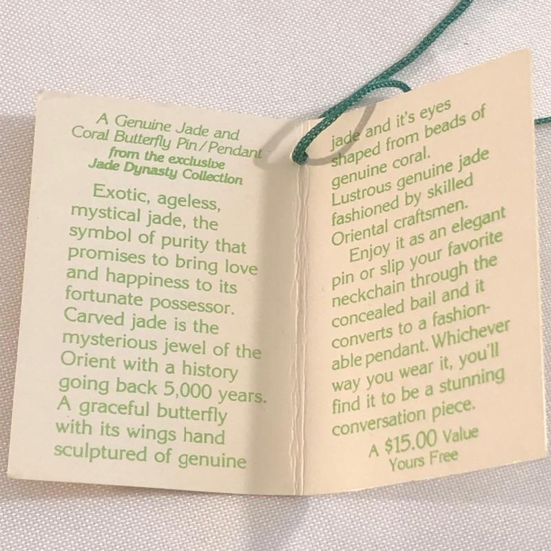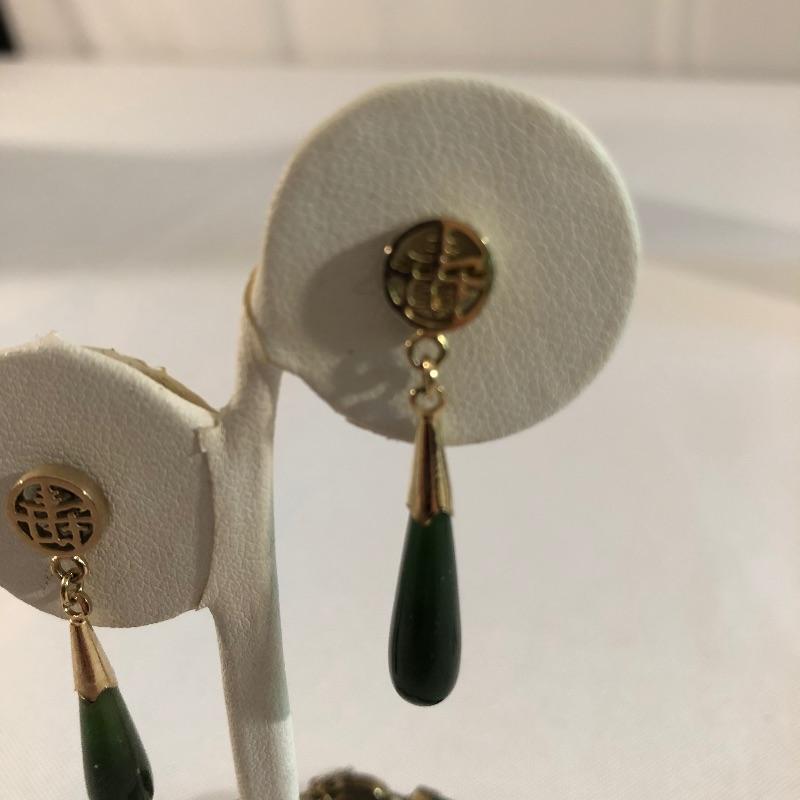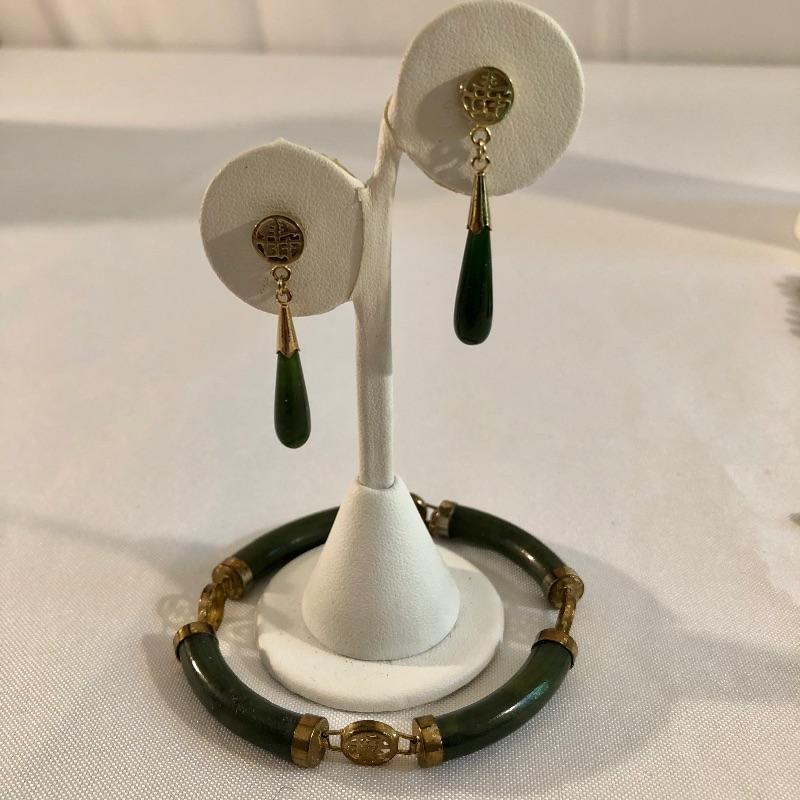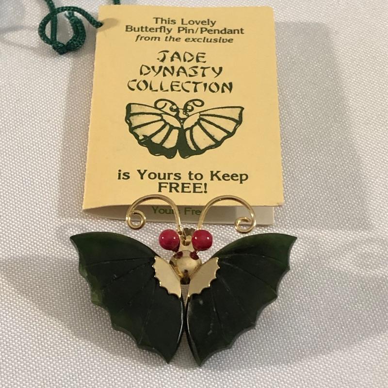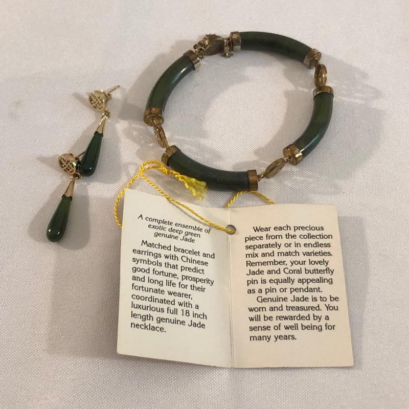 This assortment of Jade jewelry is gorgeous. From the Jade Dynasty Collection we have a matching bracelet and post teardrop earrings and also a butterfly brooch. Both come with their original tag that tells you all about the pieces, see images. As for the rest of the pieces we cannot guarantee if they are real Jade, but either way there are many more stunning items in this lot that includes a beaded necklace and two pendant necklaces on chains, a gorgeous rose brooch, a bangle, a pair of post earrings, an additional pendant without chain and an Asian design satin jewelry box that measures 5.25” x 8”.