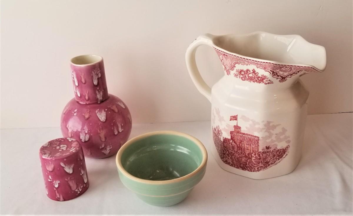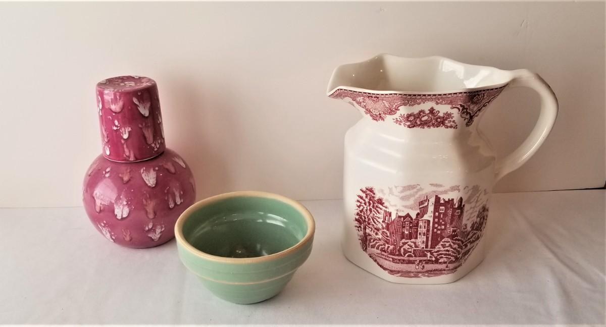 You get all you see here - pretty transfer ware Johnson Bros (England) pitcher - 8" tall, Small vintage mixing bowl - 3" tall, and an art pottery topsy turvy night time carafe for your nightstand - 7" tall. All in good condition.