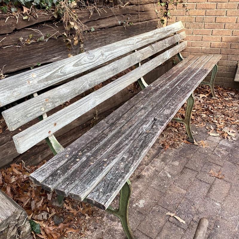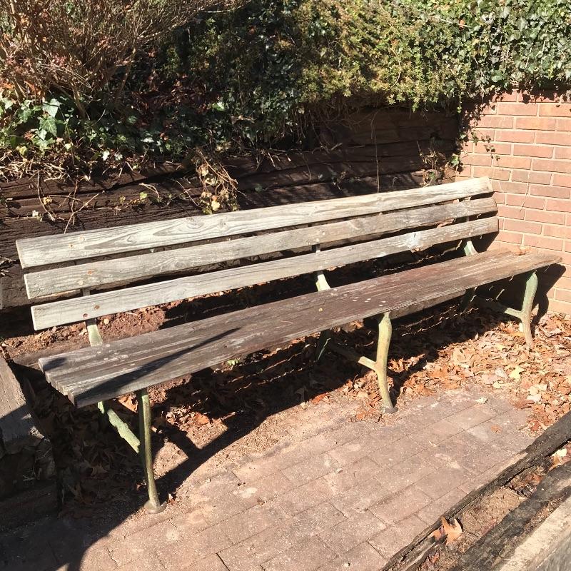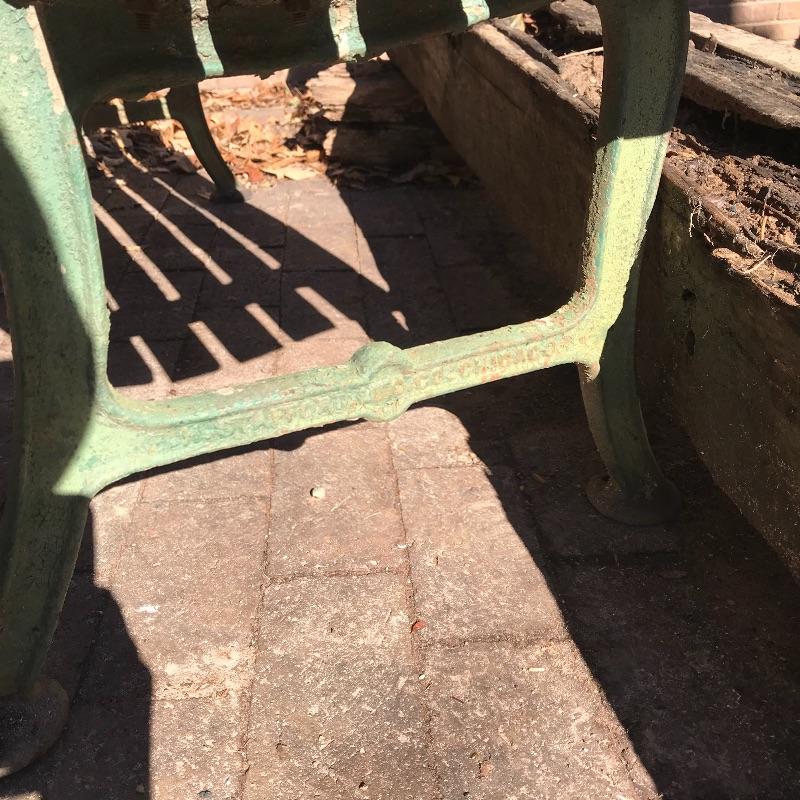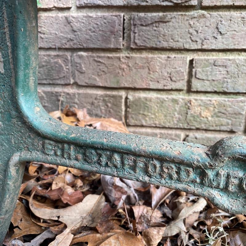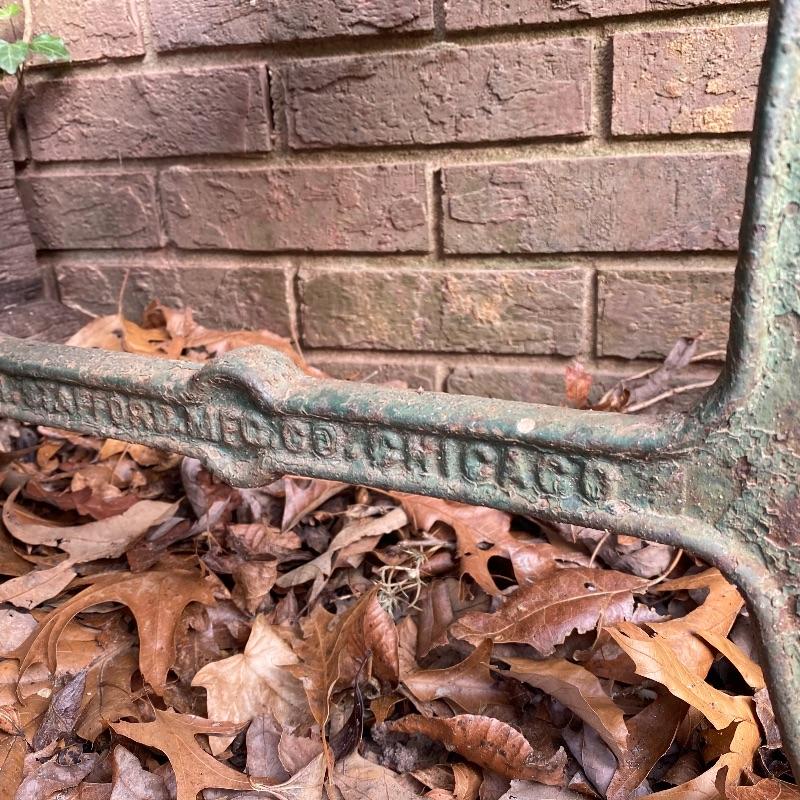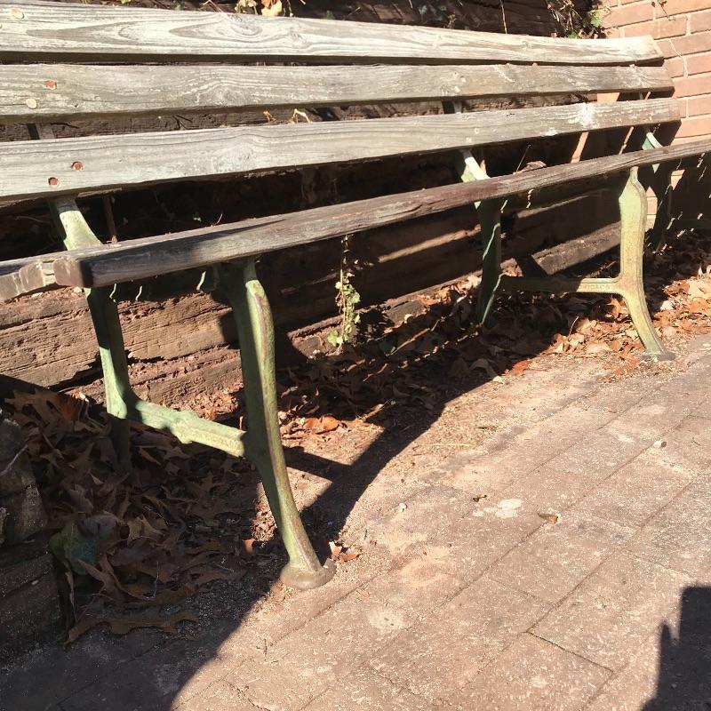 Stunningly large wooden and iron bench stamped Stafford MFG Chicago on its three iron legs. Wood is intact but would benefit from new wooden slats. Some weak pieces. Bench measures approximately 8’ x 21” x 30” with a seat height at 17”. Piece is extremely heavy and long. It does not come apart(has some rusted screws that you could try to unscrew if wanted)..bring help to load...easy access in driveway. Local pick up only.