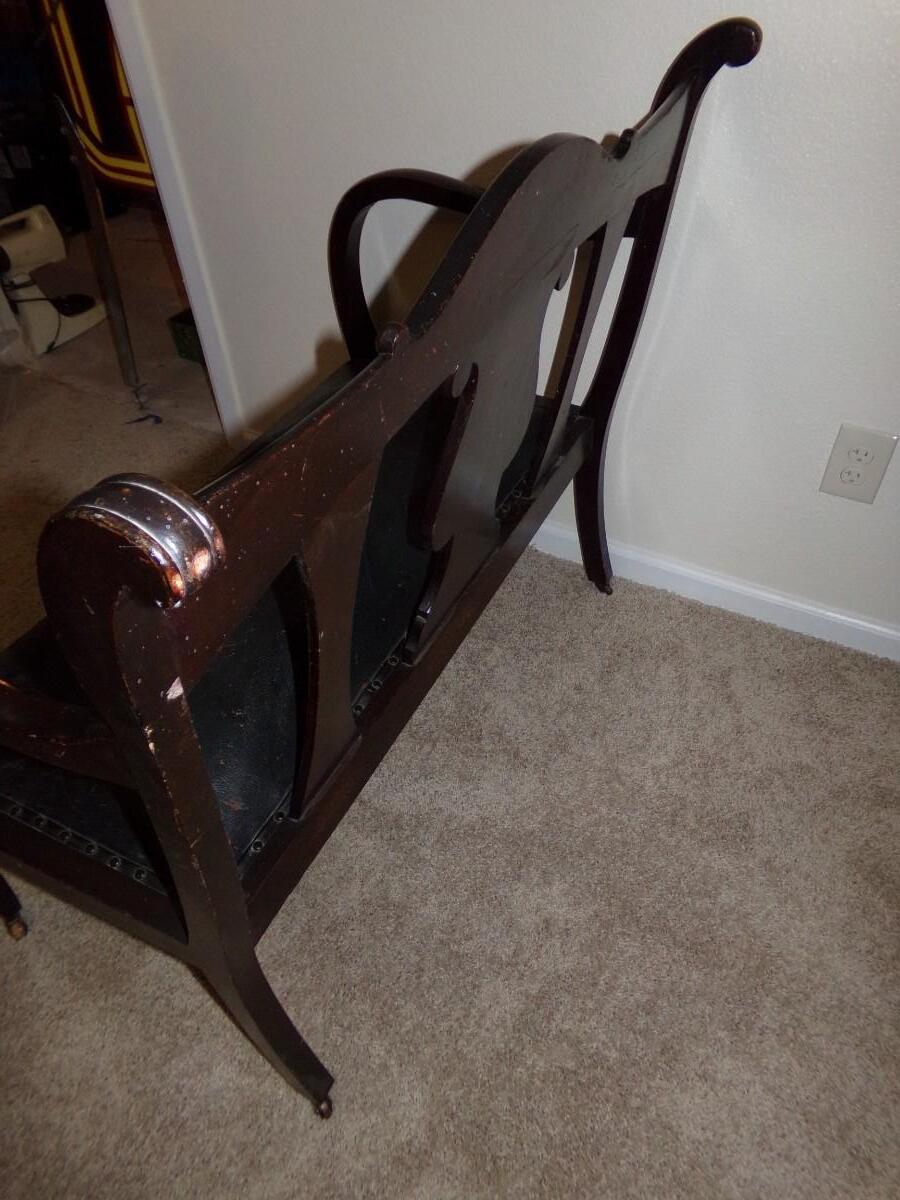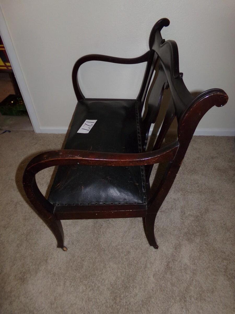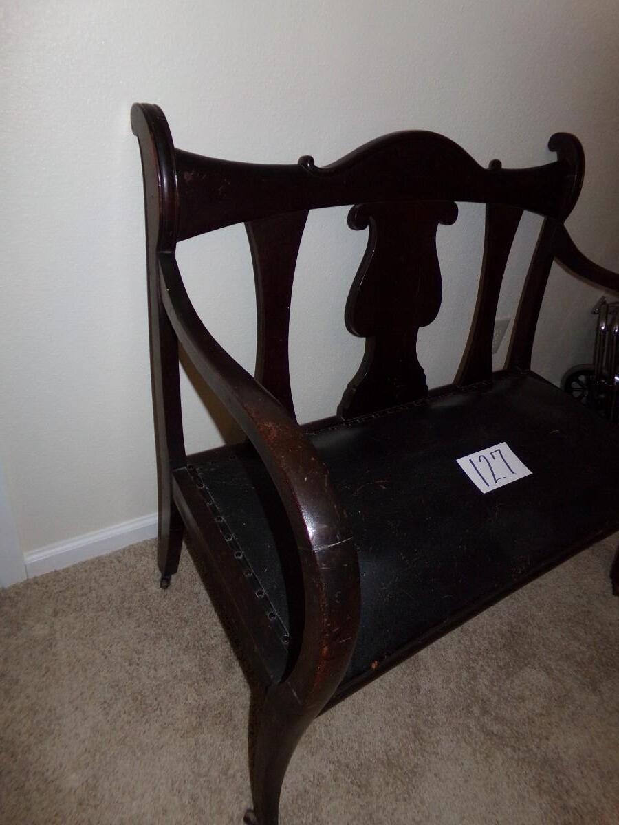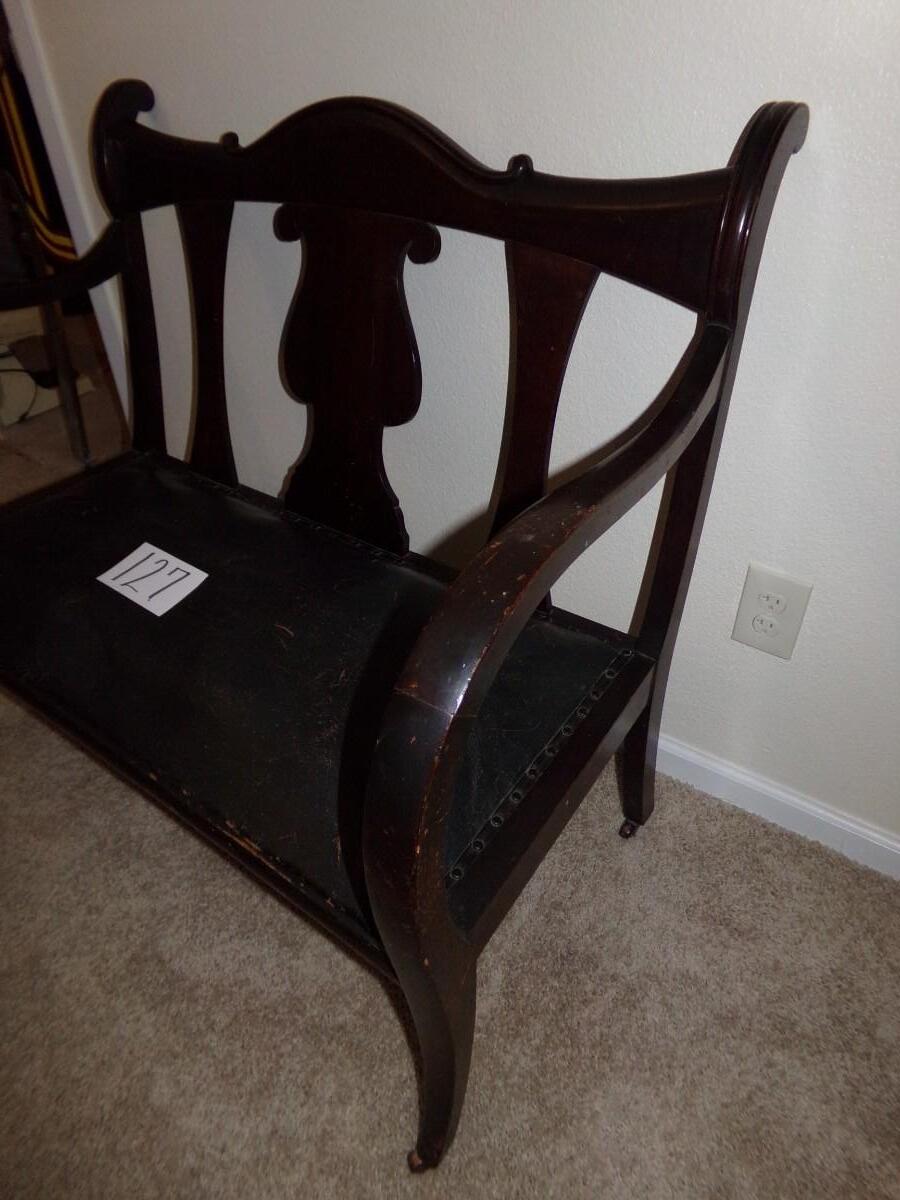 MAHOGANY CARVED WOOD SETTEE BENCH WITH LEATHER SEAT. CUSHION ON THE SEAT IS WORN. THE LEGS ALSO HAVE WEAR ON THEM. BENCH COMES WITH ROLLERS ON THE LEGS FOR EASY MOVING.