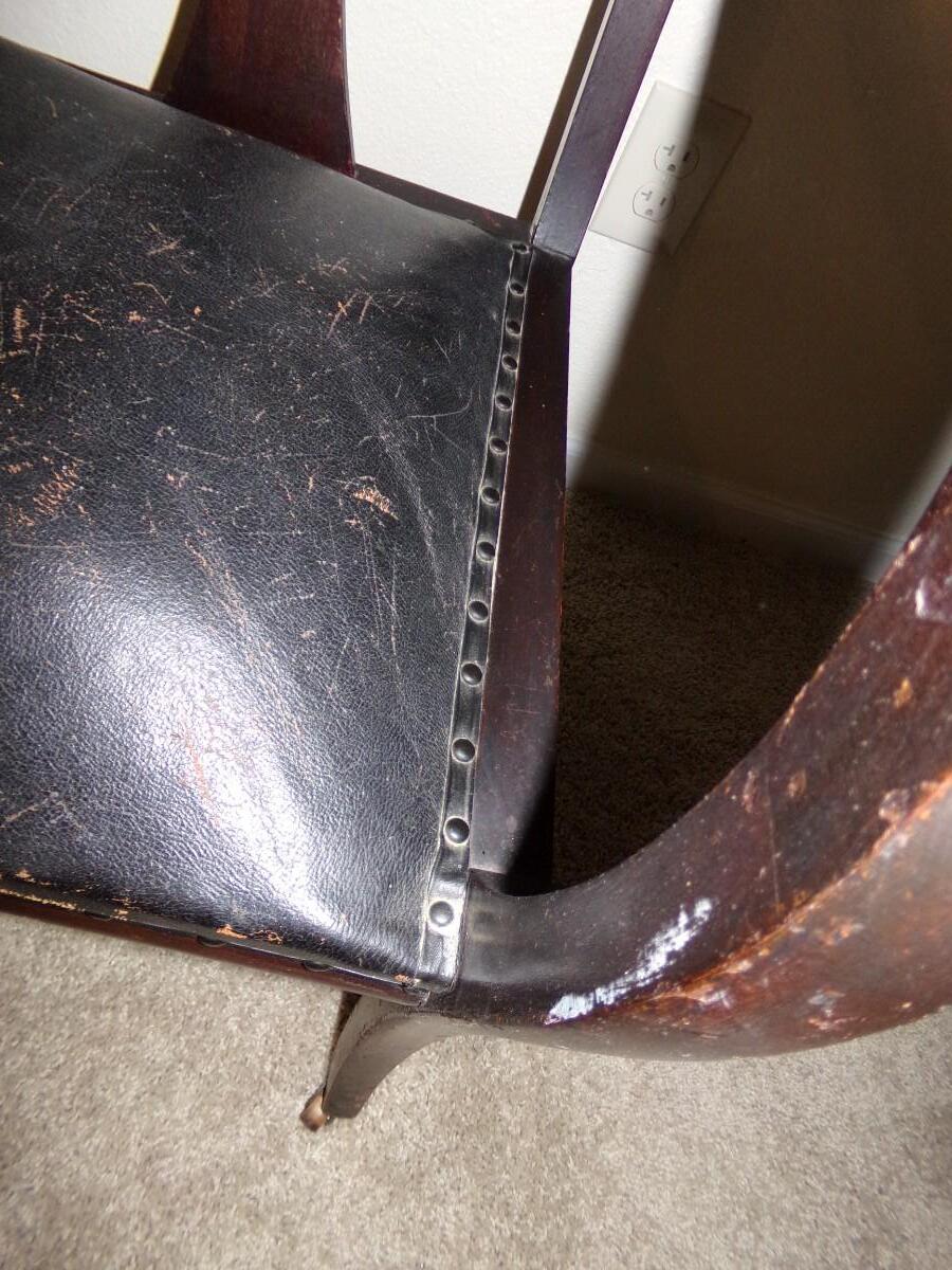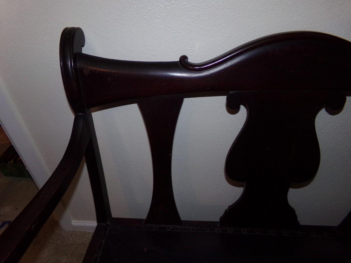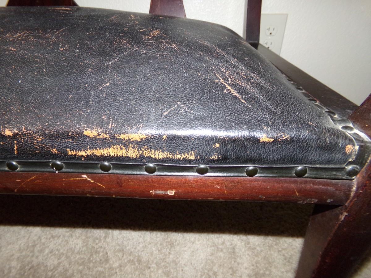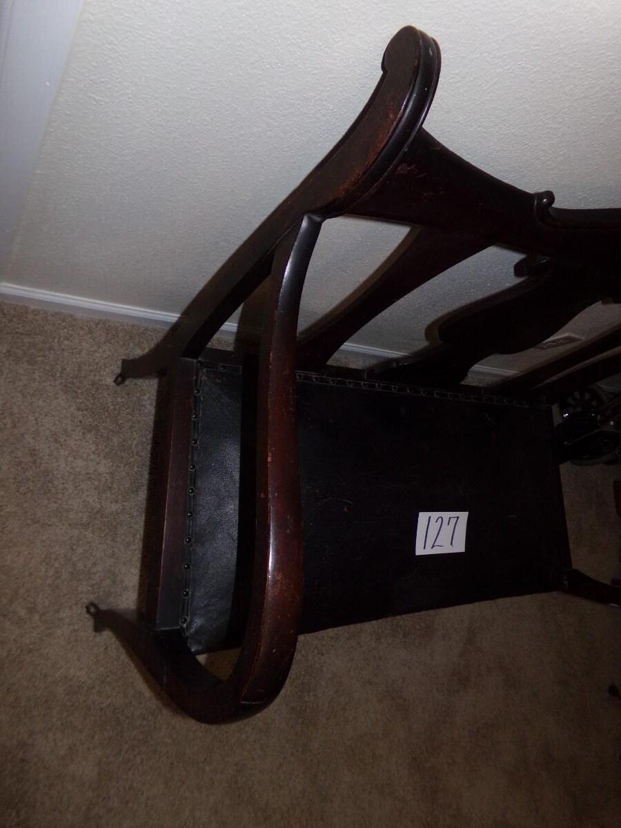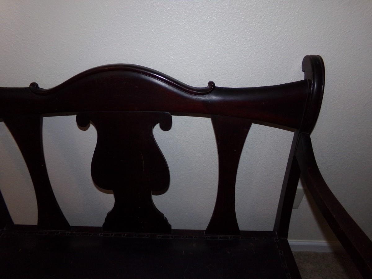 MAHOGANY CARVED WOOD SETTEE BENCH WITH LEATHER SEAT. CUSHION ON THE SEAT IS WORN. THE LEGS ALSO HAVE WEAR ON THEM. BENCH COMES WITH ROLLERS ON THE LEGS FOR EASY MOVING.