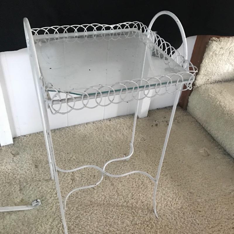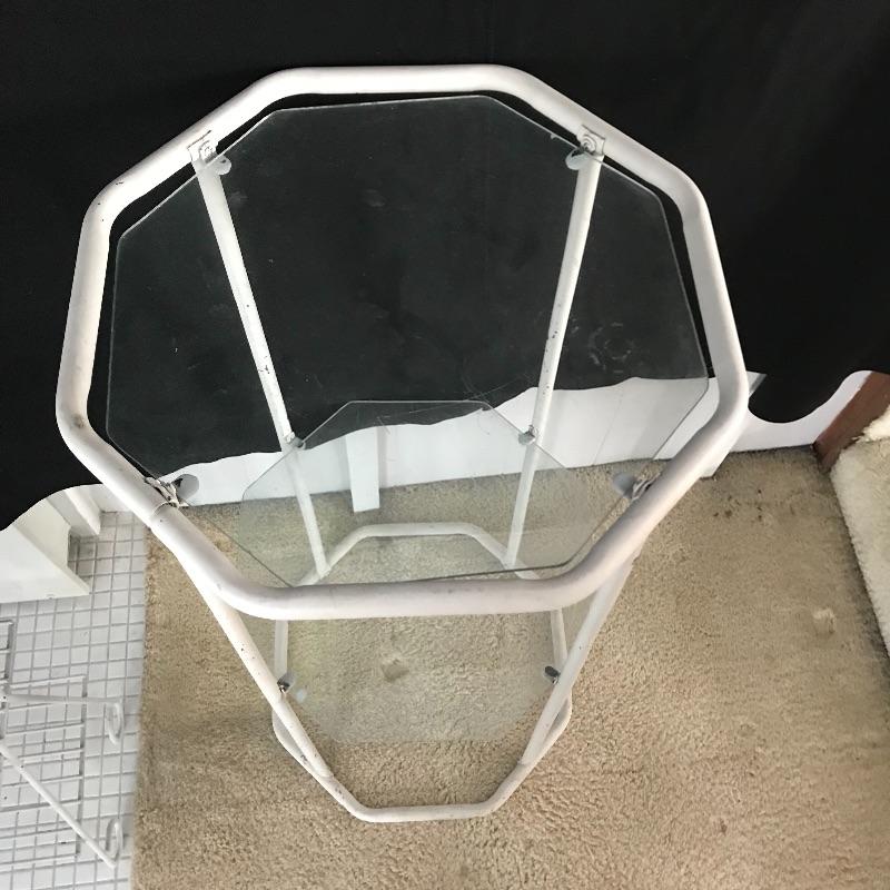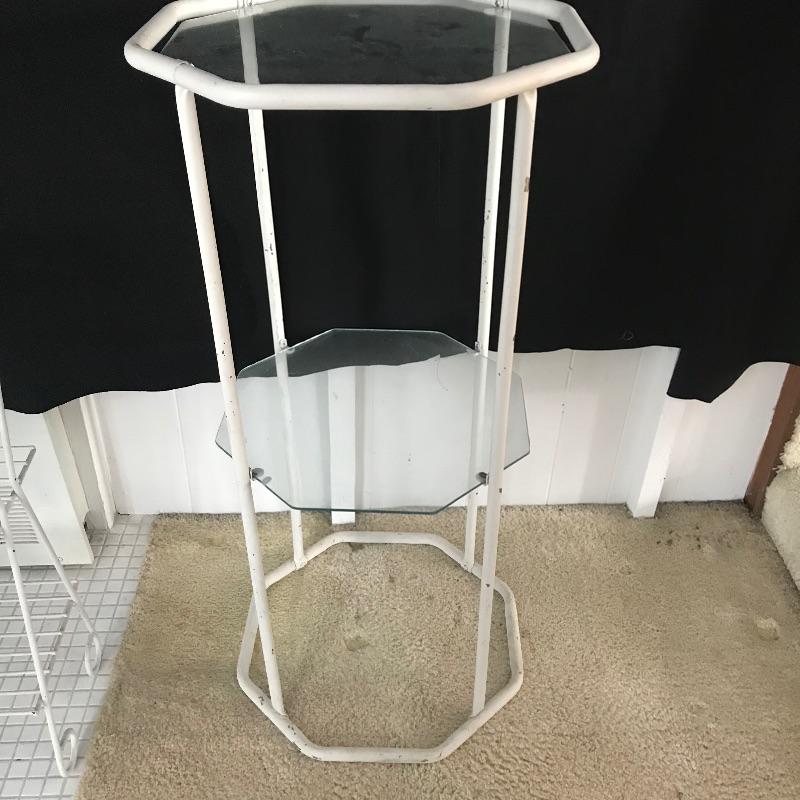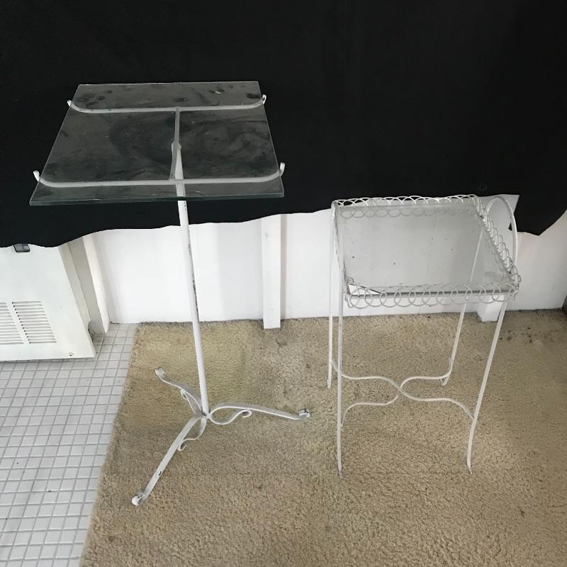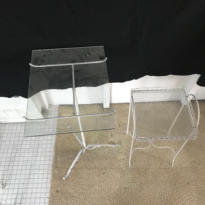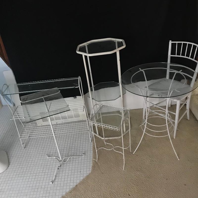 Five glass topped metal tables in varying sizes and shapes. Tallest is an octagon shaped two tier shelf measuring 17” x36”. Long three shelf piece with glass top measures 27.5” x9” x27” has a chip and crack in glass on one corner (see pix). Two small square tables with glass tops and largest measures 13” x16”x26.5” and smaller one has a chipped corner (see pix). Finally a small metal cafe like table with glass top measuring 24” x27” and a painted wood and wicker chair. Local pick up only.