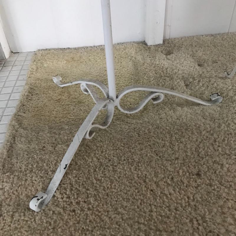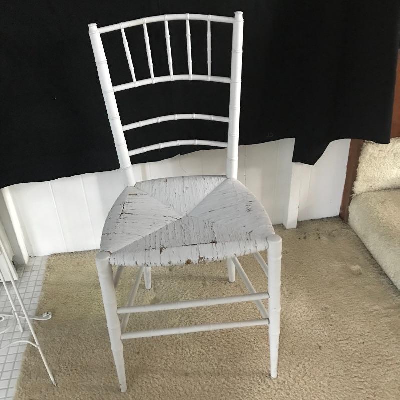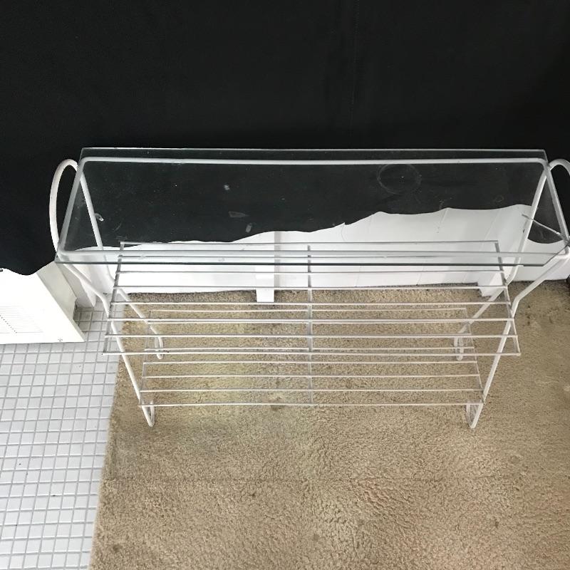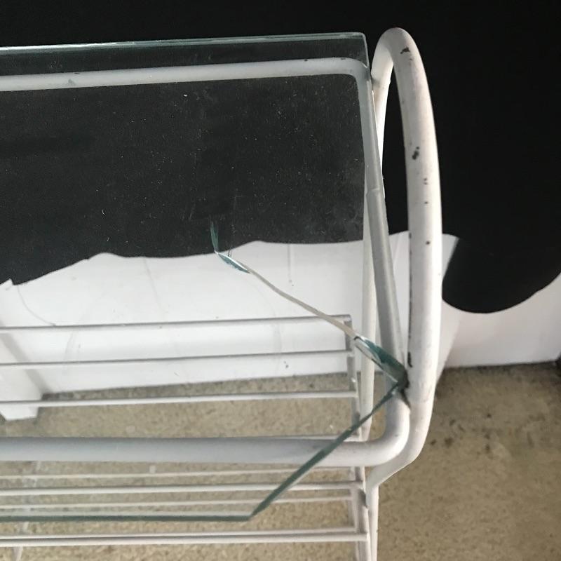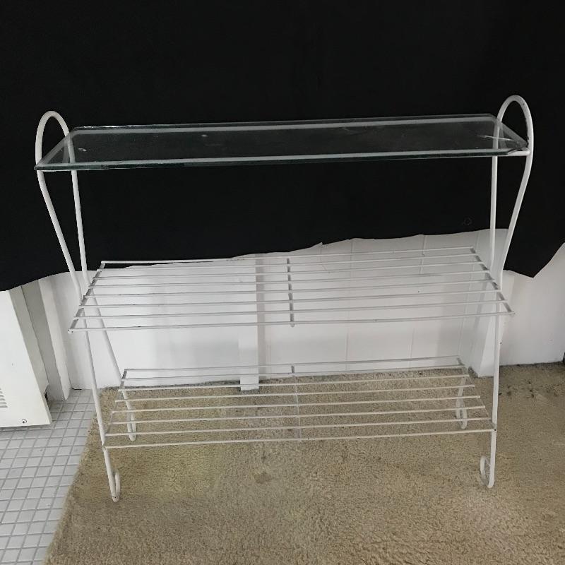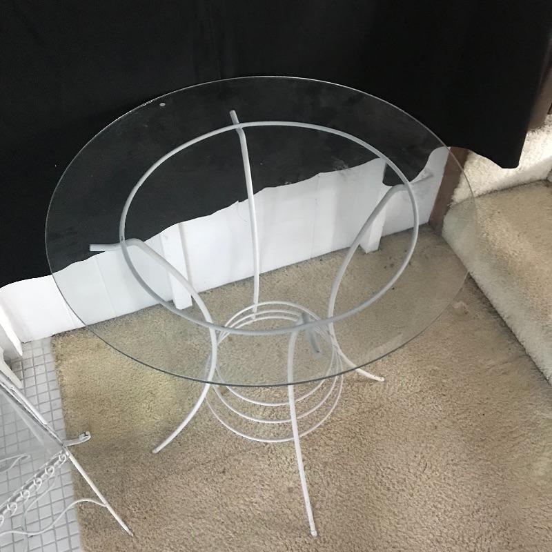 Five glass topped metal tables in varying sizes and shapes. Tallest is an octagon shaped two tier shelf measuring 17” x36”. Long three shelf piece with glass top measures 27.5” x9” x27” has a chip and crack in glass on one corner (see pix). Two small square tables with glass tops and largest measures 13” x16”x26.5” and smaller one has a chipped corner (see pix). Finally a small metal cafe like table with glass top measuring 24” x27” and a painted wood and wicker chair. Local pick up only.
