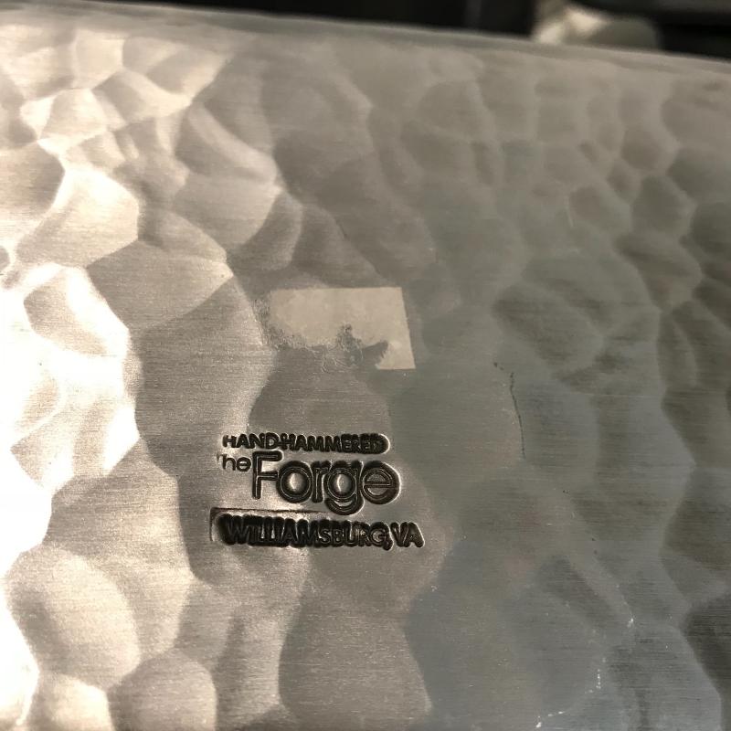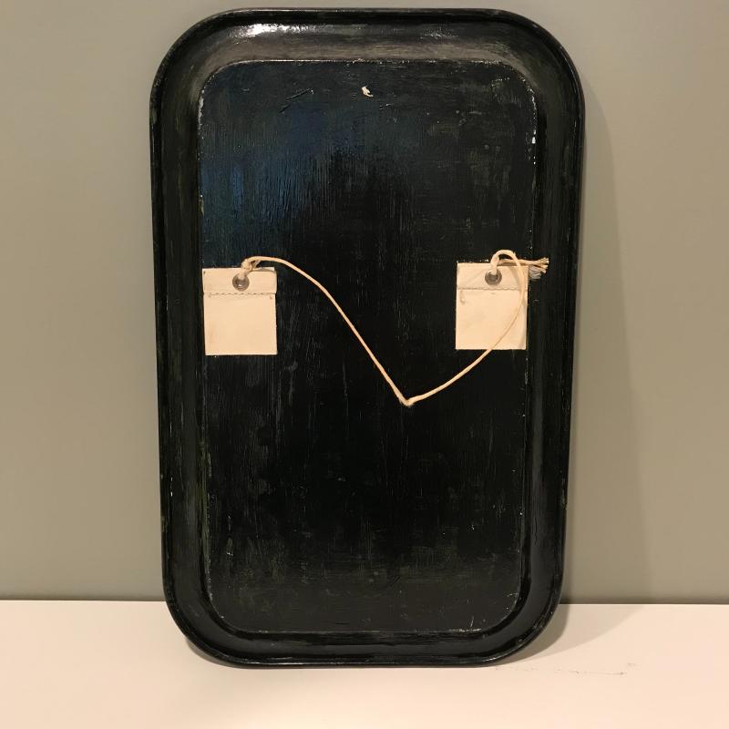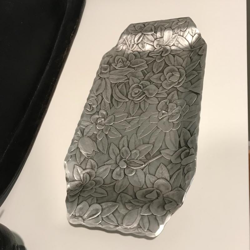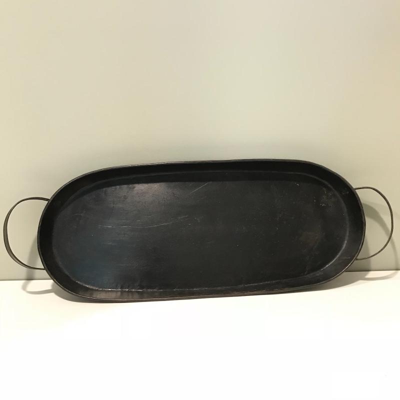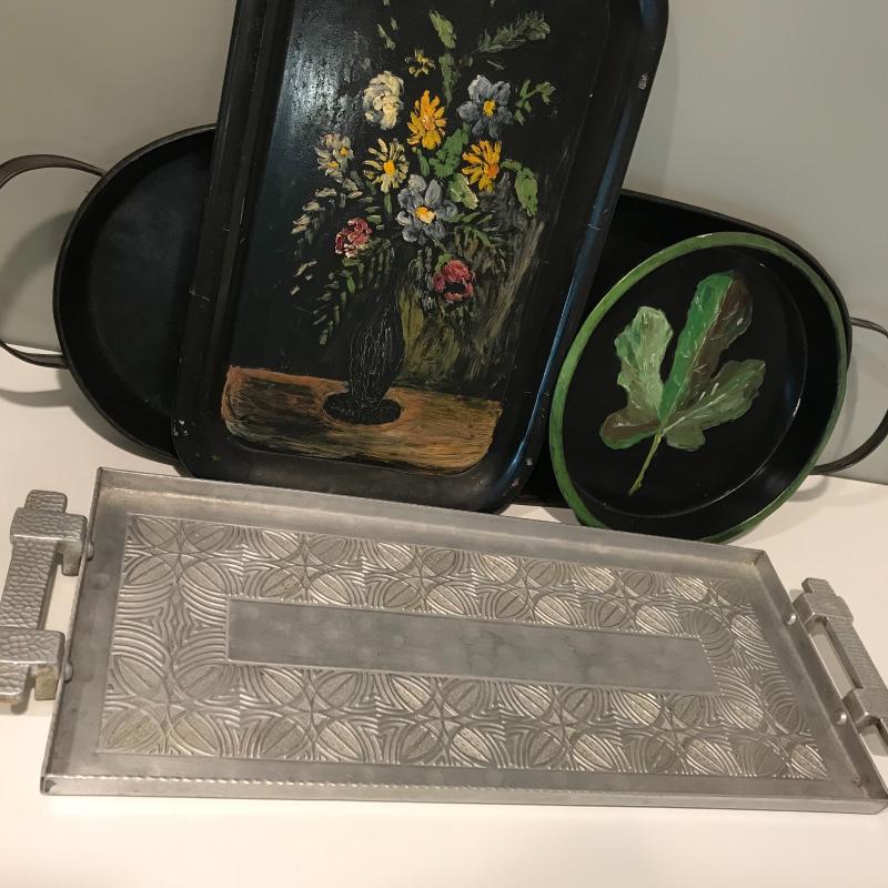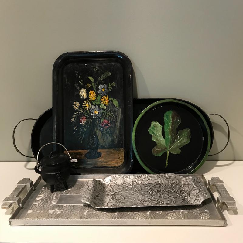Five unique metal decorative trays, the largest black tray measures 24.5”x8.5”. Two silver trays have photos of markings. Two of the black trays are hand painted. Trays accompanied by a heavy mini witches’ cauldron with tag still on. Local pick up only.