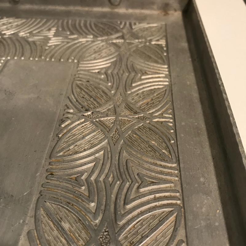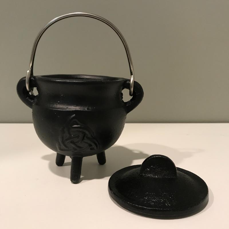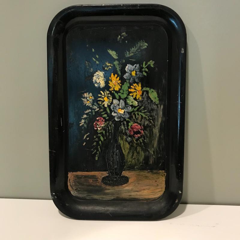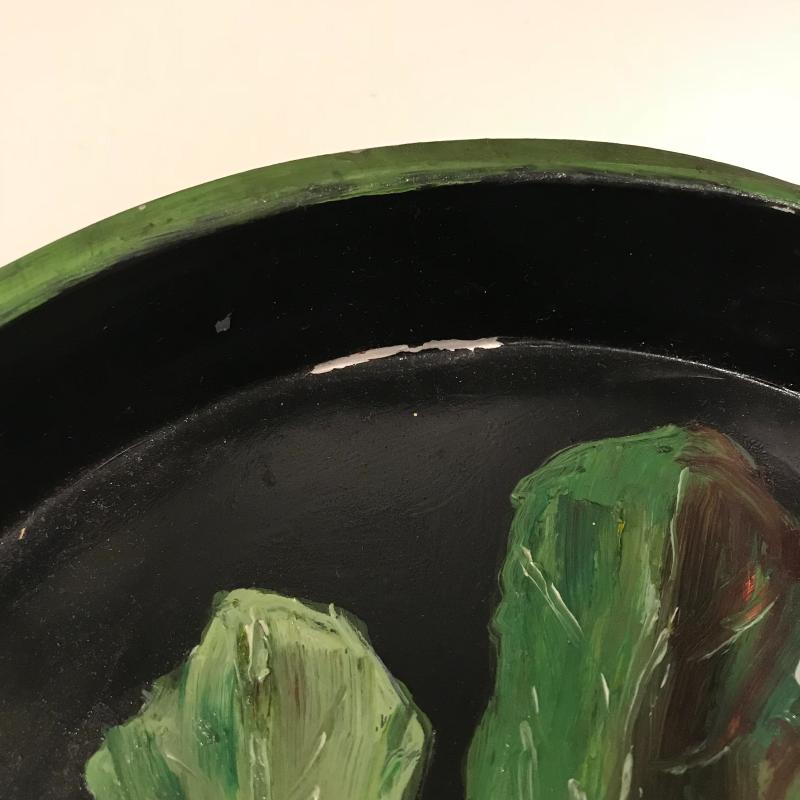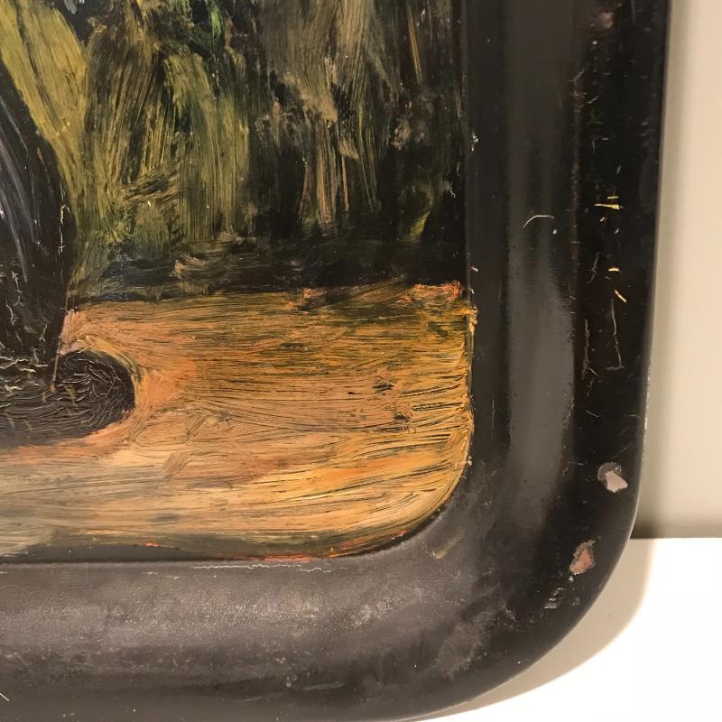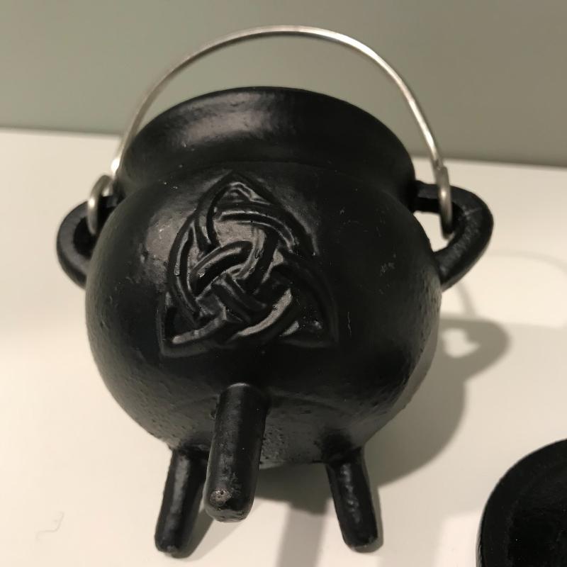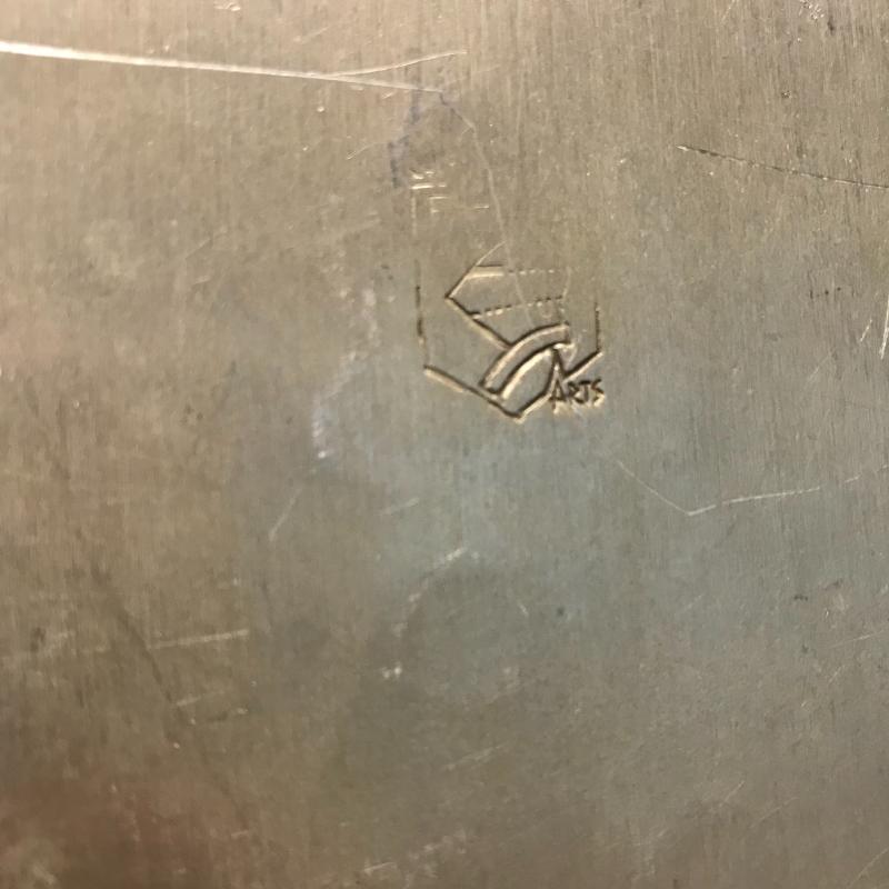 Five unique metal decorative trays, the largest black tray measures 24.5”x8.5”. Two silver trays have photos of markings. Two of the black trays are hand painted. Trays accompanied by a heavy mini witches’ cauldron with tag still on. Local pick up only.