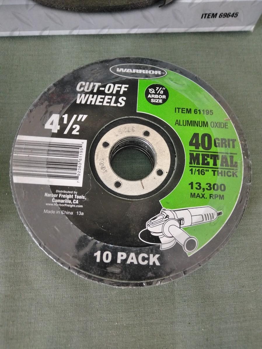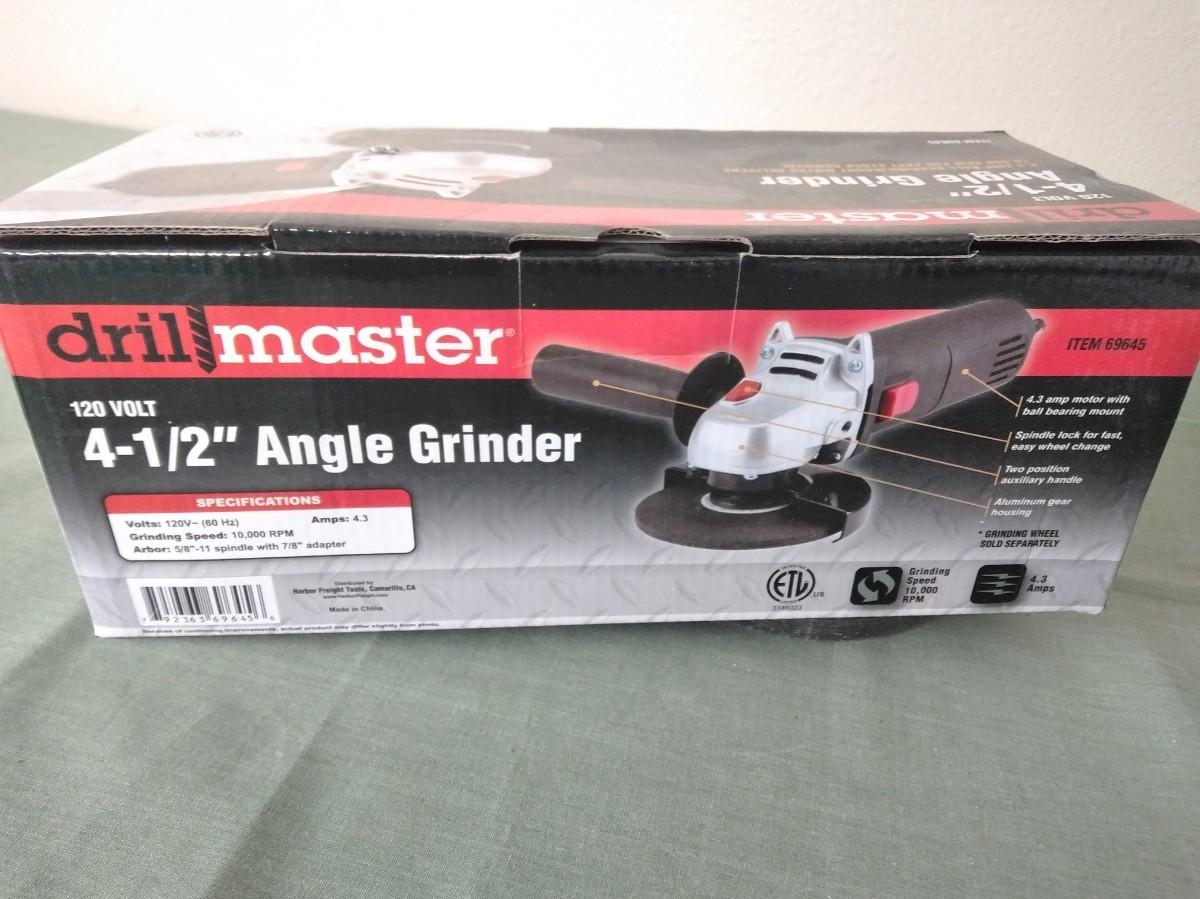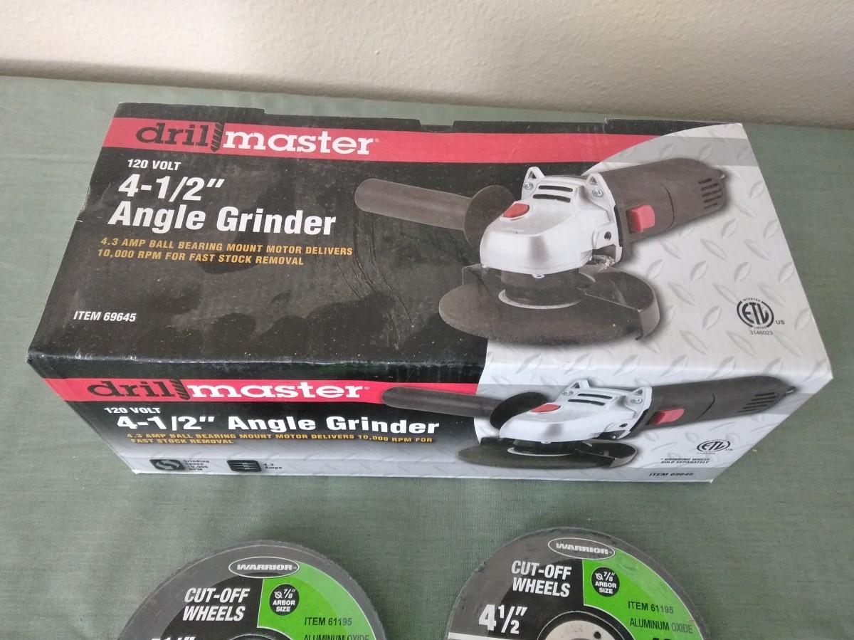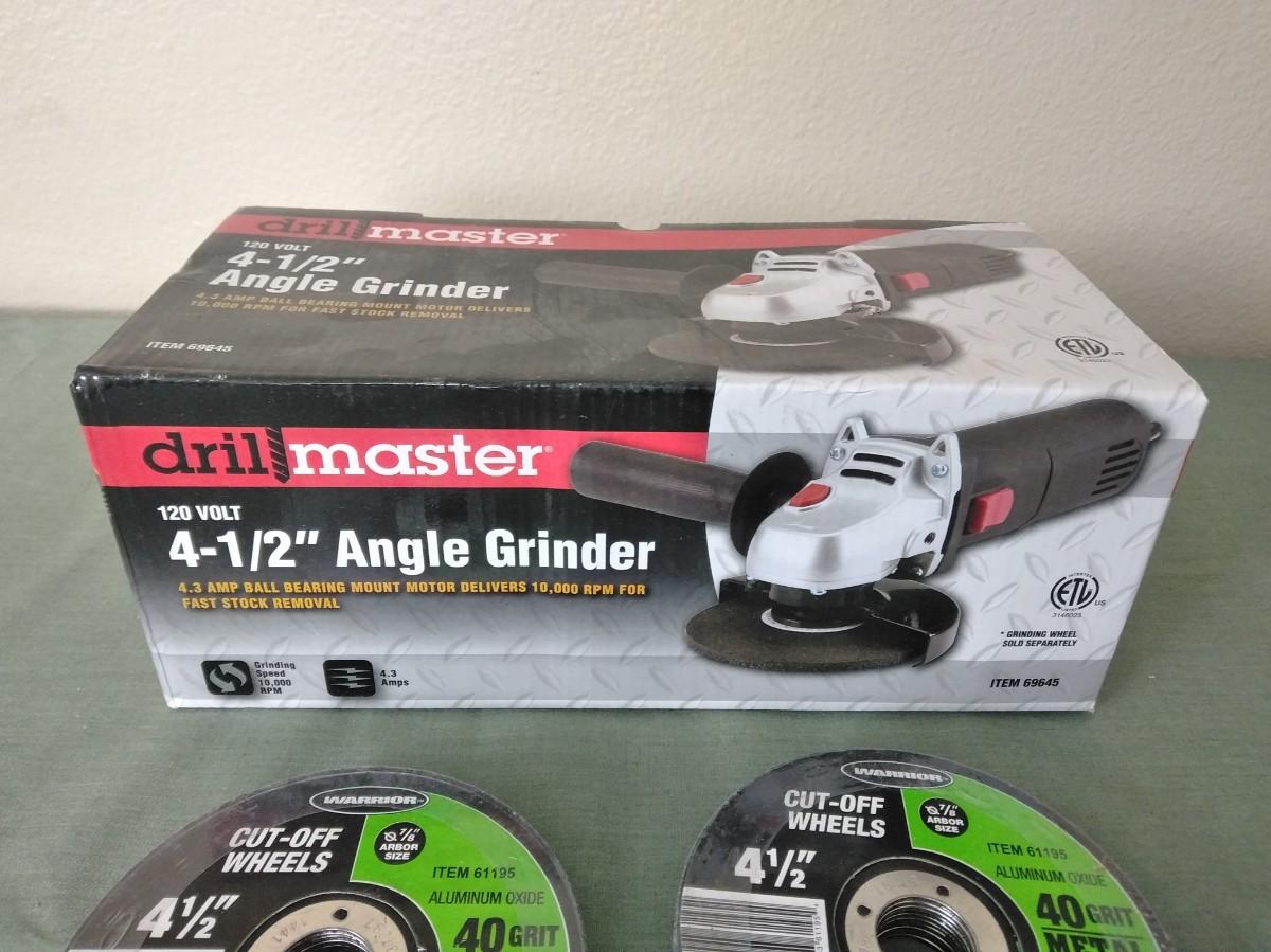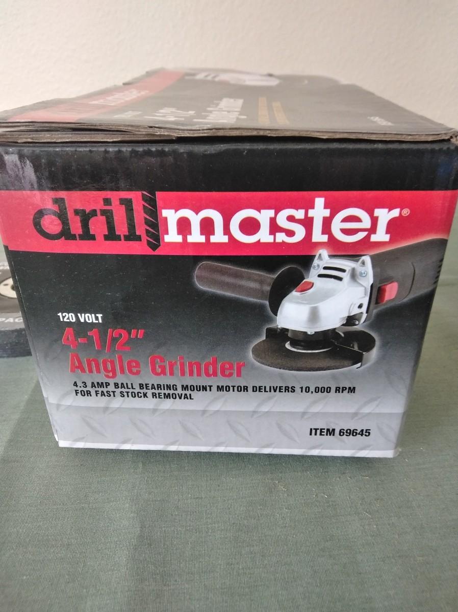 NEW DRILL MASTER 41/2" ANGLE GRINDER WITH EXTRA CUT OFF WHEELS.