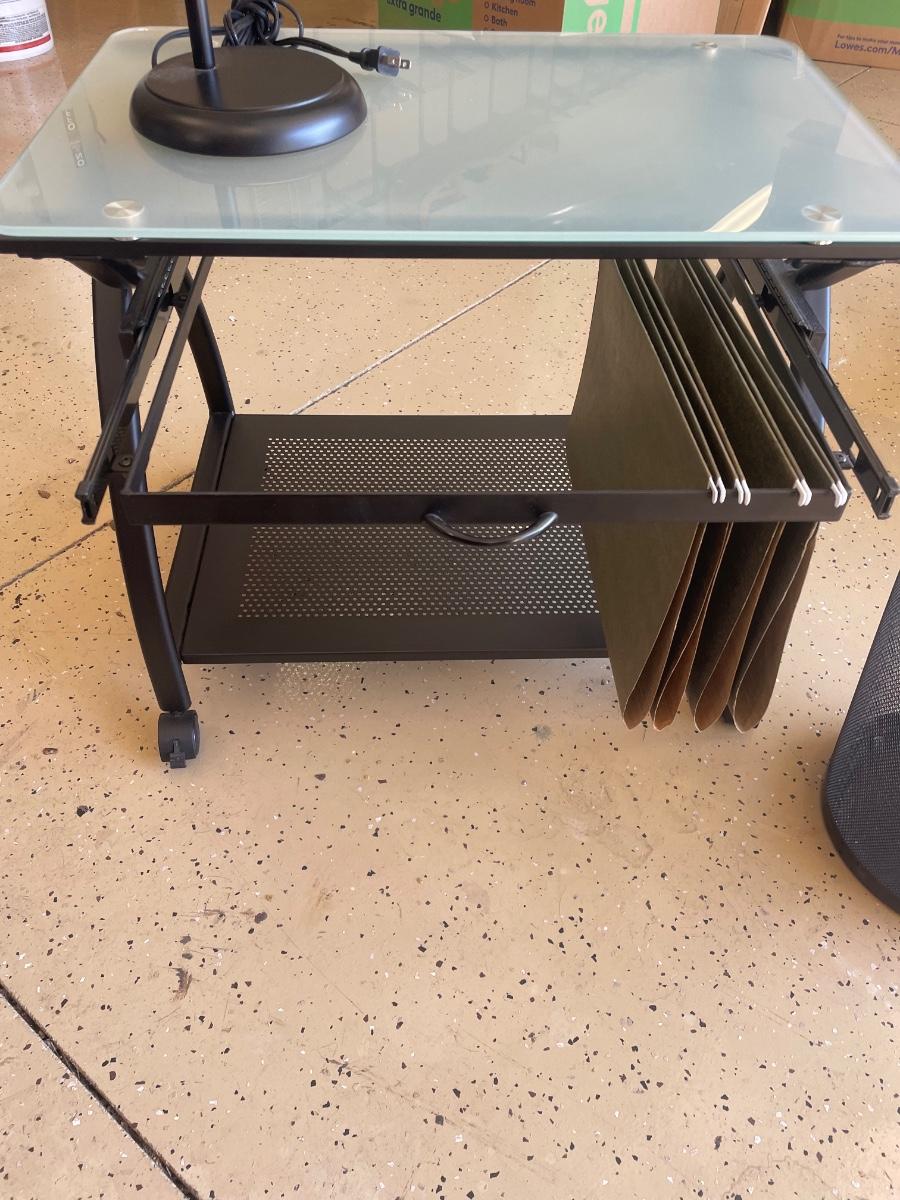 Glass-top low table has pull-out rack that holds hanging file folders, on casters