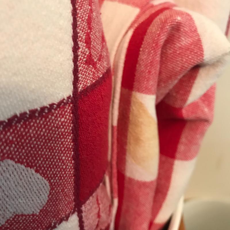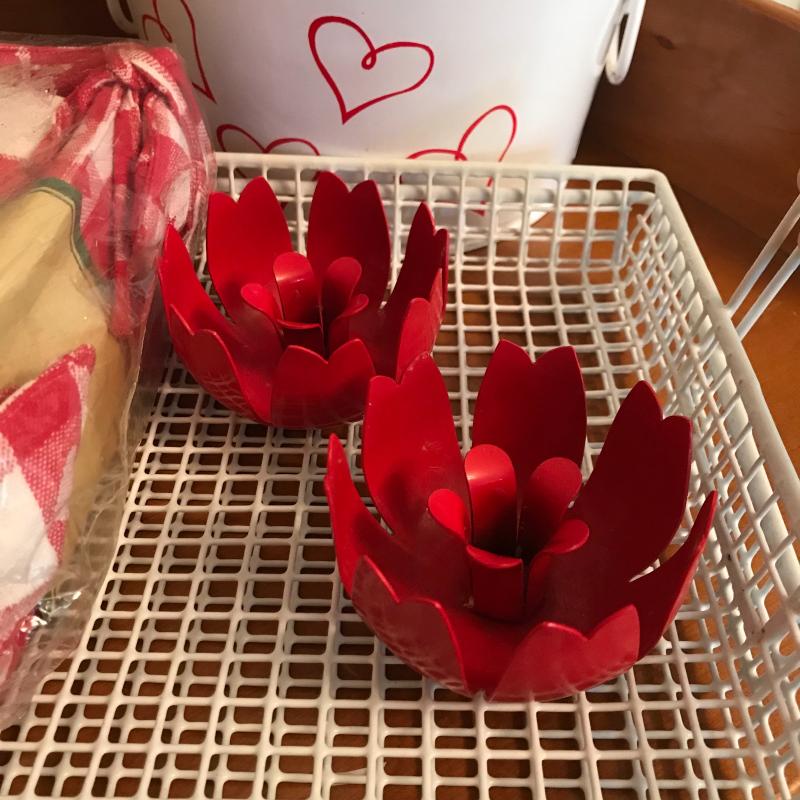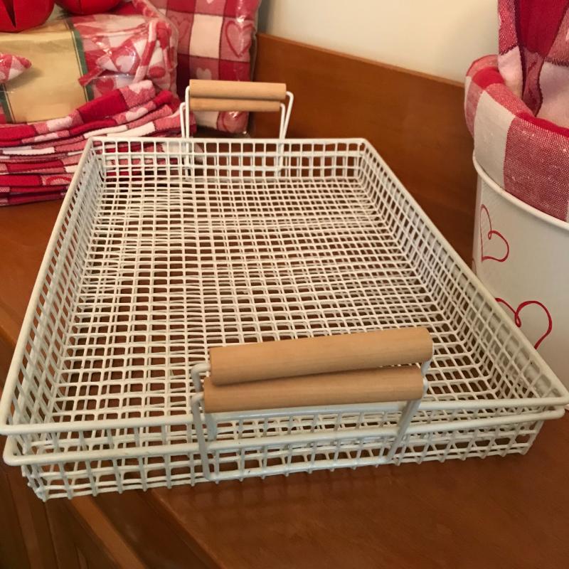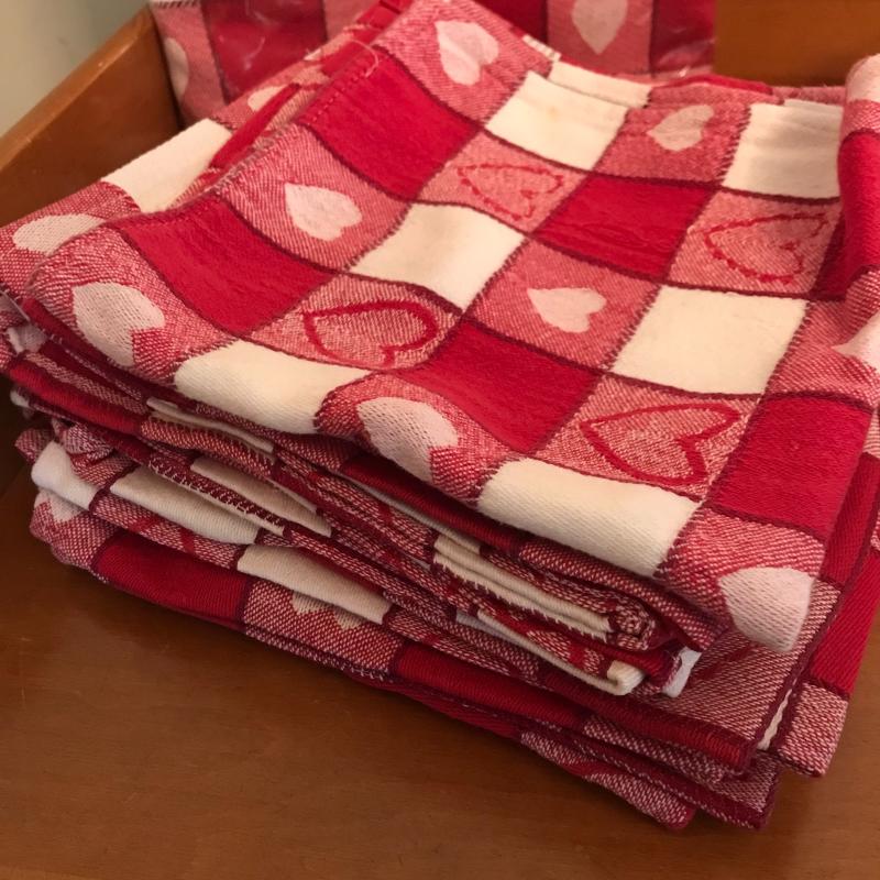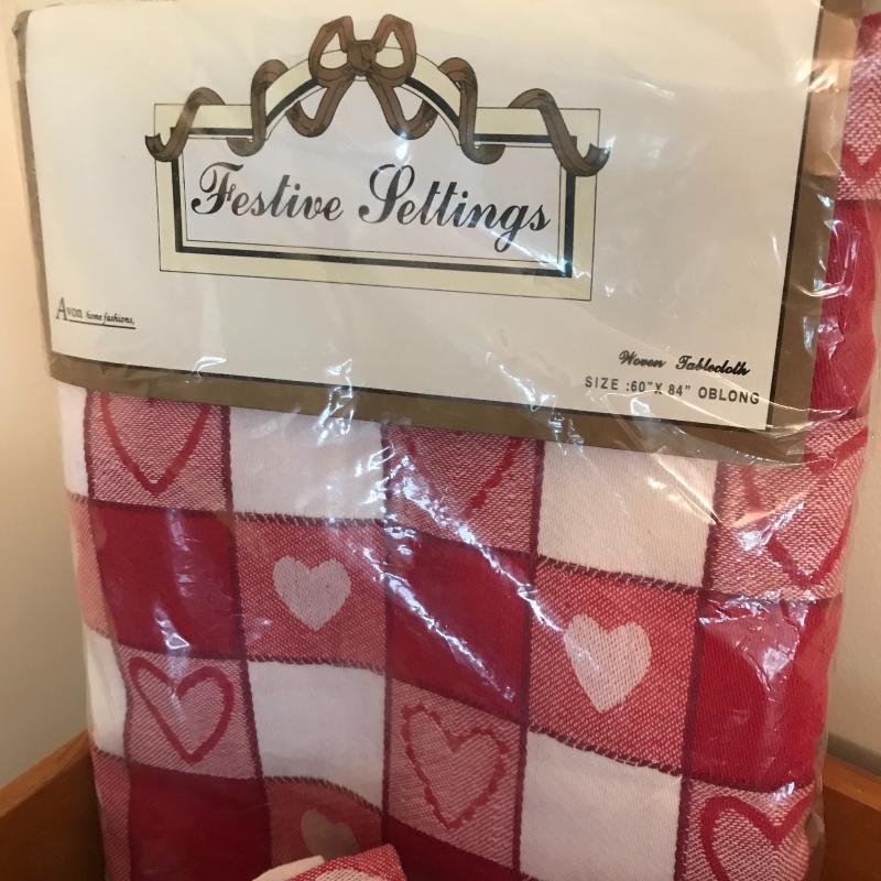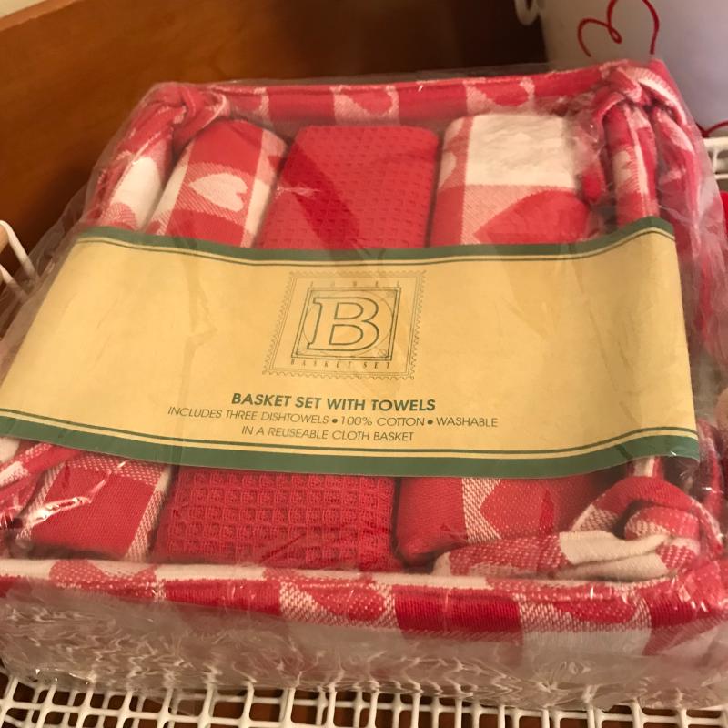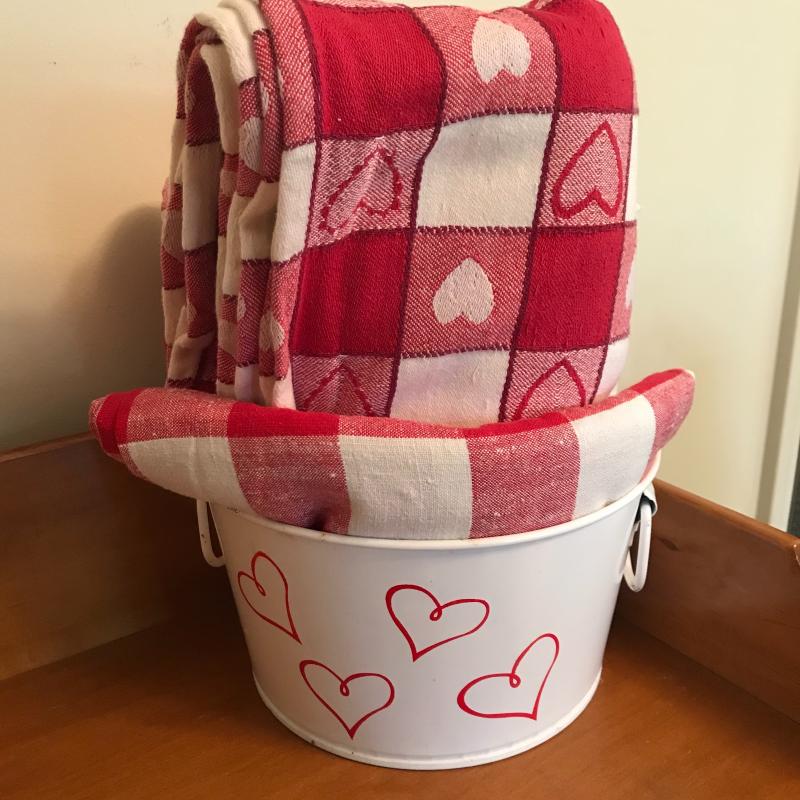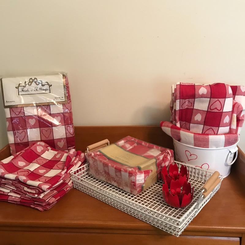 Coordinate your next picnic with these accessories! The white bucket measures approx. 9.5”d x 5.5”. Lot includes two white wire basket trays at 16” x 11.5”, two plain red and white tablecloths, 3 tablecloths with hearts (one still in package, unopened set of tea towels and 12 napkins. Local pick up only.