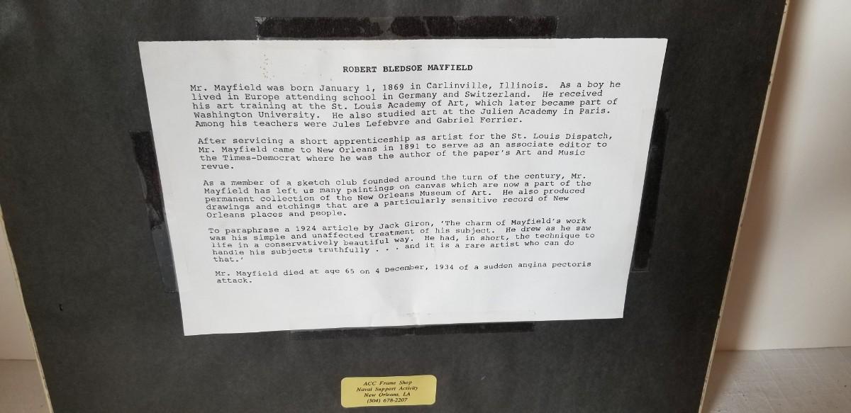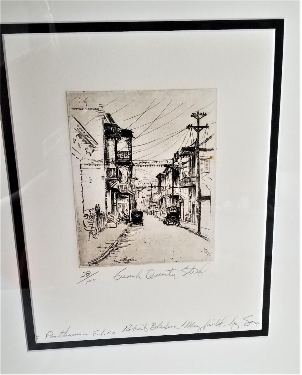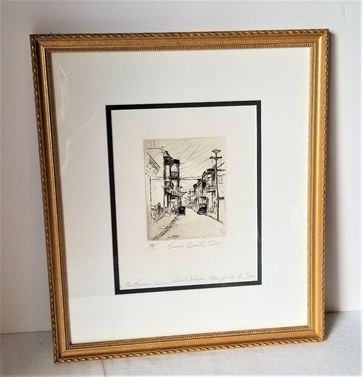 This is a posthumous edition of a Robert Bledsoe Mayfield etching (French Quarter street scene) reissued by his SON from the original plates. Pencil numbered 28/100. Mayfield is a listed New Orleans artist who died in 1934. Framed and matted - good condition.