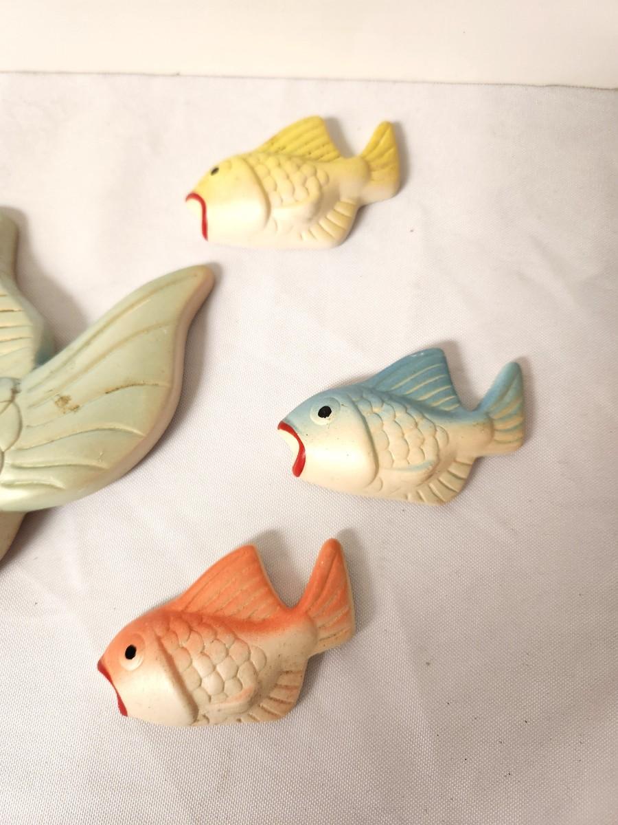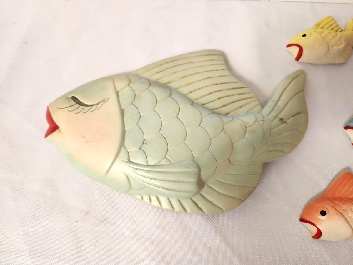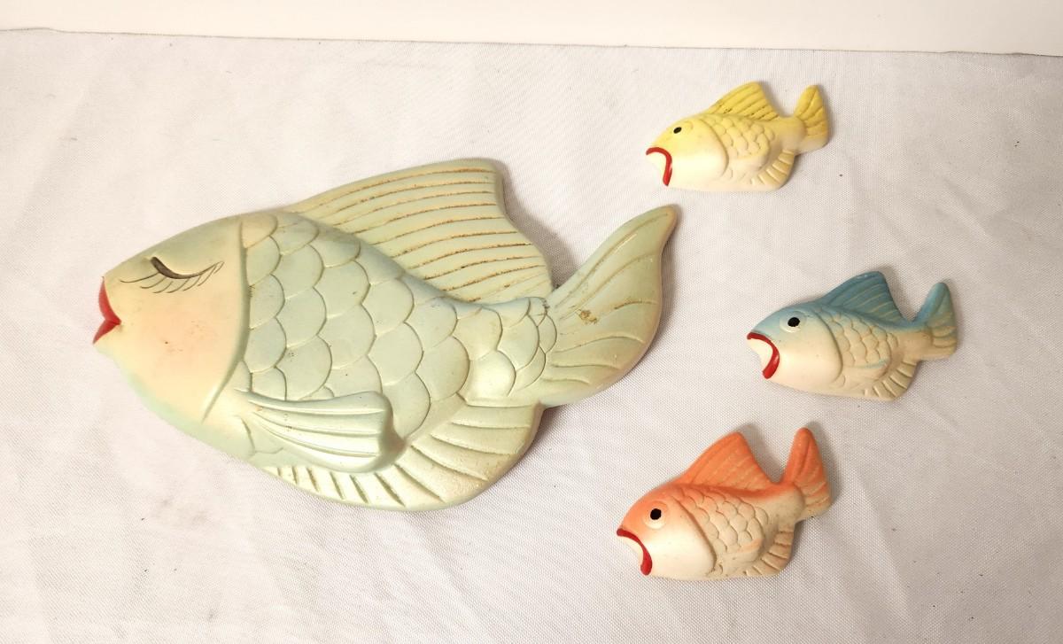 Cute MidCentury bathroom decoration - "school" of 4 fish - "Mama" and babies. Largest is 9" long - smaller ones are 3" long. Good vintage condition.