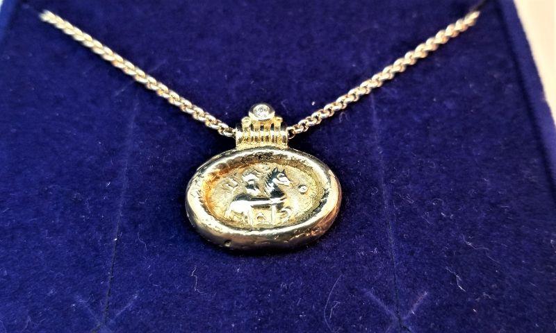 Chain can be set at 18" or 20" long. Sterling silver, set with an accent CZ, by Seiden Gang - known for turning ancient images into modern art. Etruscan style design featuring a rider on horseback.