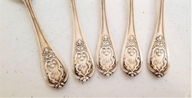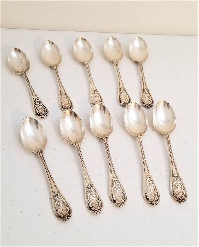 10 matching silverplate spoons - English hallmarks - each measures 5.5" long. Antique condition.