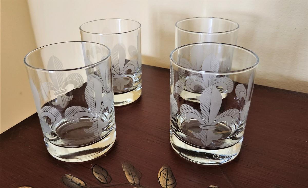 Mignon Faget double Old-Fashioned glasses with Fleur di Lis motif - a classic. Set of 4, no box. All in good condition.