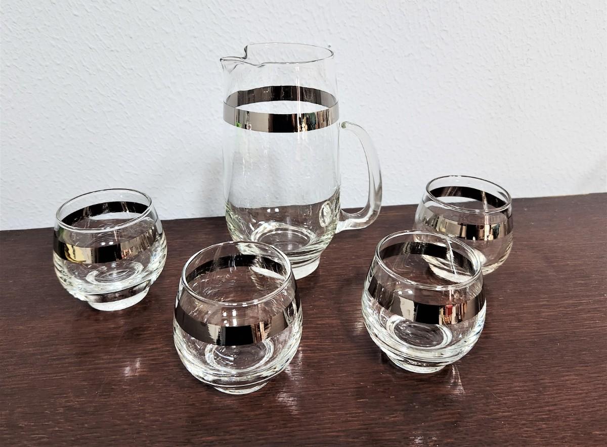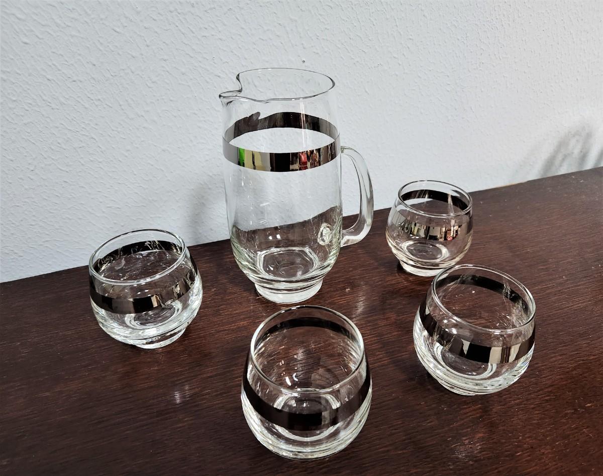 Cute MidCentury Modern bar set - 4 glasses - with matching pitcher. Clear with smoky metallic band at top. Pitcher is 6" tall, glasses 2.75" tall. Good condition.