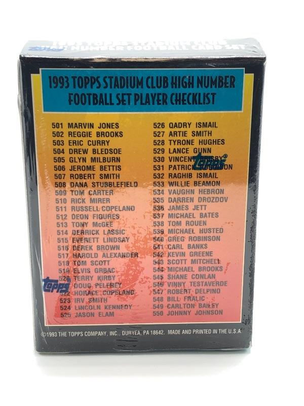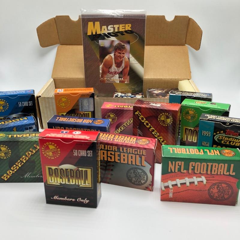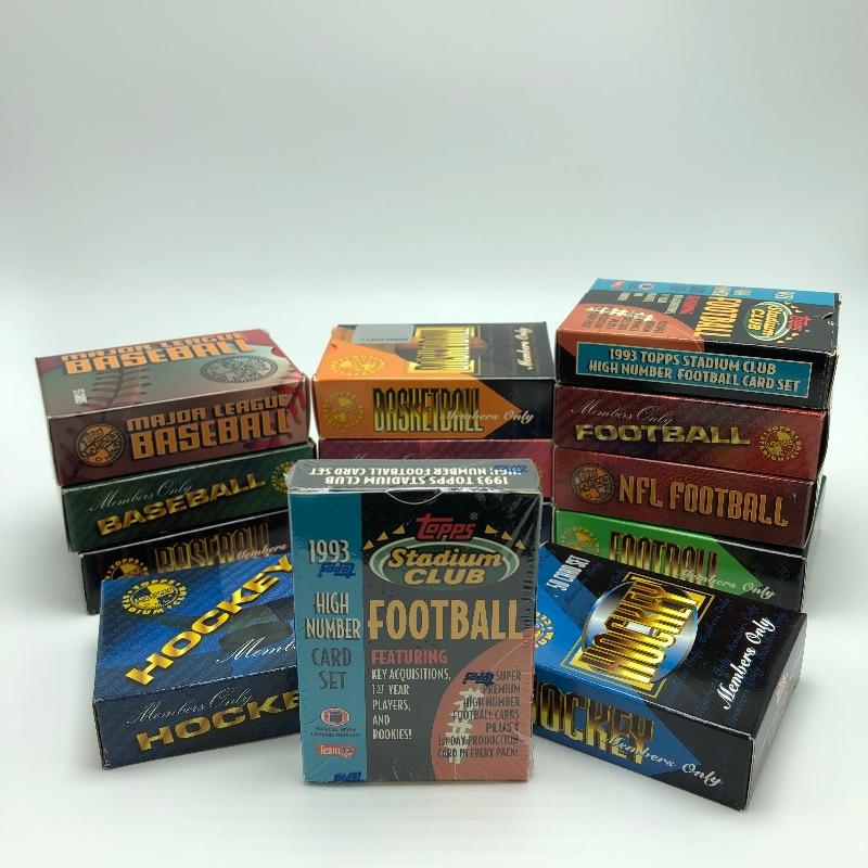This lot has an unopened box of Topps stadium club 1993 football cards and many Topps Stadium Club sets for baseball, football and basketball as well as a carton of mixed loose single cards. All have been opened except for the sealed 1993 football set.