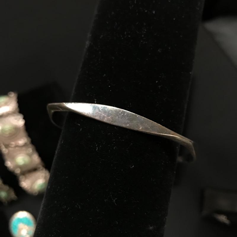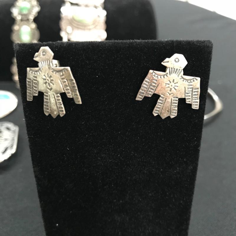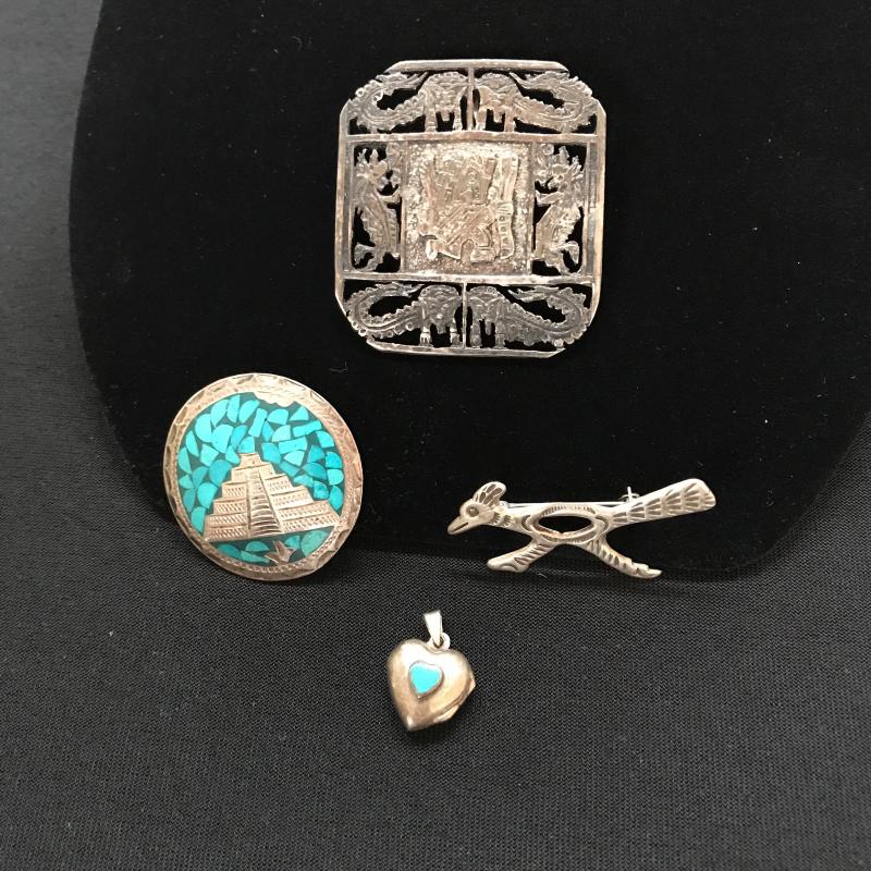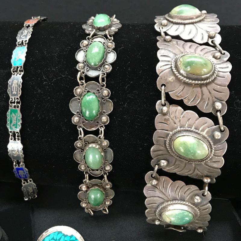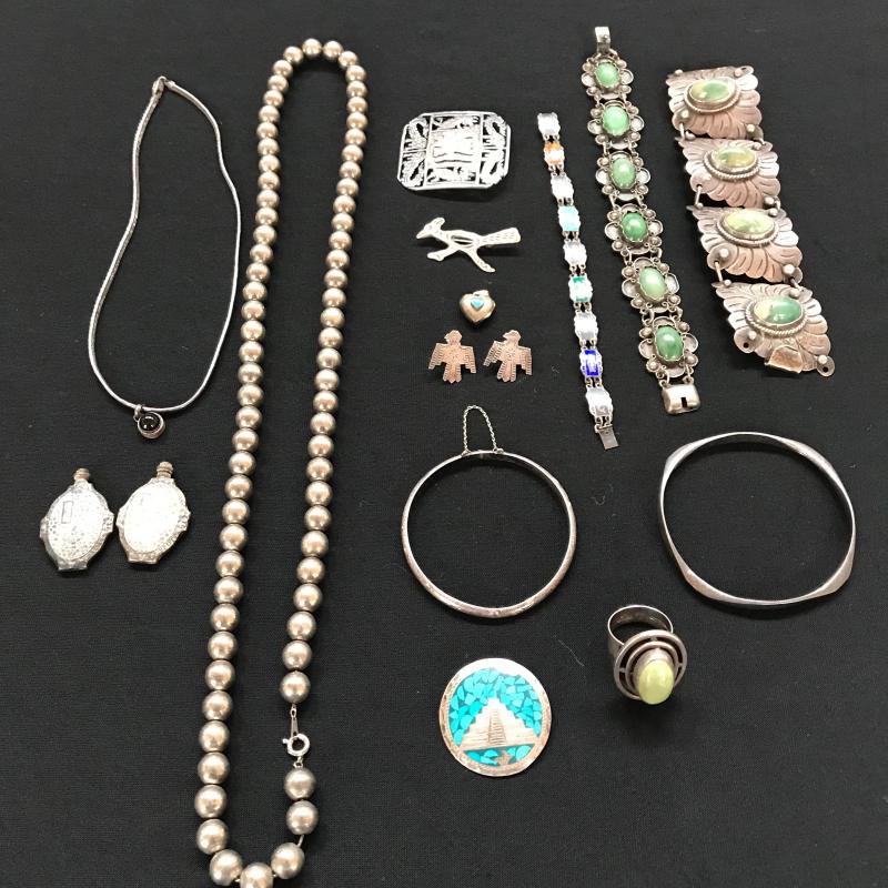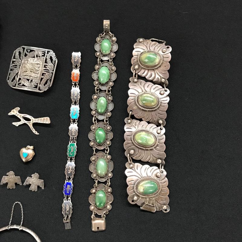 Stunning collection of jewelry, many pieces are marked with 925. Five bracelets, one ring, a pair of earrings, two necklaces, three pins, a small heart shaped locket and two vintage perfume cases. Some have gorgeous green and blue accents and stones. See photos, shipping available.