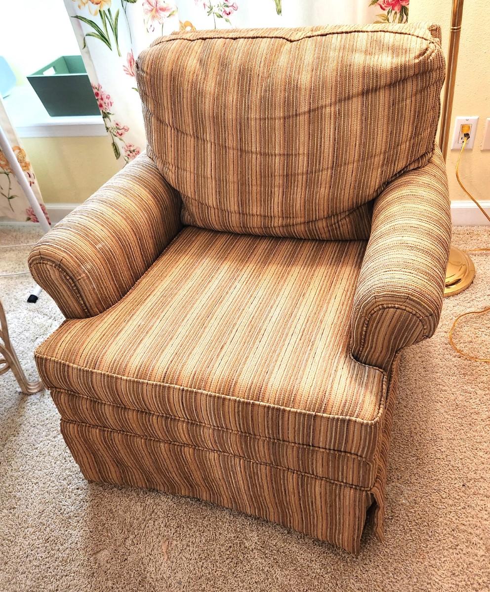 Comfy Striped Upholstered armchair - swivels - Clean. 26" wide, 30" deep, 31" tall.