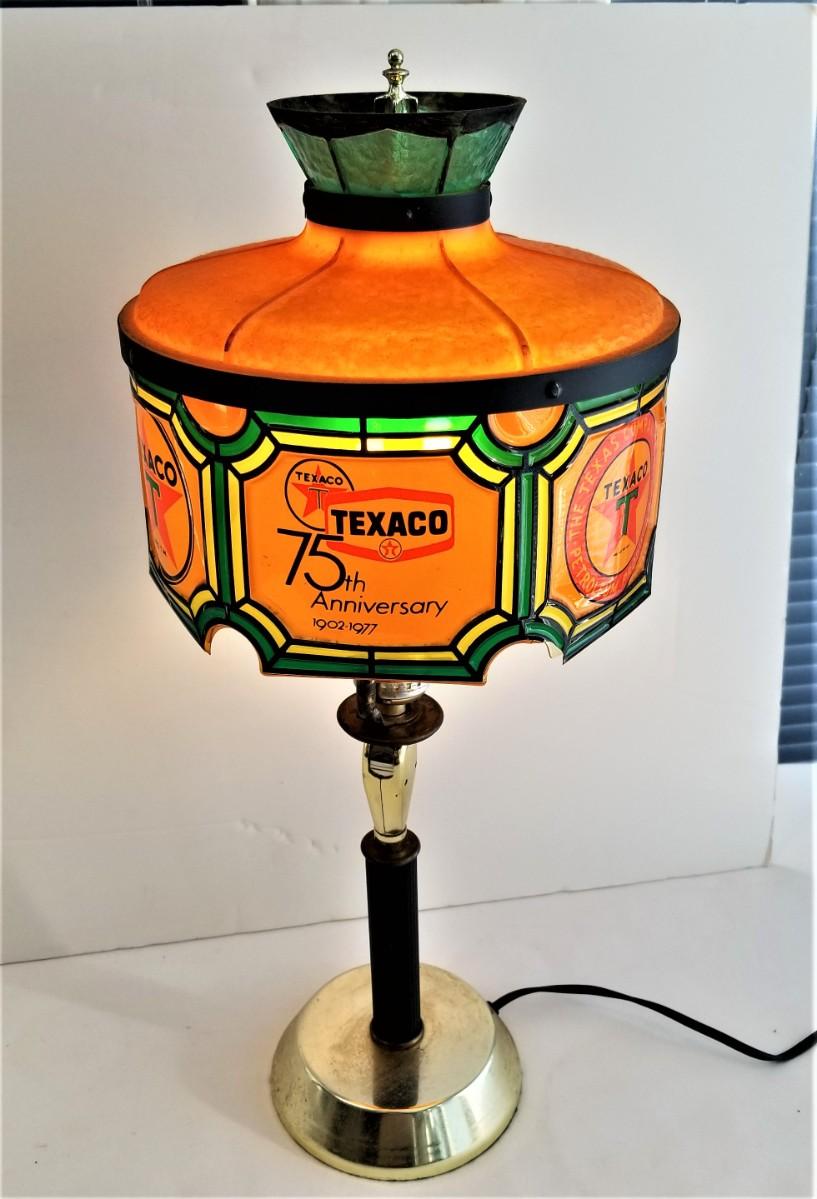 Cool Texaco 75th Anniversary Commemorative table Lamp - works - plastic shade. Dated 1902-1977 - 20" tall. Vintage condition.