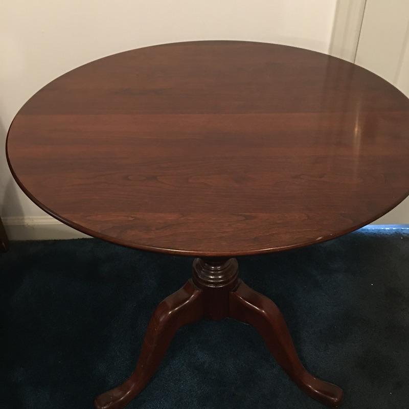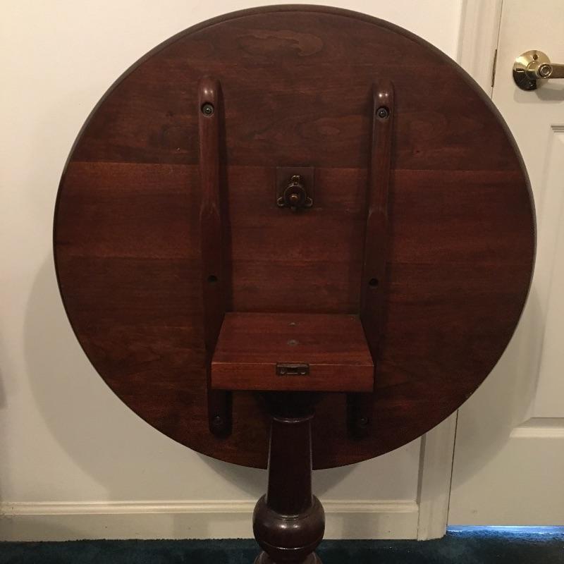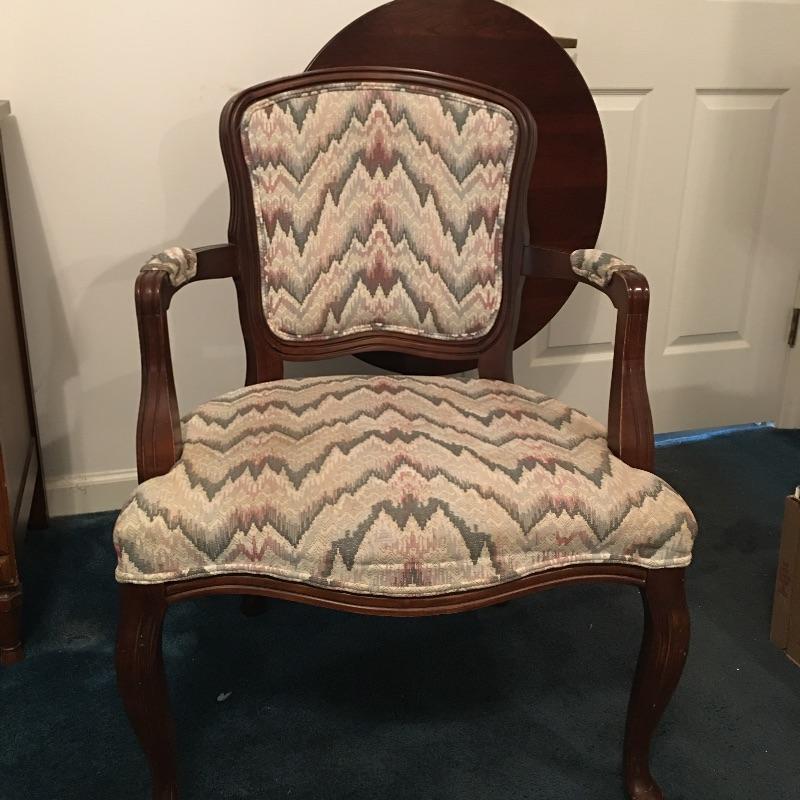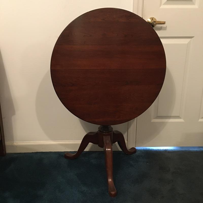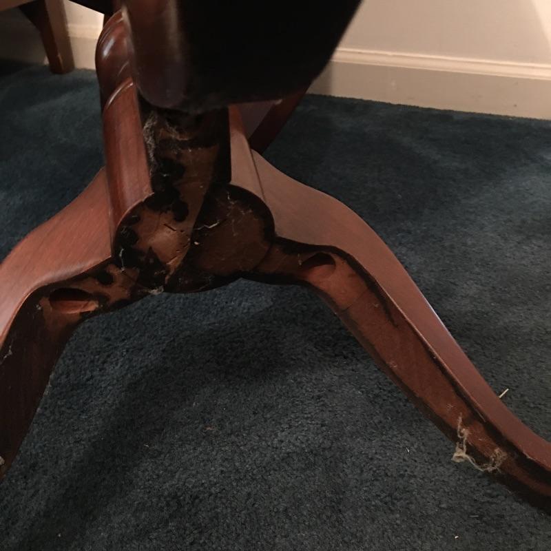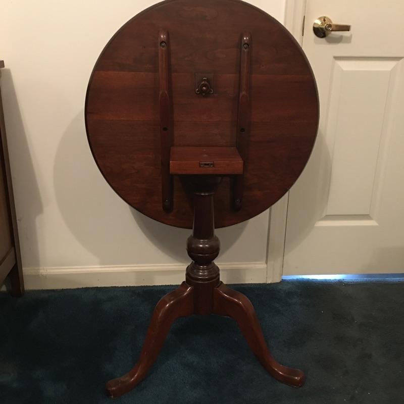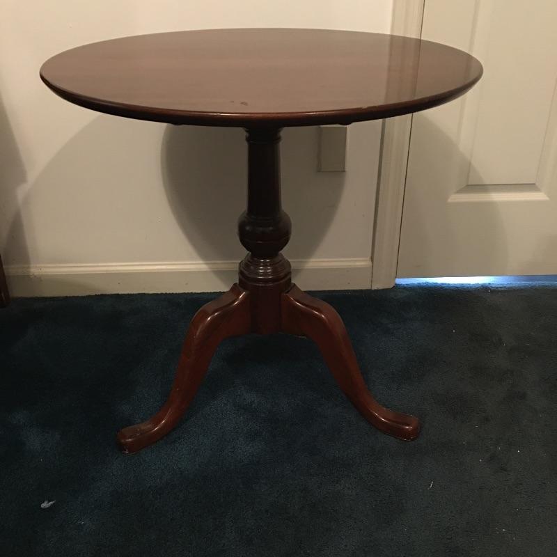 Save space with this wooden tripod tilt tea table in a lovely deep color with a wooden and fabric armchair. Table has small scratches that are on top, but aren’t showing up in the pictures unless you zoom in to the final image.