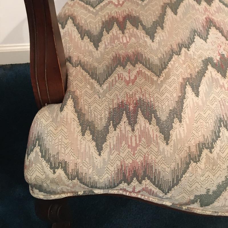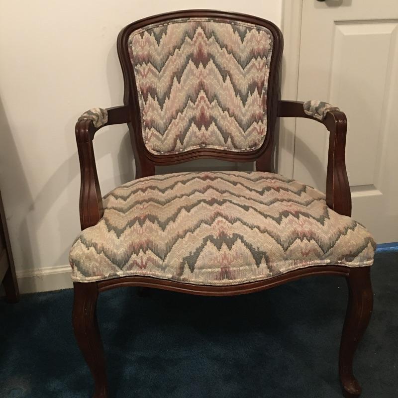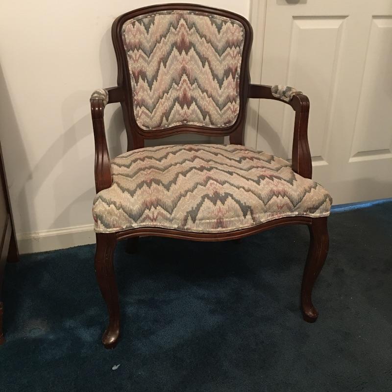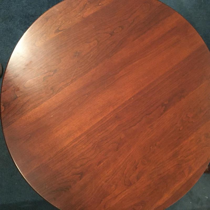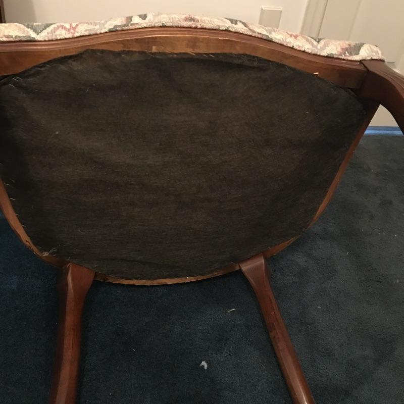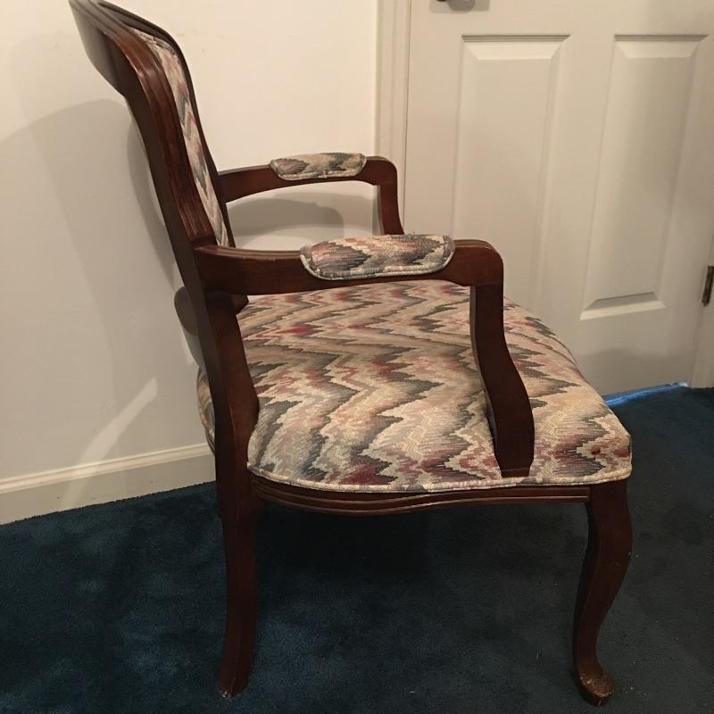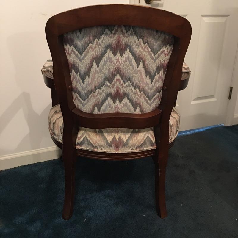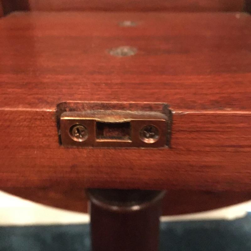 Save space with this wooden tripod tilt tea table in a lovely deep color with a wooden and fabric armchair. Table has small scratches that are on top, but aren’t showing up in the pictures unless you zoom in to the final image.