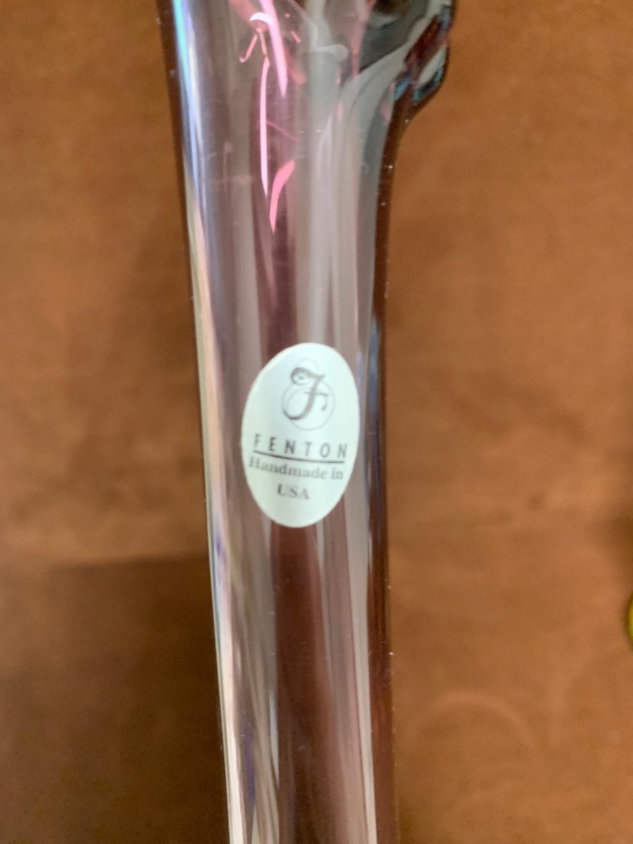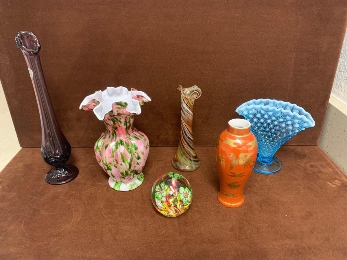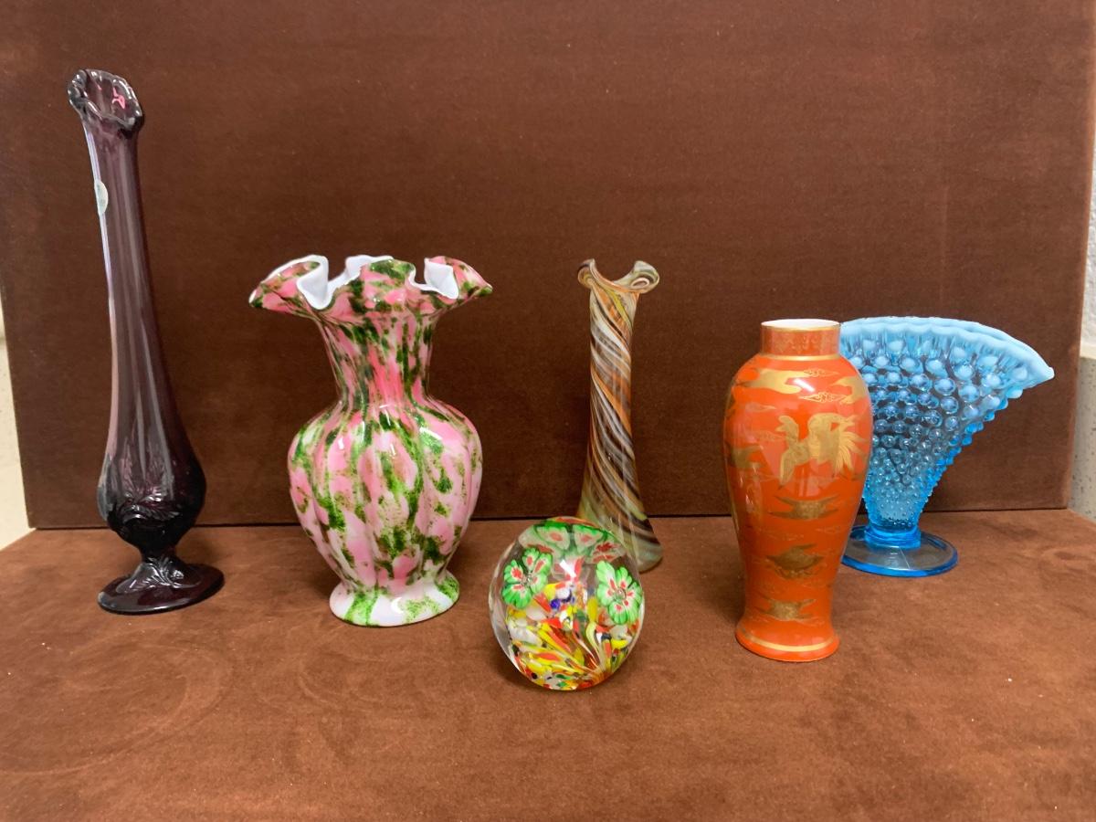 Fenton blue hobnail fan vase, Fenton purple footed stretch vase w/label, two blown glass vases and a paperweight