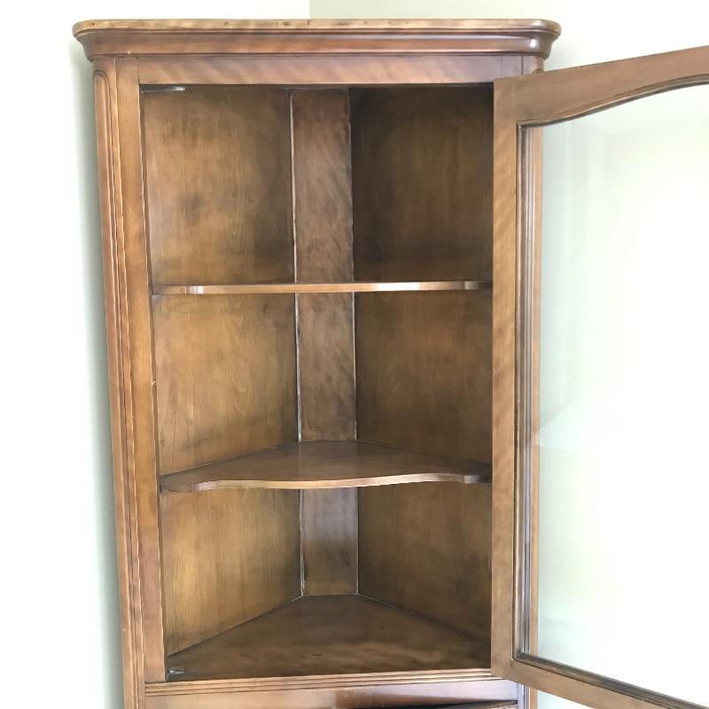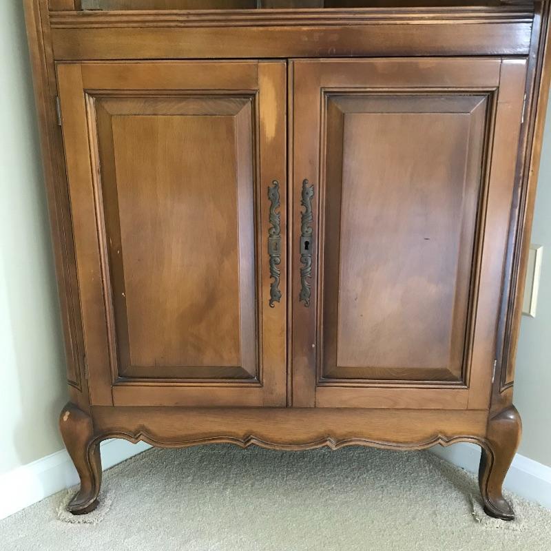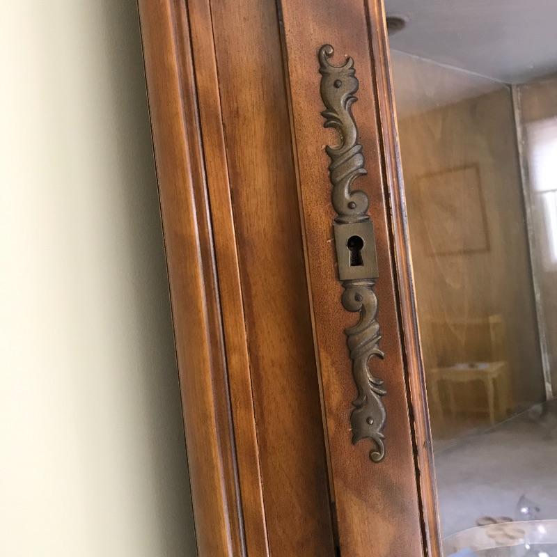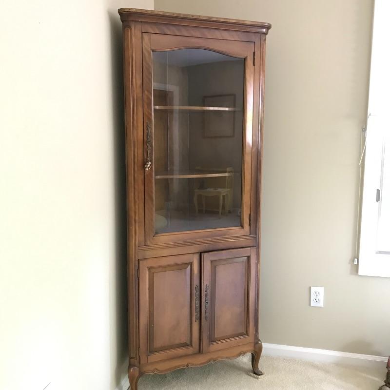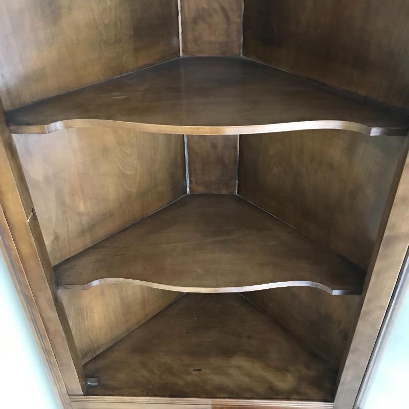Beautifully crafted tall wooden corner cabinet with a skeleton key. Cabinet has a lovely medium color and simple yet stunning craftsmanship. The back panels appear to have separated slightly, it is noticeable from the front when the glass panel door is open, but appears to be an easy fix. Other blemishes are noted in photos, piece is overall in very nice condition measuring 27” x 70” with the back corner panels each 17” wide. The cabinet appears to lean forward slightly when it was moved. It is unclear if the leaning is from the carpet underneath or if the rear foot need more support. Piece is sturdy when placed in corner. Please bring help to load, cabinet is on the second floor. No shipping.