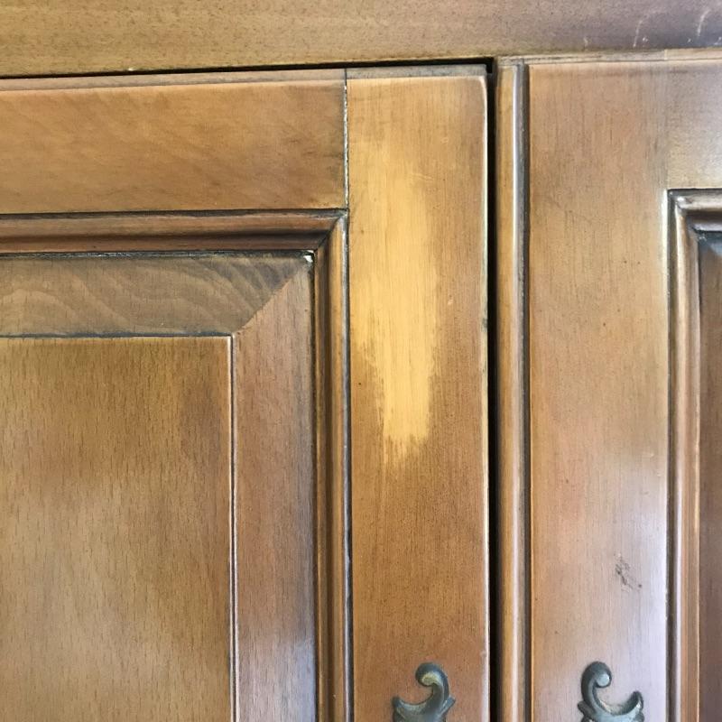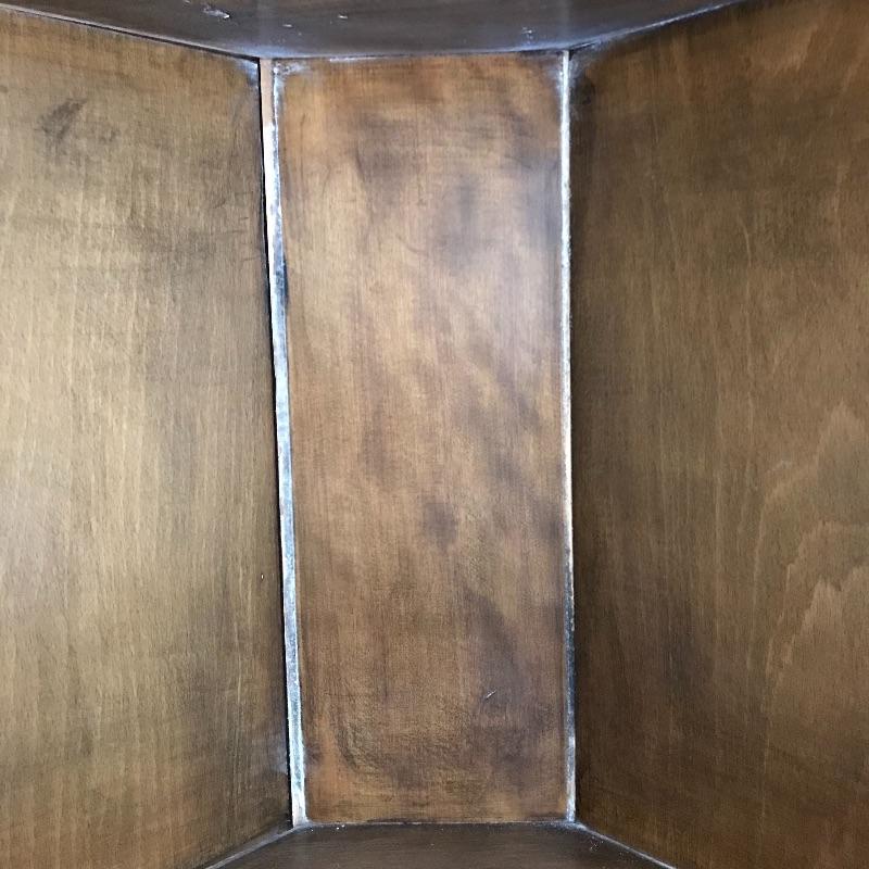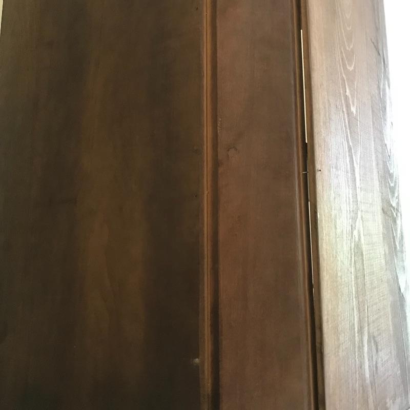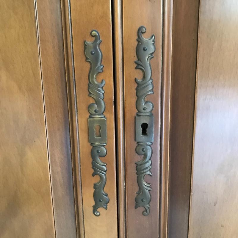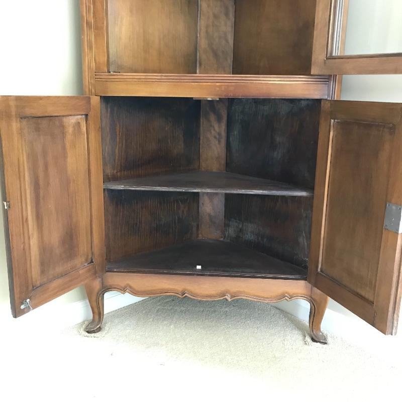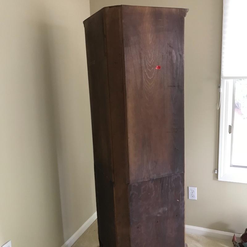 Beautifully crafted tall wooden corner cabinet with a skeleton key. Cabinet has a lovely medium color and simple yet stunning craftsmanship. The back panels appear to have separated slightly, it is noticeable from the front when the glass panel door is open, but appears to be an easy fix. Other blemishes are noted in photos, piece is overall in very nice condition measuring 27” x 70” with the back corner panels each 17” wide. The cabinet appears to lean forward slightly when it was moved. It is unclear if the leaning is from the carpet underneath or if the rear foot need more support. Piece is sturdy when placed in corner. Please bring help to load, cabinet is on the second floor. No shipping.
