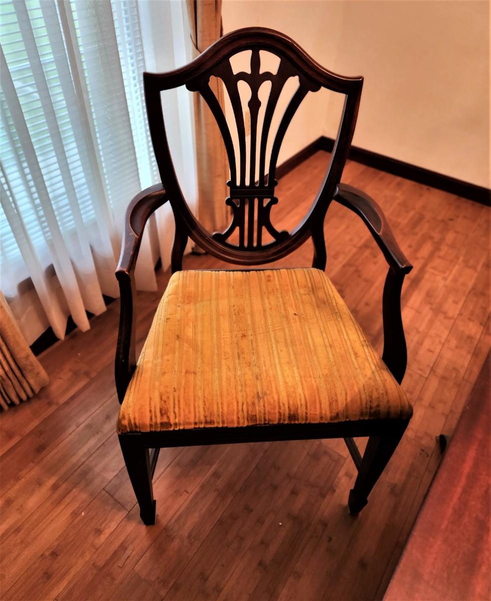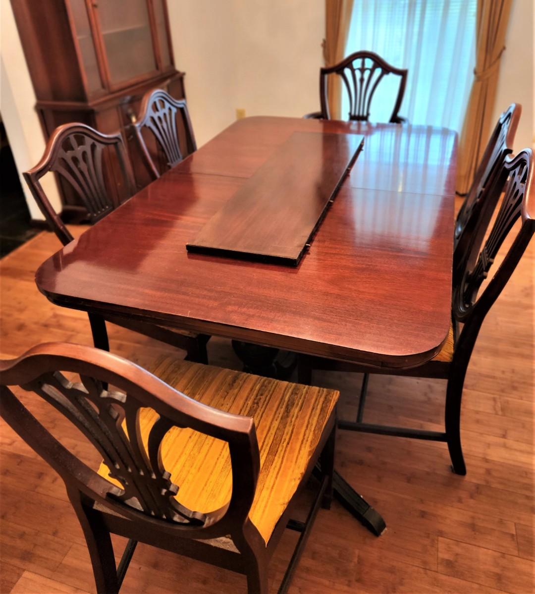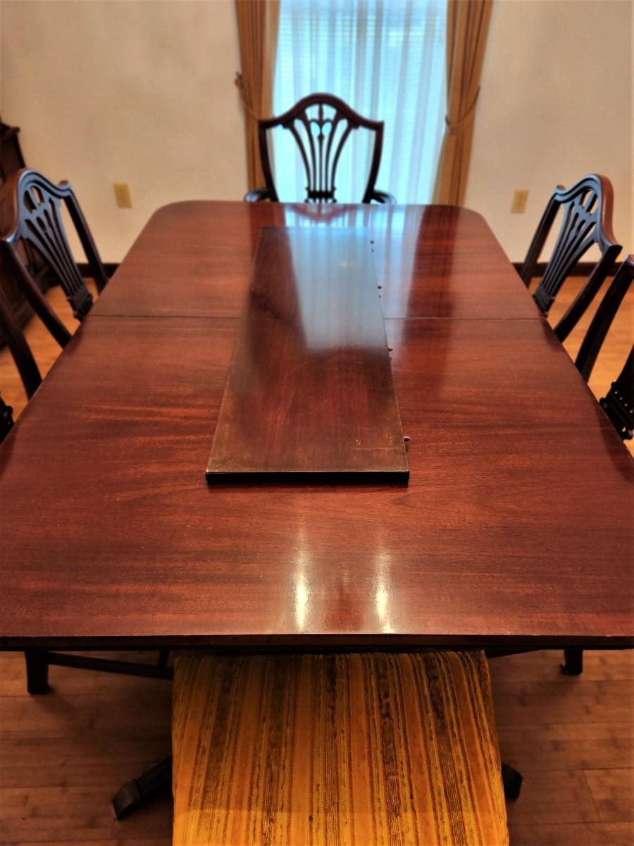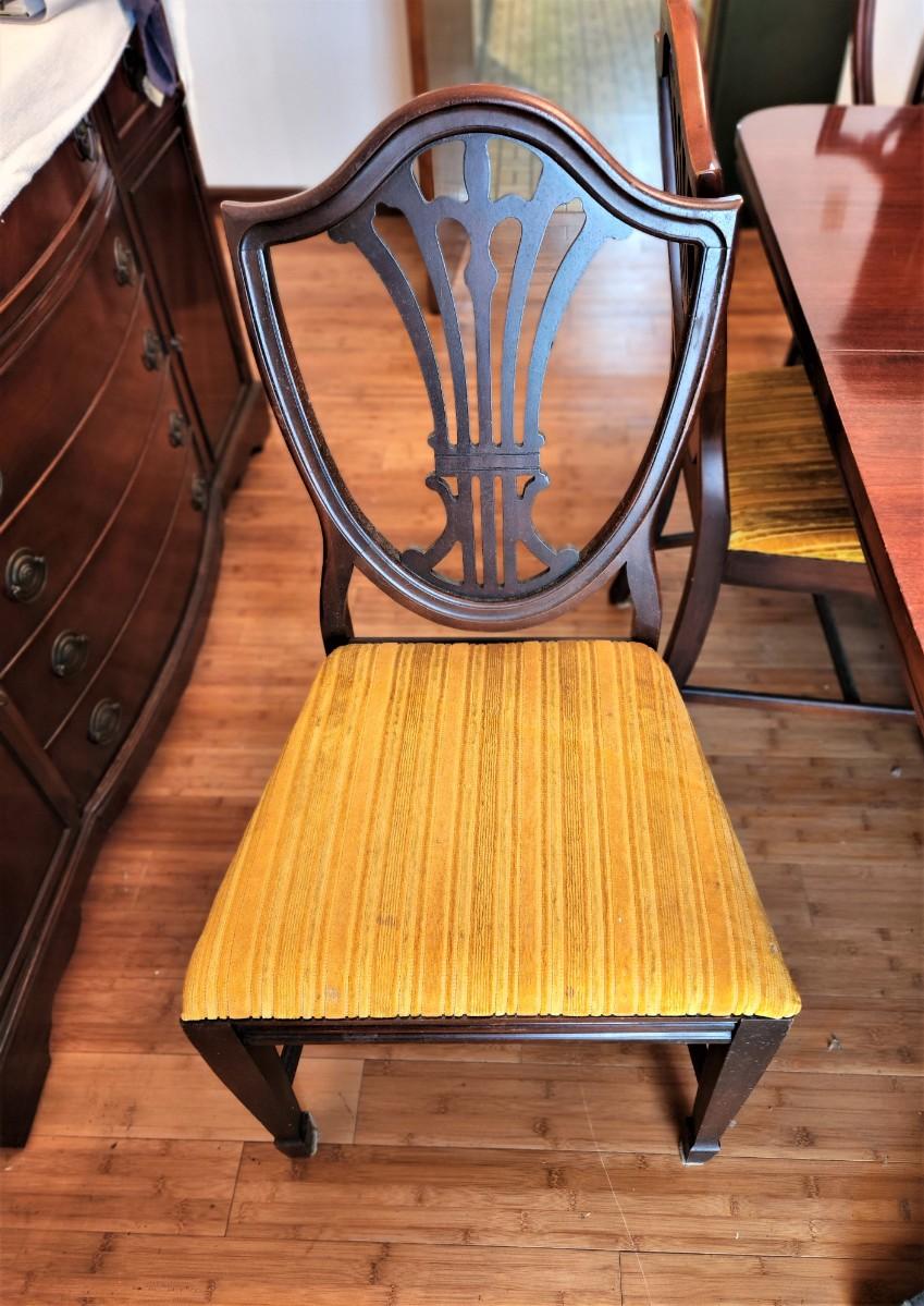 Mahogany finish table with 6 shield back chairs - table has one extra leaf and comes with table pads. Table is 5 feet long with no leaf, 40" across, 30" tall. Chairs are 22" wide, 19" deep and 39" tall at the back. No maker noted. All in decent vintage condition. Typical 70's fabric on the chairs but these can be easily redone.
