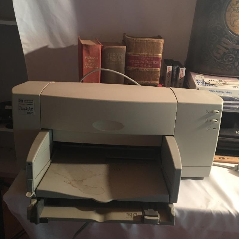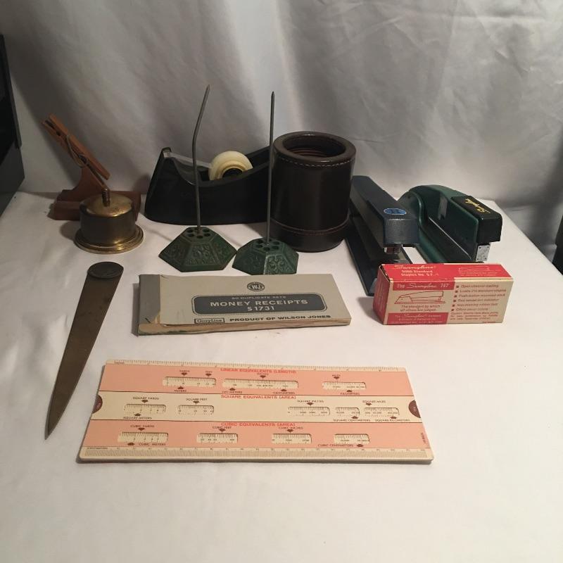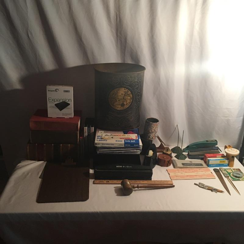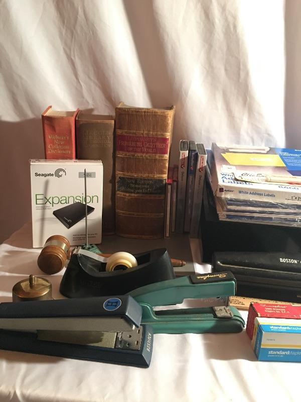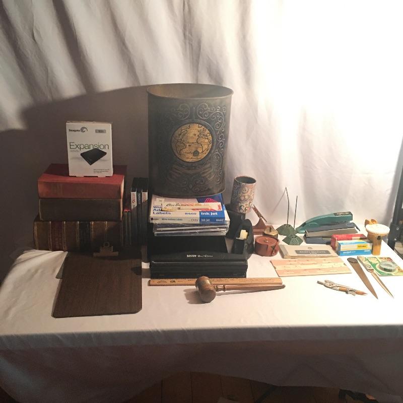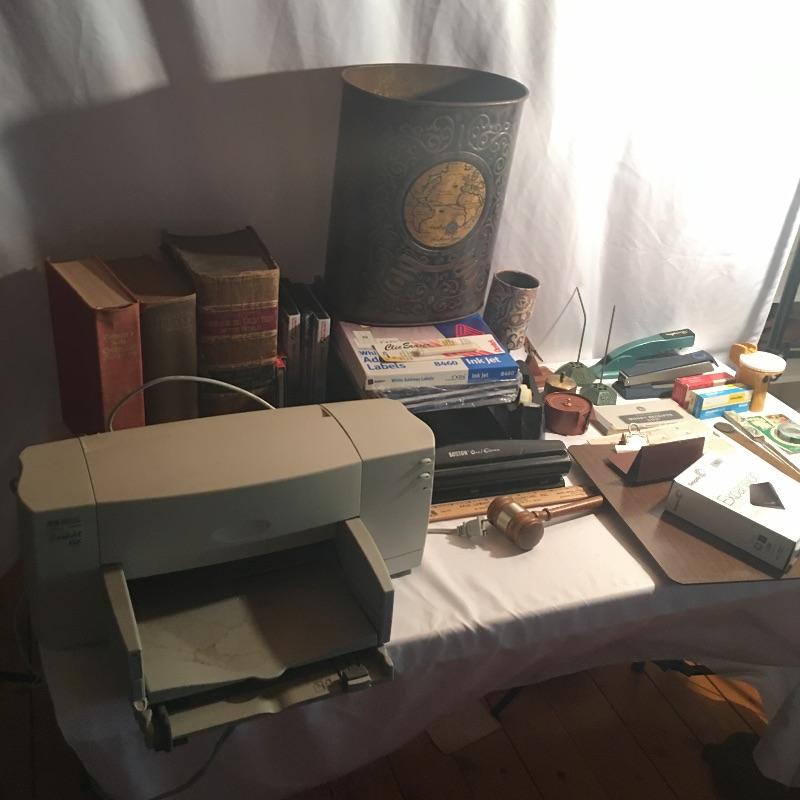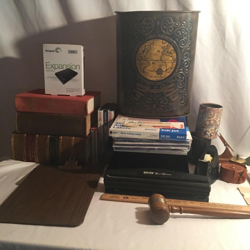 This lot has a great assortment of old and new office supplies that includes Lippincotts Pronouncing Gazetteer of the World 1880, two staplers Scotch tape dispenser, pair of clipboards, two letter openers, HP Deskjet 812C printer, brass stamp holder, Seagate 1 TB portable drive, paper tray two wastebaskets and more. Wastebasket has rusted bottom, see pictures. Printer powered on when tested.