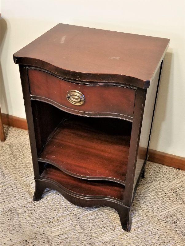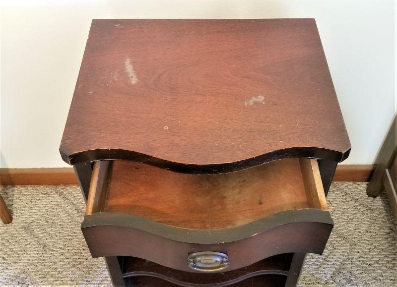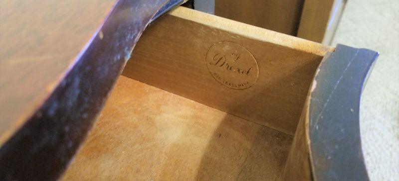 Vintage nightstand - probably 1940's or so. Marked Drexel. Has drawer and shelves. 28" tall, 18" x 15". Matches another piece in the sale. Used condition with age-related dings, etc. as shown.