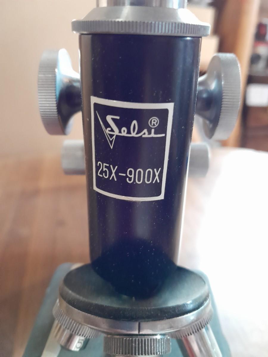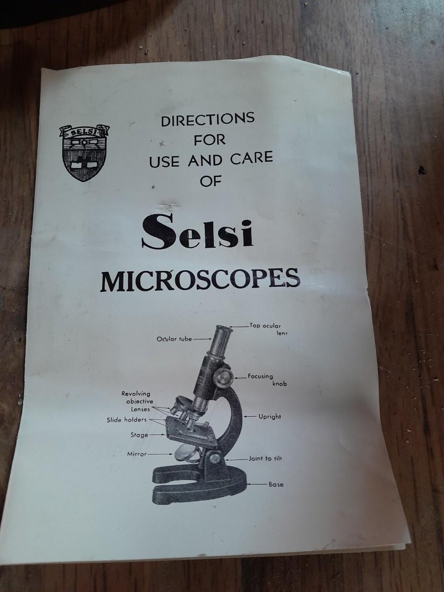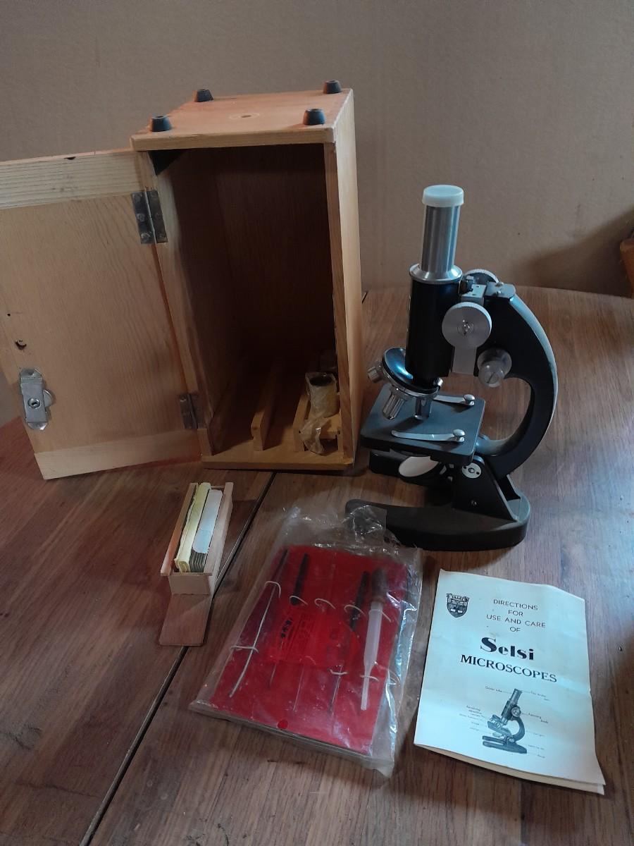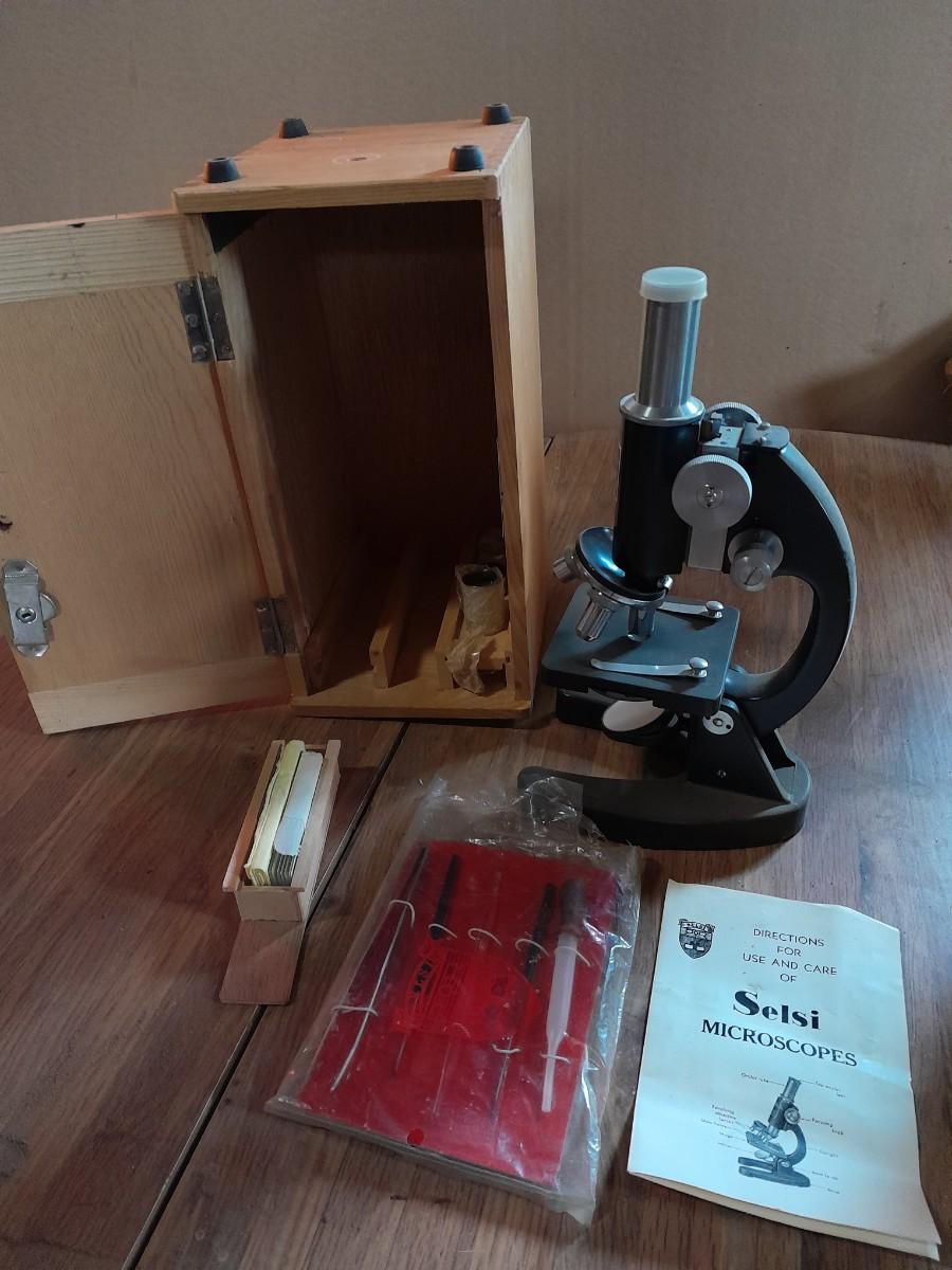 VINTAGE SELSI 25X -900X MICROSCOPE WITH WOODEN STORAGE BOX, SLIDES, INSTRUCTIONS, AND SMALL TOOLS