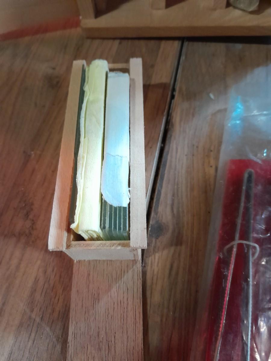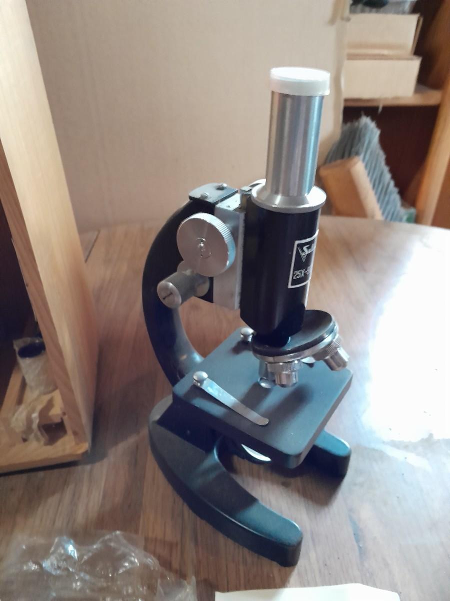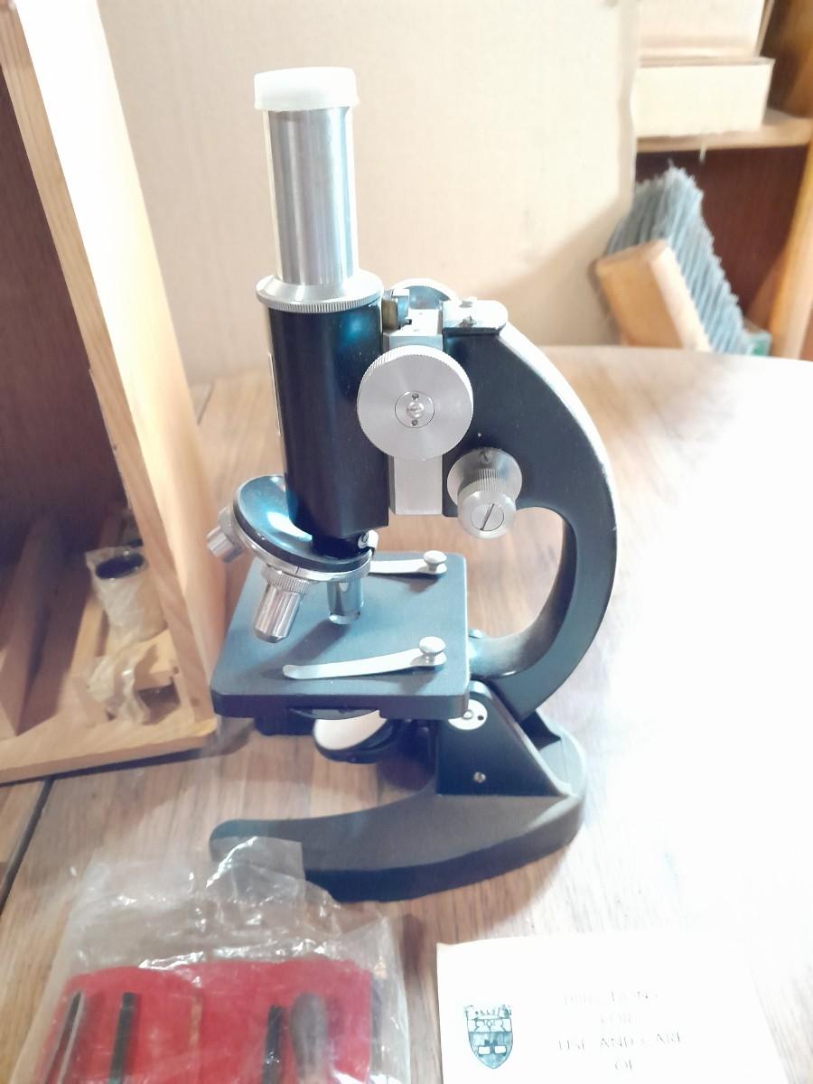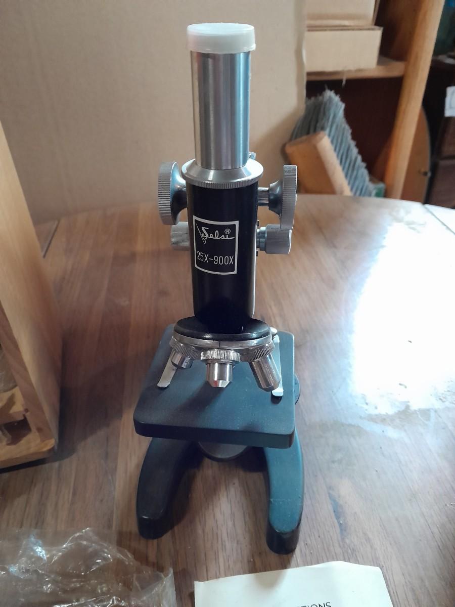 VINTAGE SELSI 25X -900X MICROSCOPE WITH WOODEN STORAGE BOX, SLIDES, INSTRUCTIONS, AND SMALL TOOLS